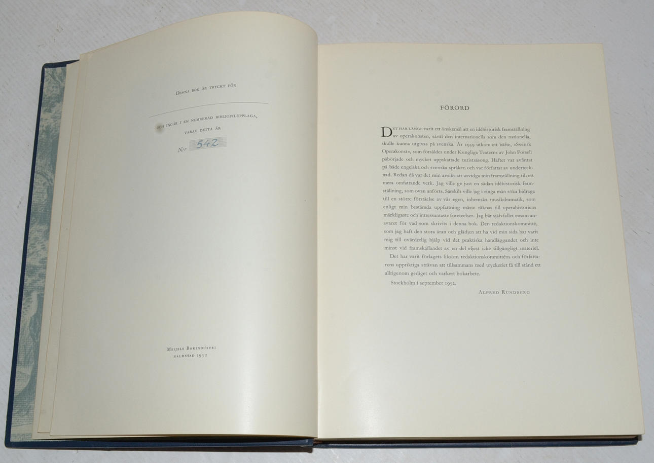 Culture and Form, Stockholm, 1952. 4: o. 567, (1) p. Profusely illustrated with photographs, portraits and sheet music examples. Numbered bibliographic edition; this is number 542. The publisher's blue, decorated full-leather binding with full gold trim and sparsely gold-decorated spine with five marked bindings.
