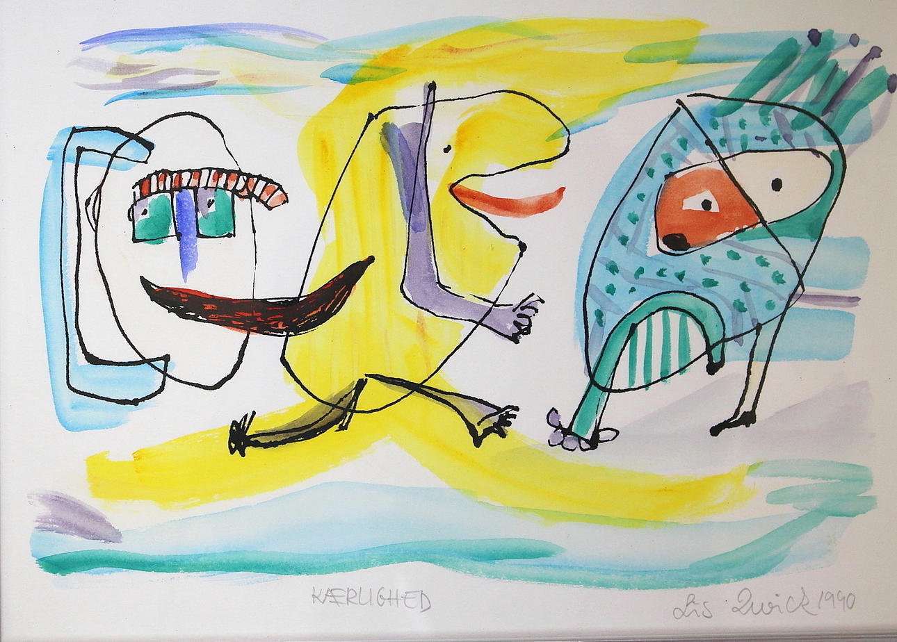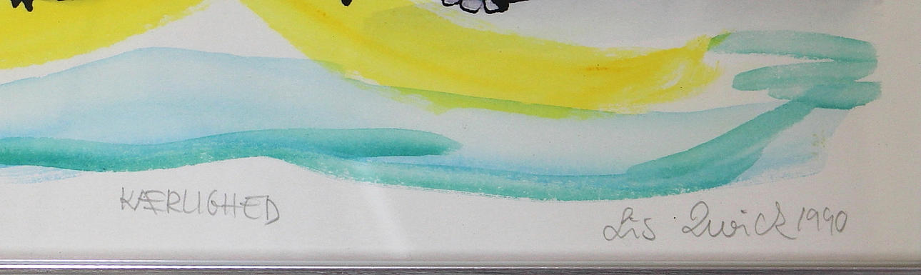 LIZ SWICK. hand-colored serigraphy "Kaerlighed" signed, dated 1990.