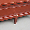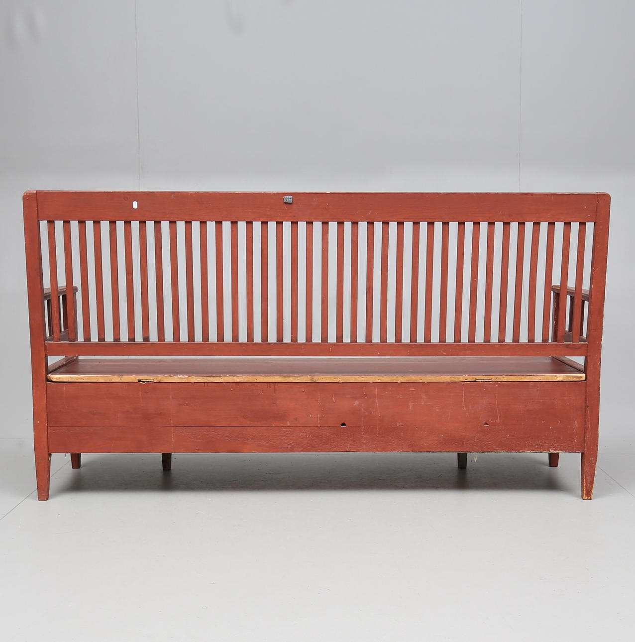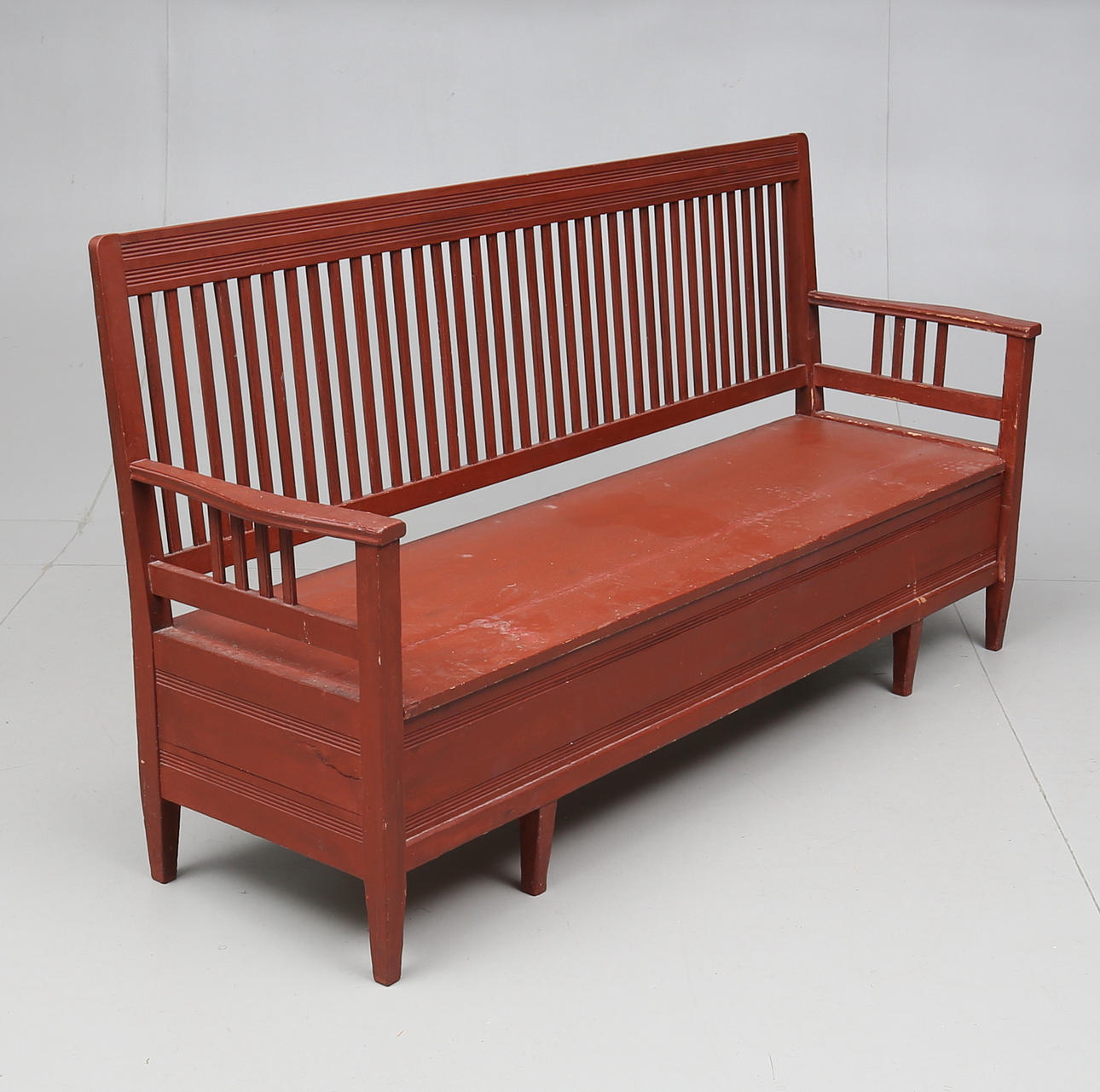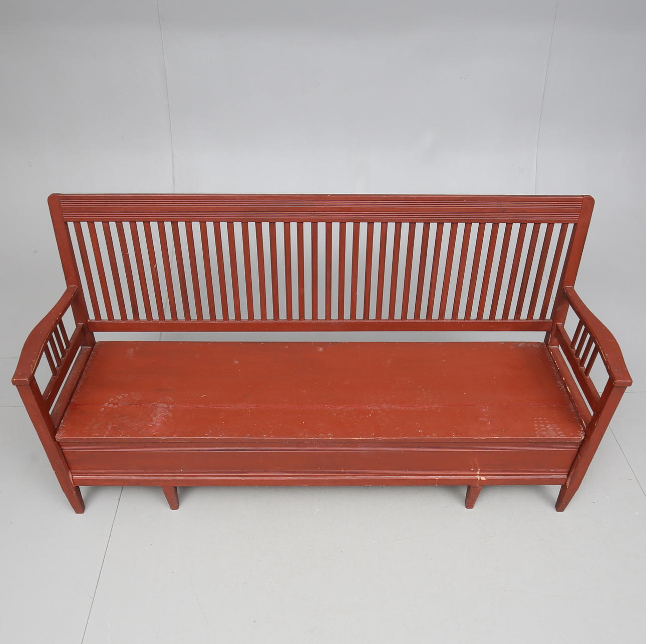 Painted. Slatted back. Fold-down seat with rear storage. Extendable front. Length about 190 cm.