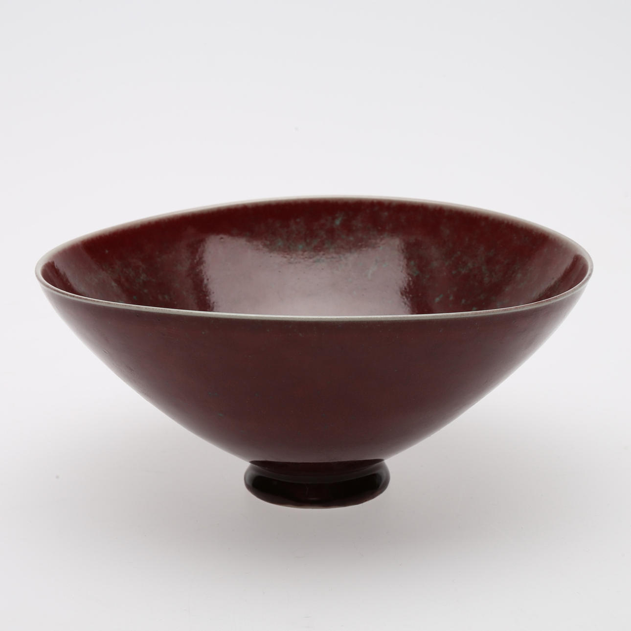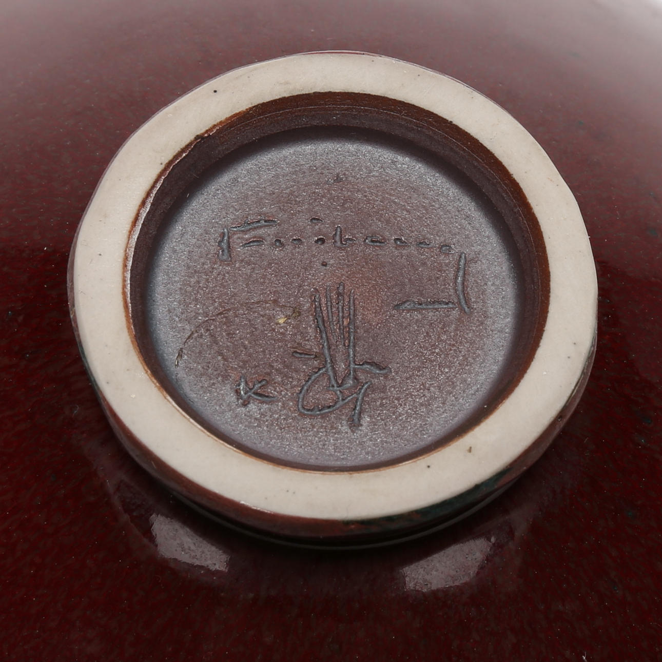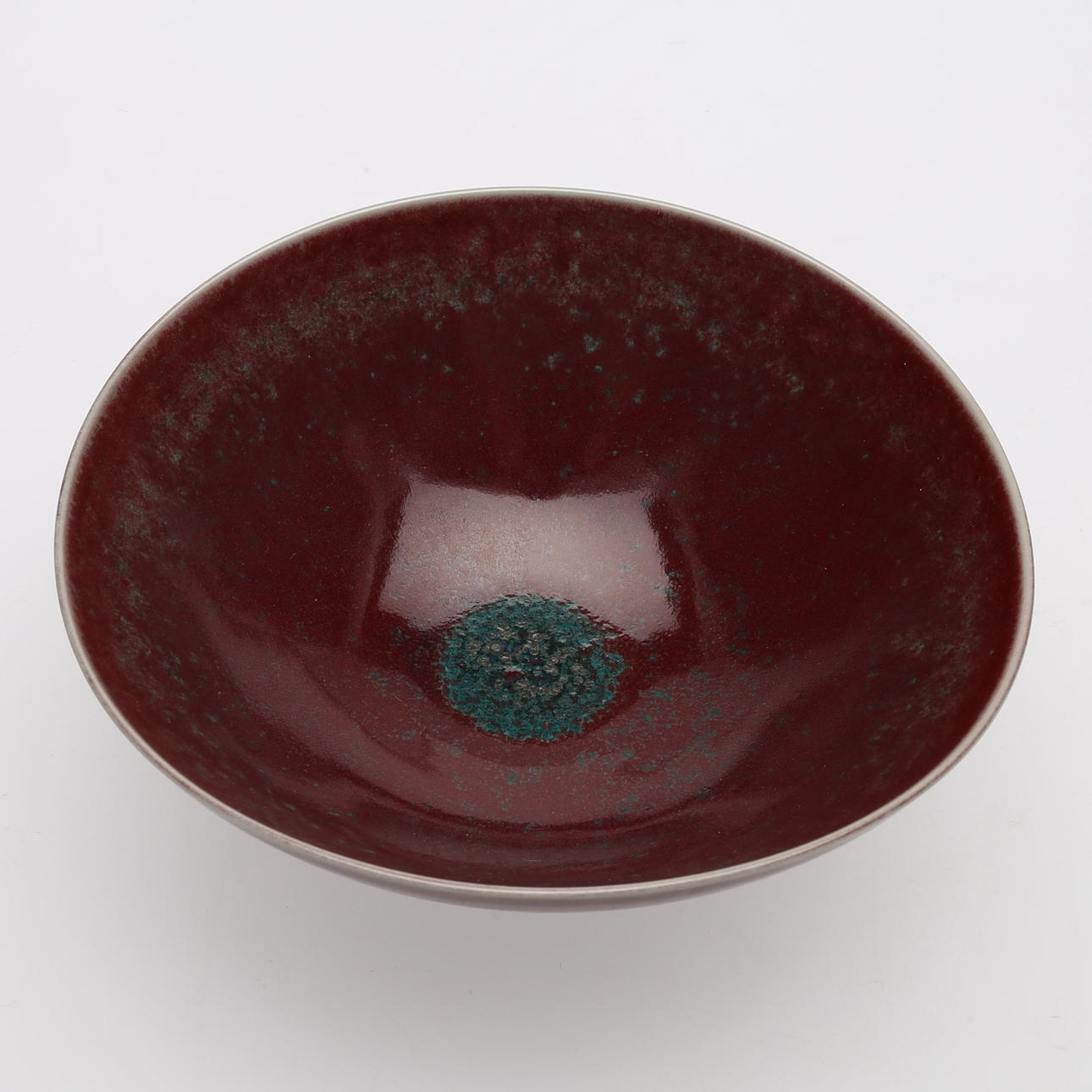 Slightly ovoid shape and with a small heel. Glazed stoneware, signed and marked with Gustavsberg's studio hand and K for 1969. Length 18 cm, height 7.3 cm. D.