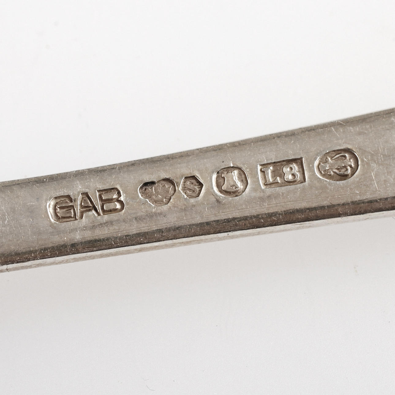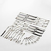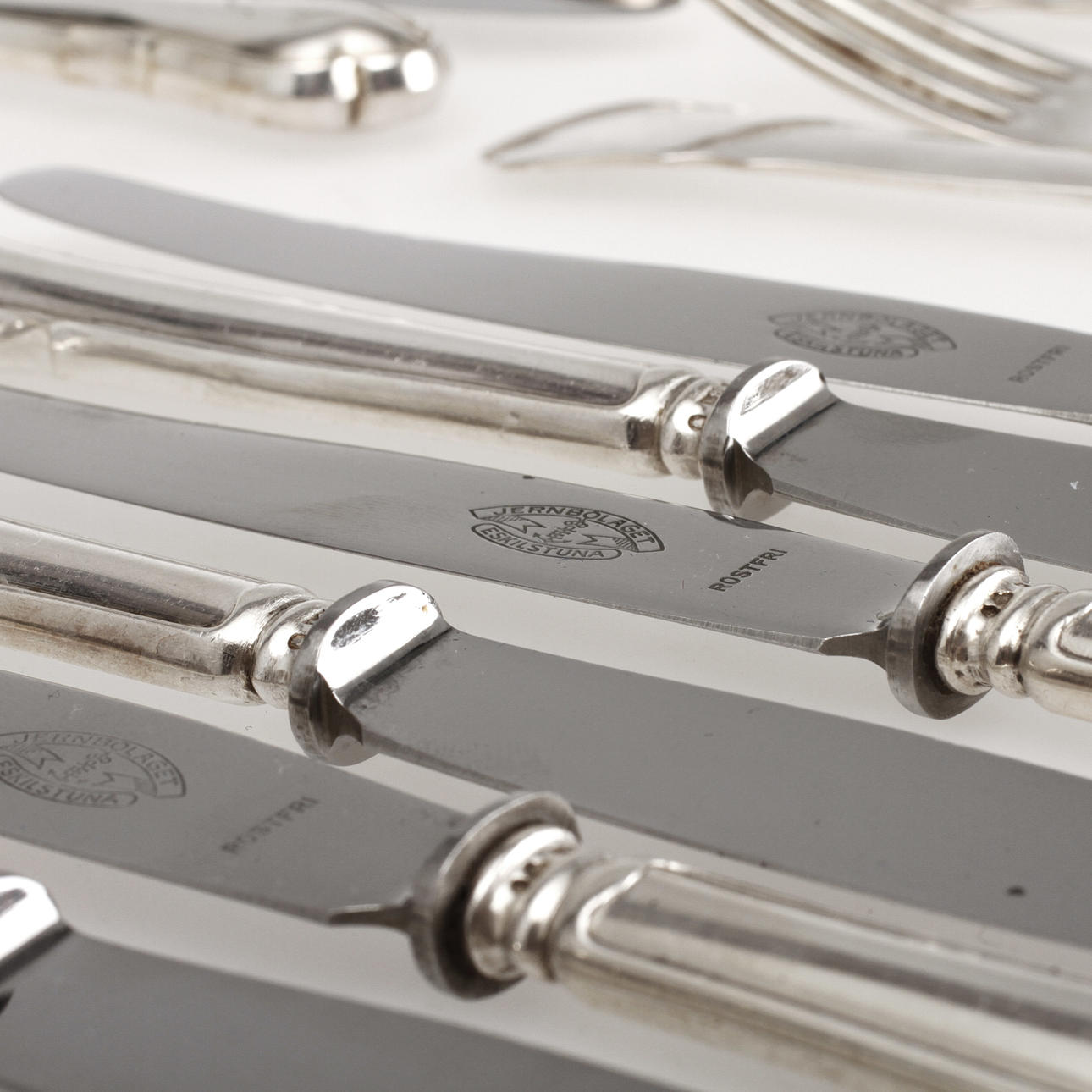6 dinner forks, length 20 cm 6 dinner knives, length 25 cm 6 table forks, length 18 cm 6 table knives, length 21 cm 6 table spoons, length 17 cm 3 spoons, length 12 cm 5 mocca spoons, length 10 cm 2 butter knives, length 17 cm 1 dessert knife , length 18 cm.