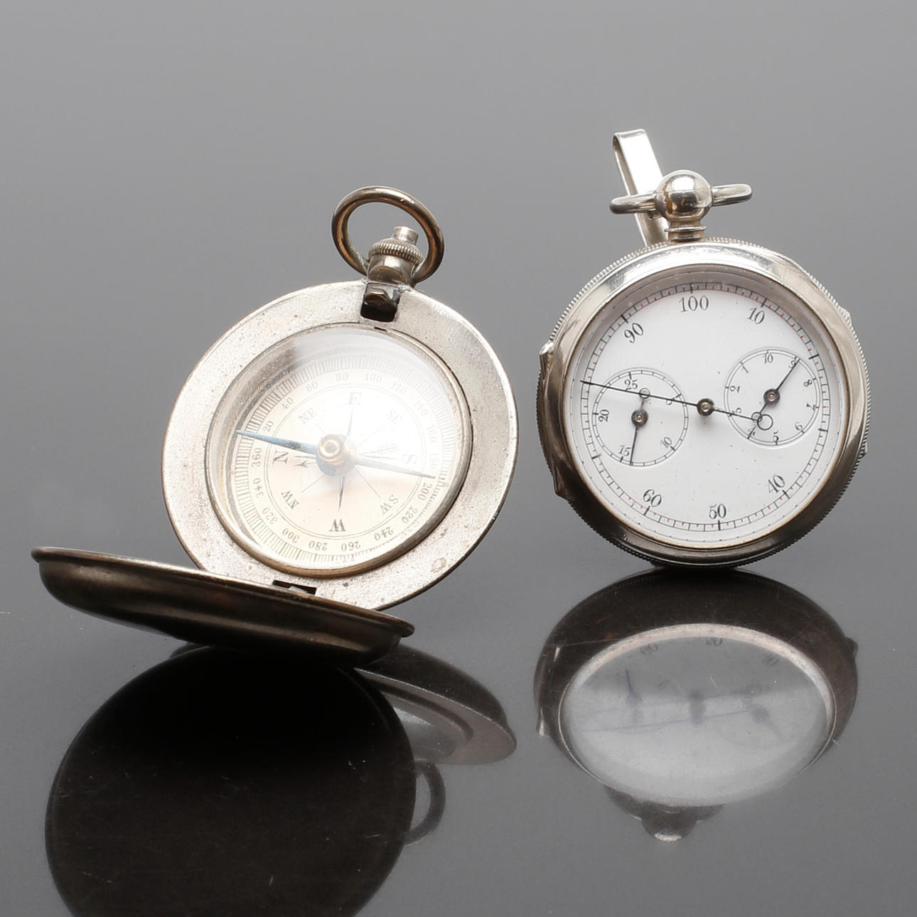 726244. POCKET WATCH, pedometer and POCKET COMPASS, silver watch, 1900s.