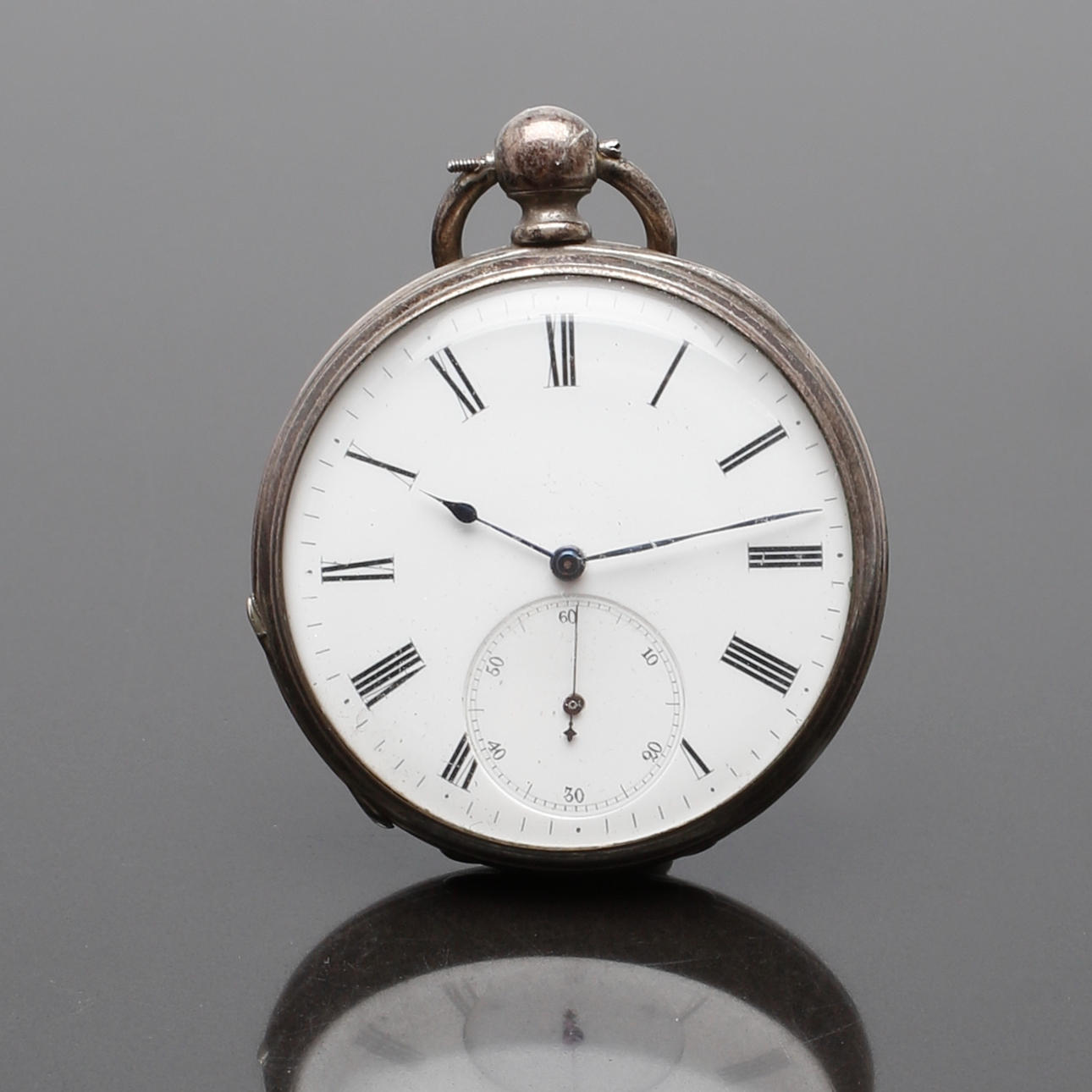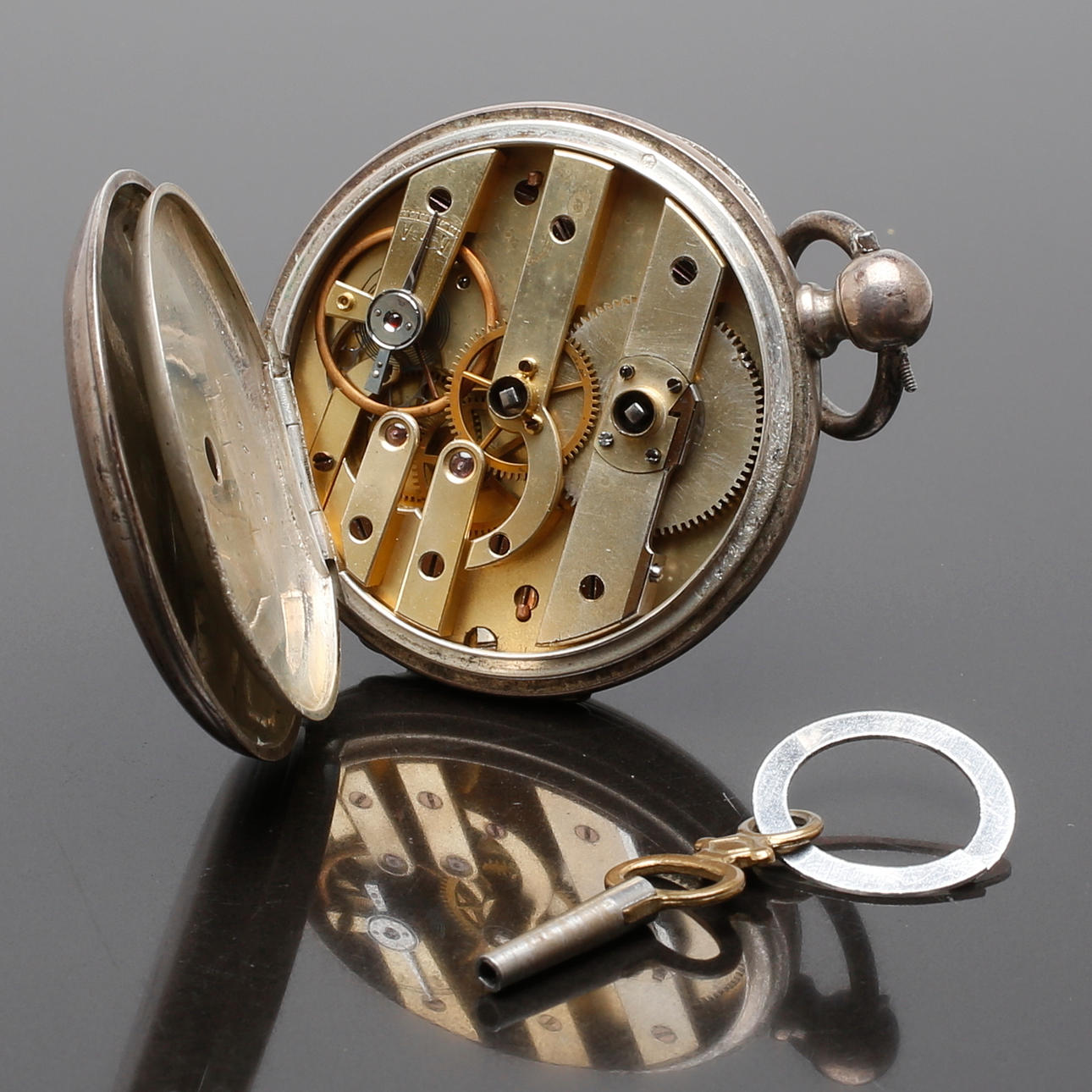 Pocket watch with silver case, white enamel dial with Roman numerals and seconds display. Cylinder movement. Indistinct maker's stamp and French silver hallmark (800). In case with key.