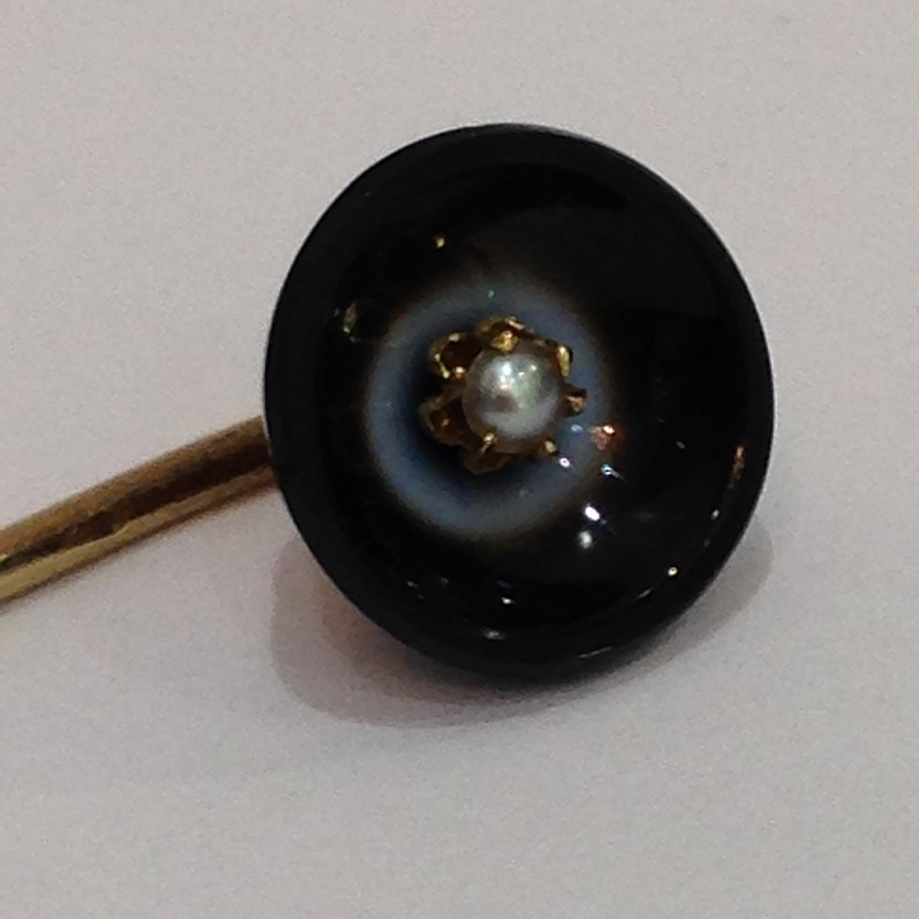 This tie pin is set with a central seed pearl in a six claw mount (please note one claw is set underneath the pearl to hold it in place).