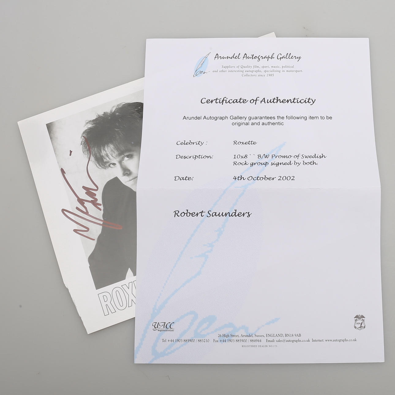 A black and white silver gelatin photograph (EMI) - 20 cm. x 25 cm - by Roxette; Per Gessle and Marie Fredriksson with Gessle's signature in black ink tv and Marie Fredriksson lower th Photo by Timothy White. With certificate of authenticity from the Arundel Autograph Gallery in England.