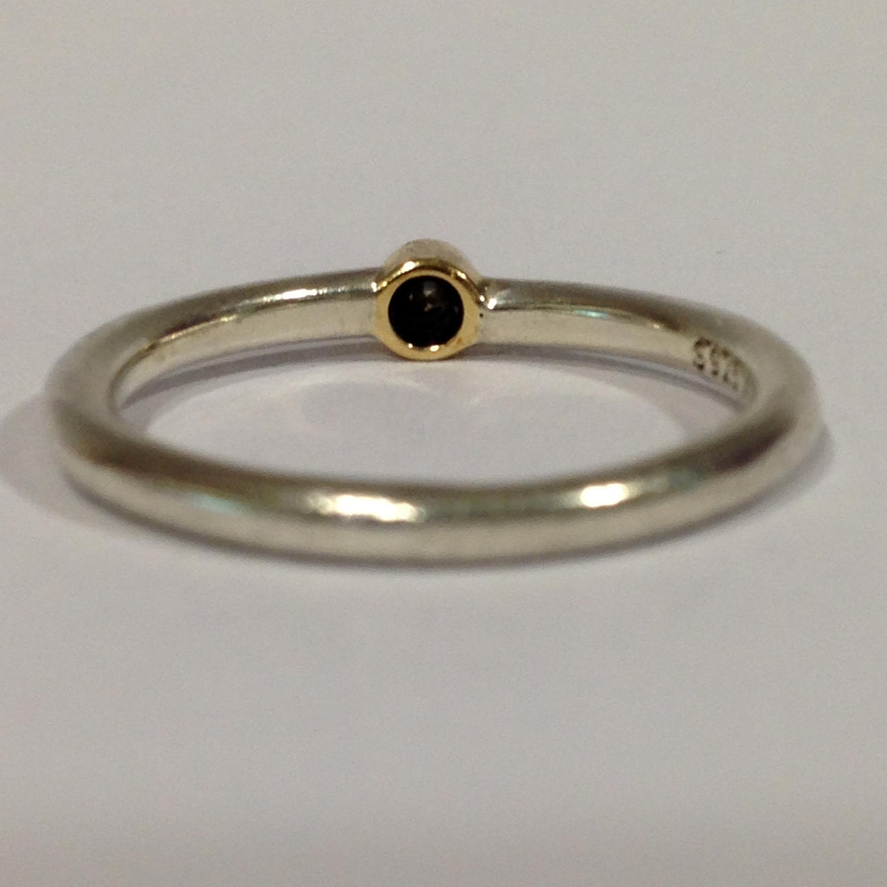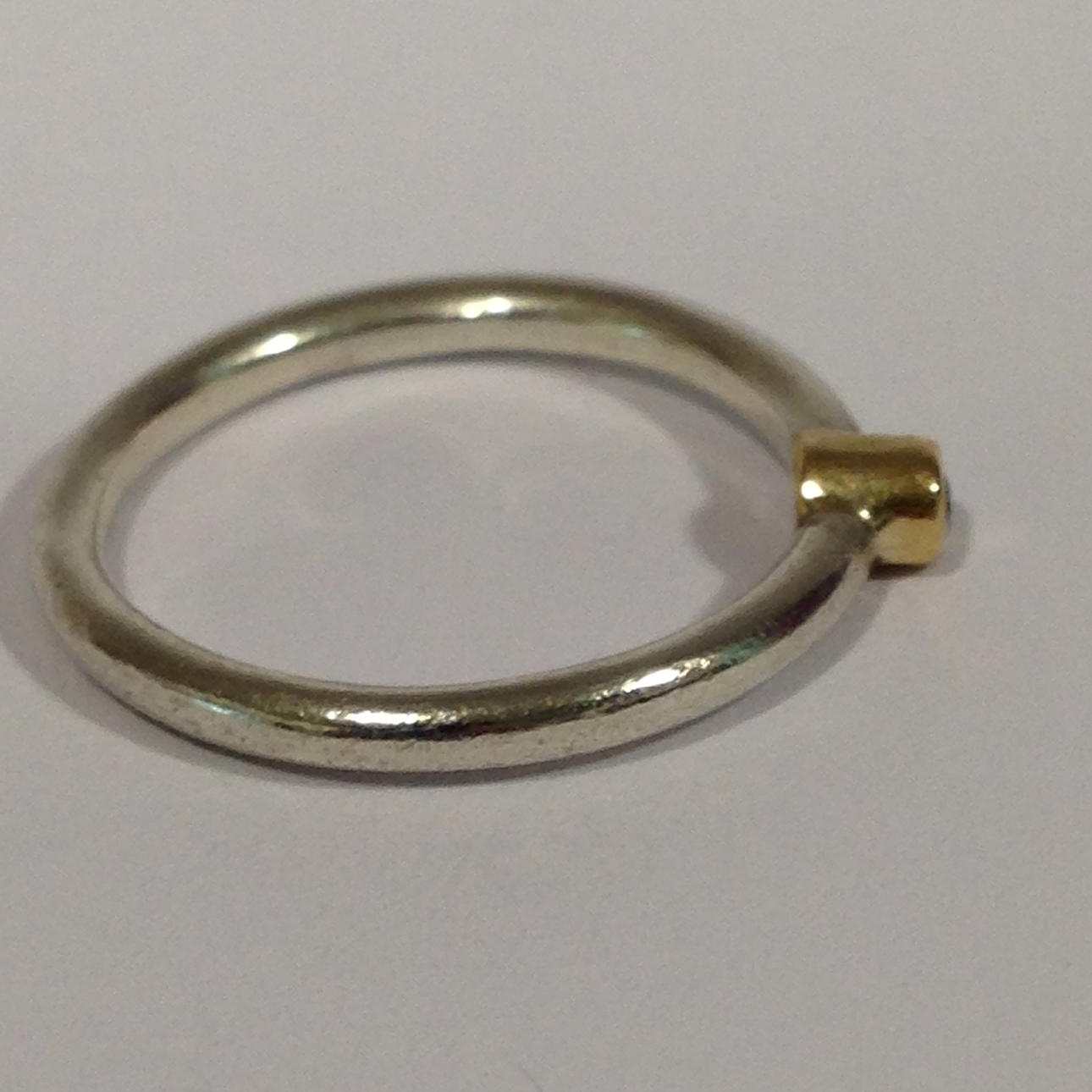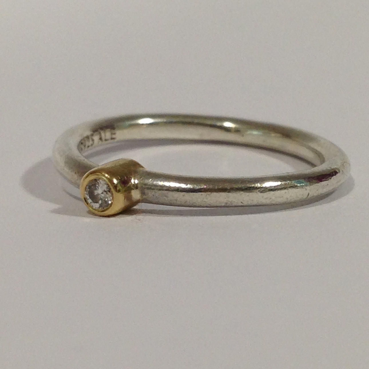 The ring is set with a white round brilliant cut diamond which is set into a 14ct yellow gold rub over setting.