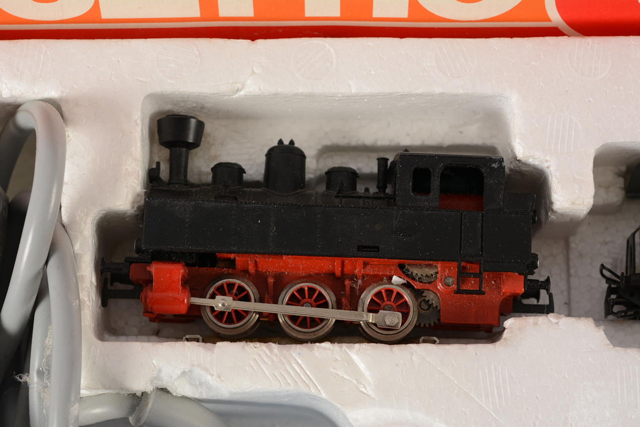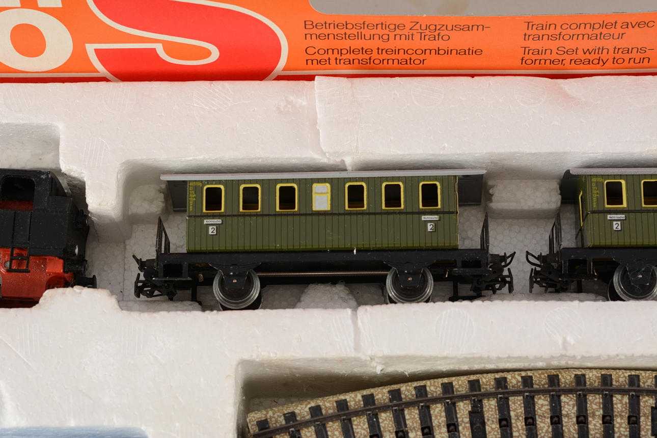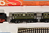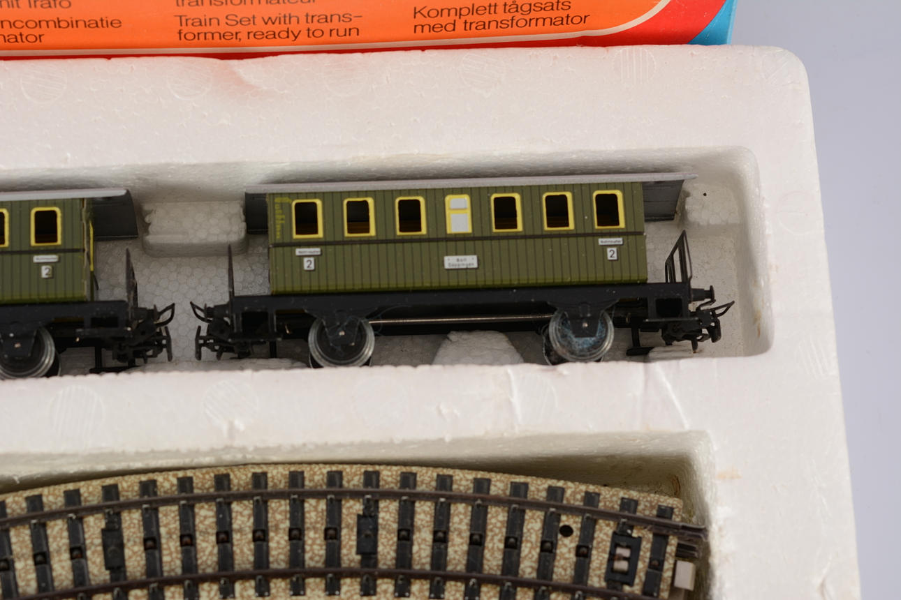 Model train set consisting of locomotive, 2 carriages, rails and transformer. Manual missing.