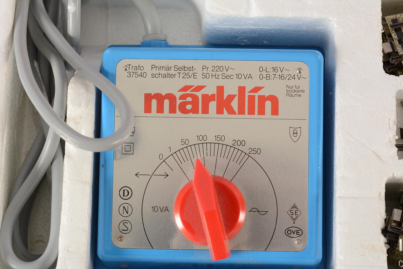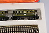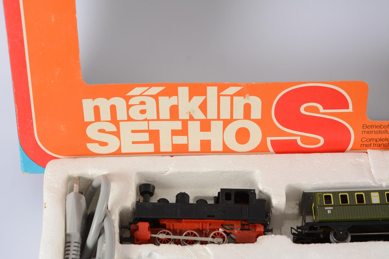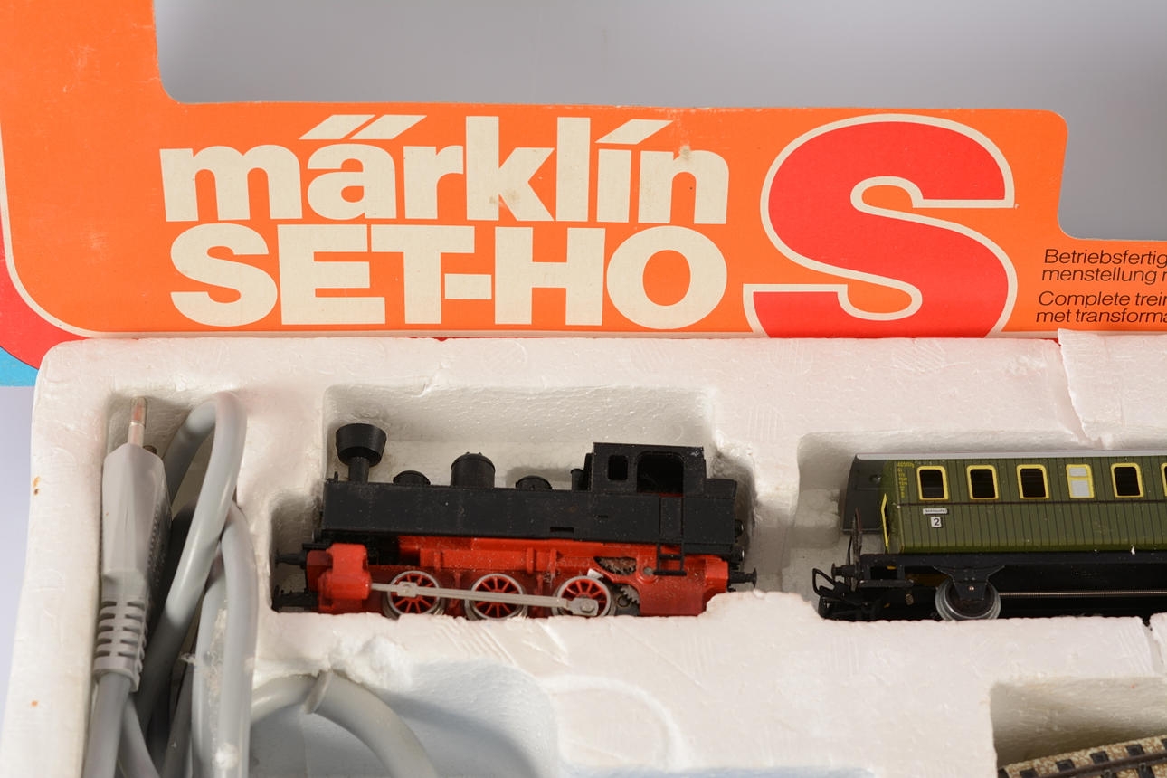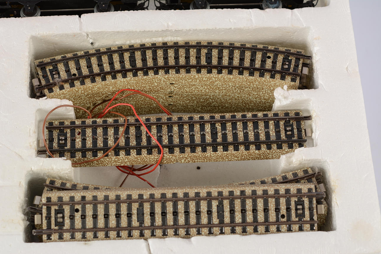 Model train set consisting of locomotive, 2 carriages, rails and transformer. Manual missing.