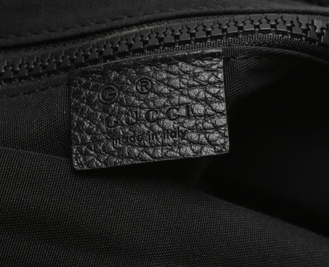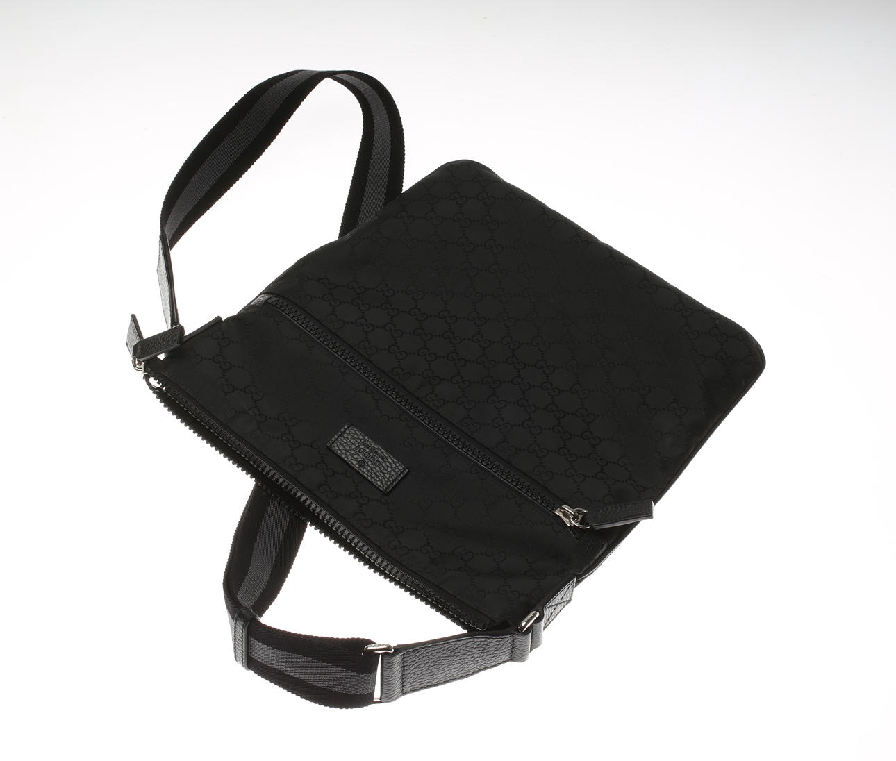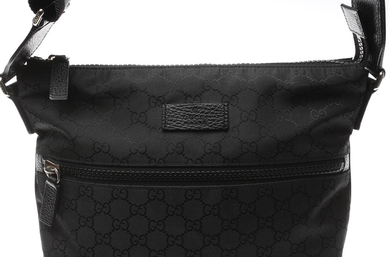 Black, logo pattern. Nylon. Leather details. Outer - and inner pocket with zipper. Tag marked with Gucci "Made in Italy". Shoulder strap leather/fabric. Length approx. 30 cm. Dustbag.