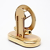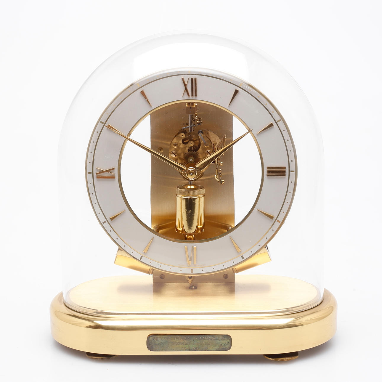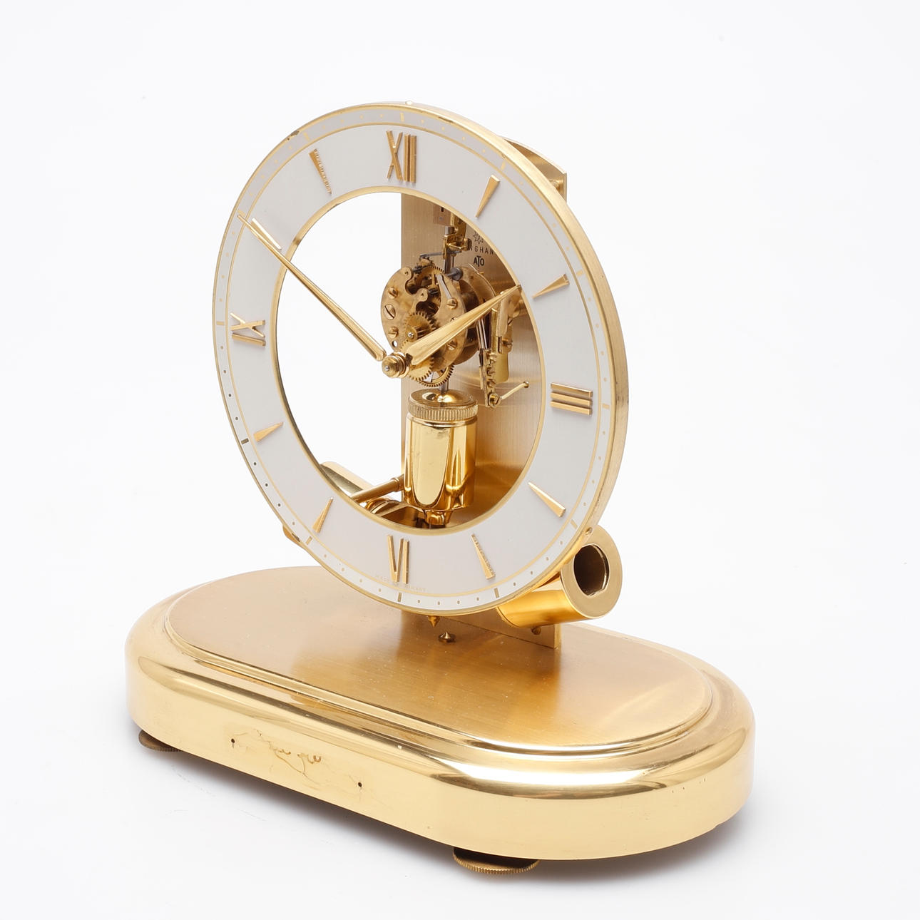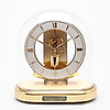 Table clock in brass with glass bezel, ring-shaped dial with Roman cardinal numerals, exposed work.