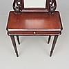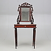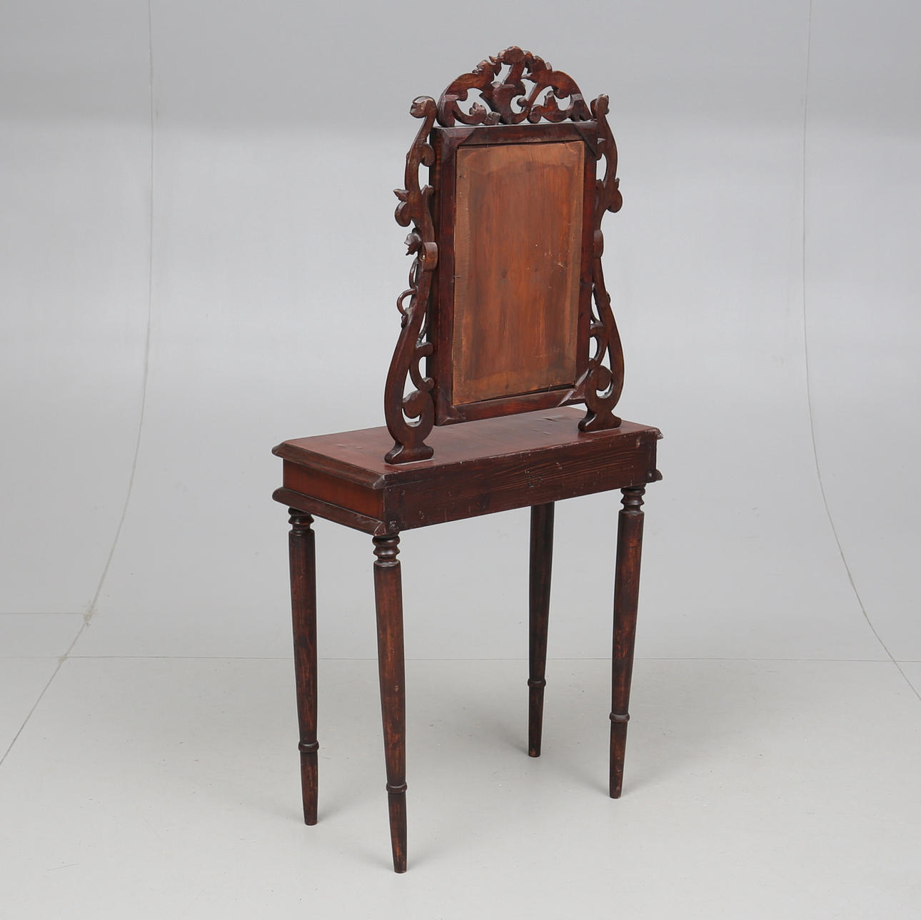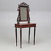 Frame of stained hardwood, top veneered with walnut. Essay with richly cut decor and adjustable mirror. A box in a box. Turned legs. Length 79. Width 36. Height 147 cm.