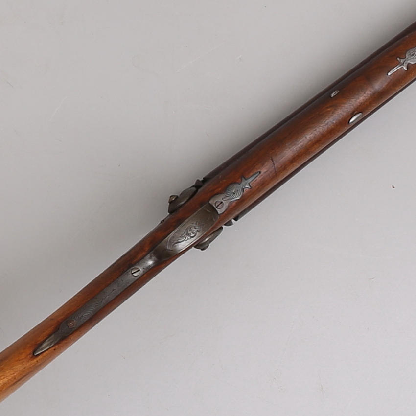 Barrel, round, length 78cm, smooth bore, caliber approx. 17mm. Lock unmarked with simple engraving. Fittings with simple engraving. Accessories, chisels.