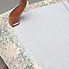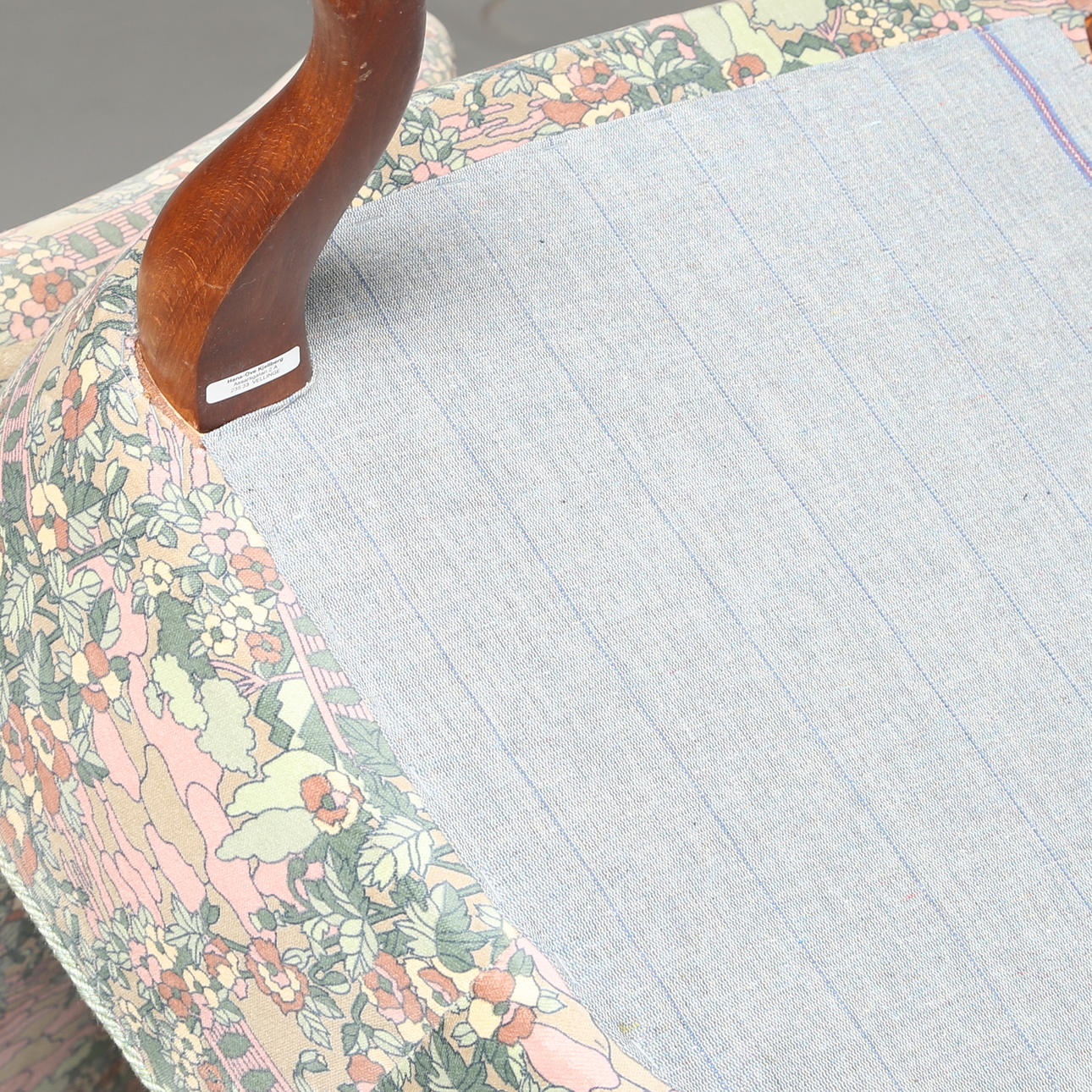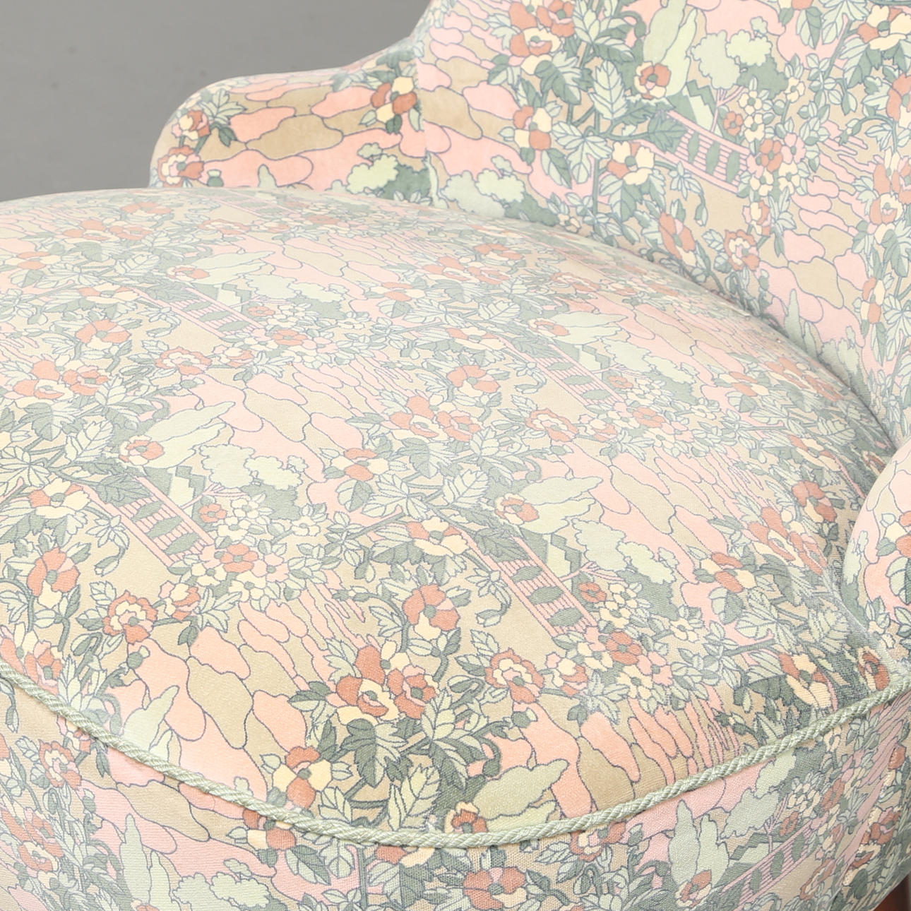Fixed upholstery in polychrome patterned velvet textile in retro art nouveau. Wooden legs.