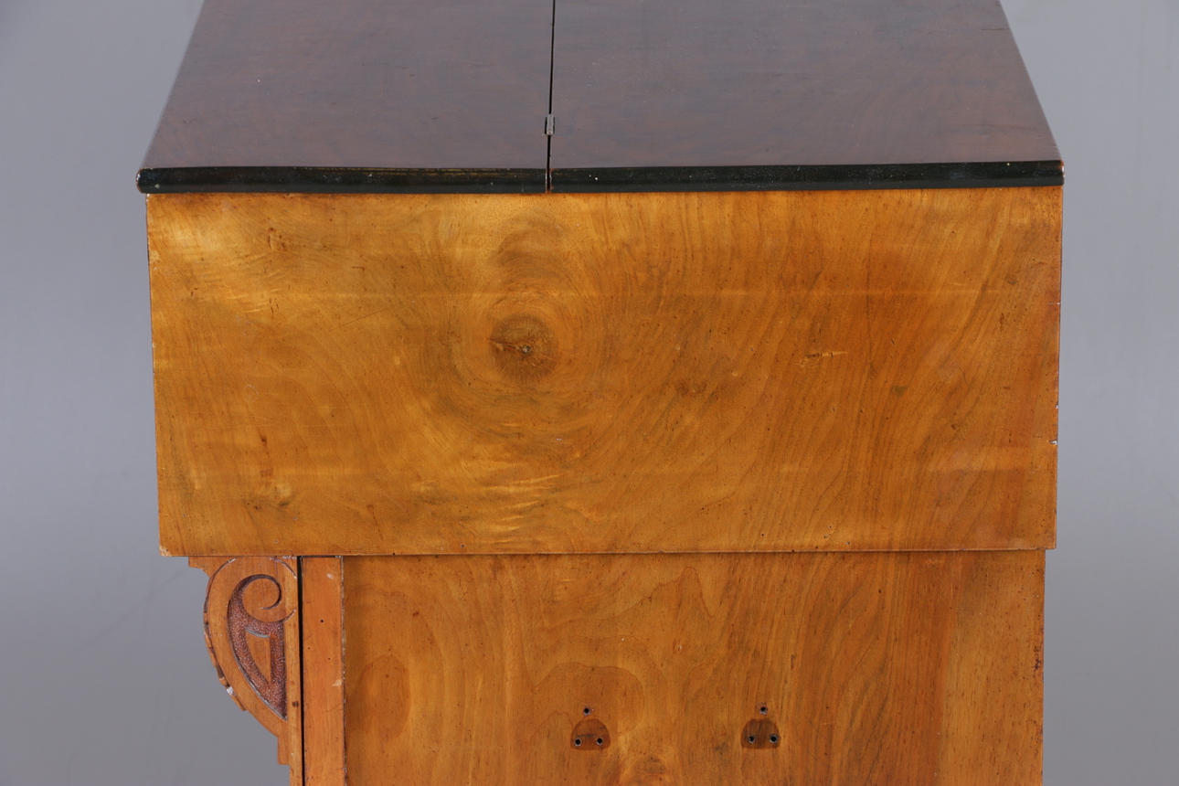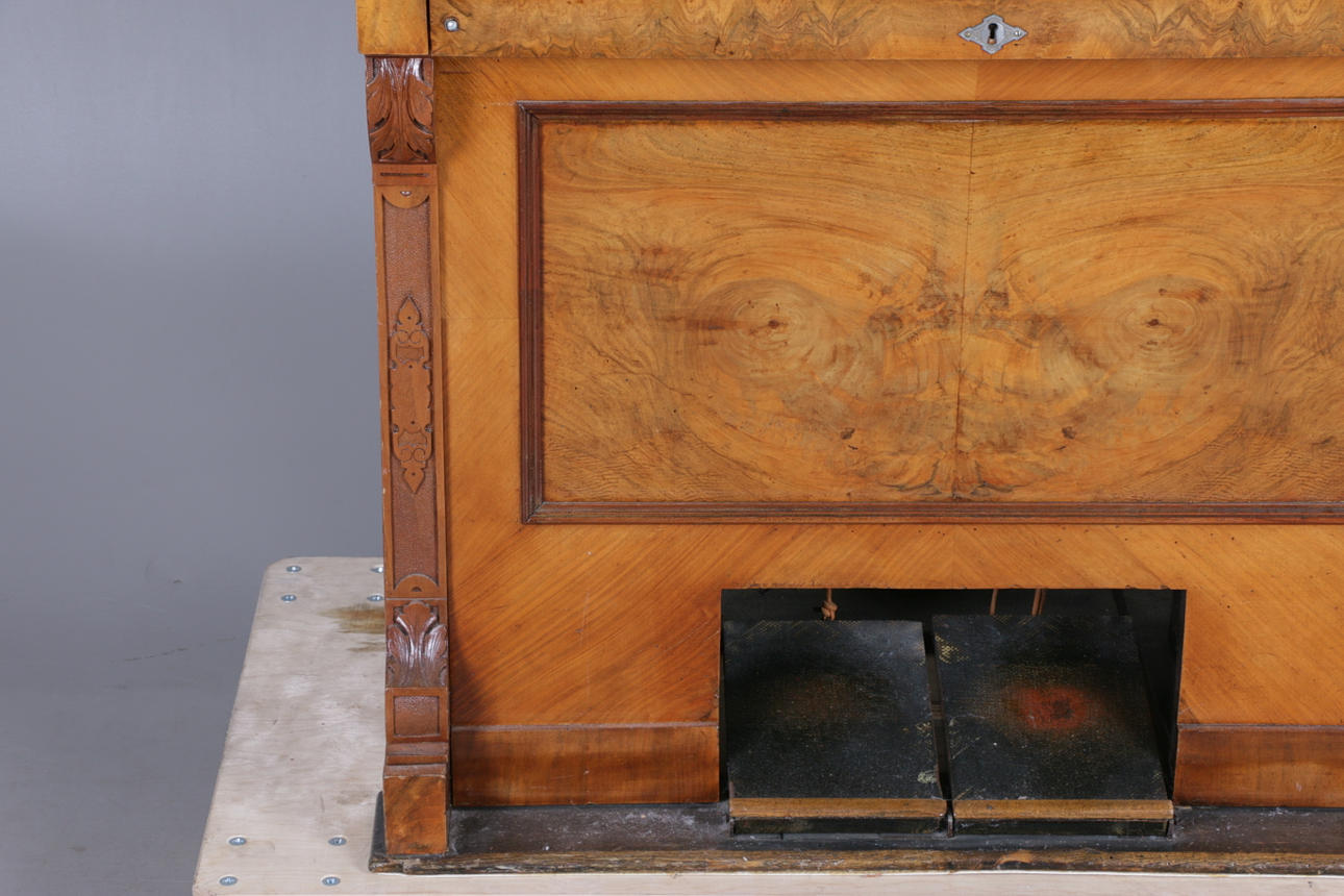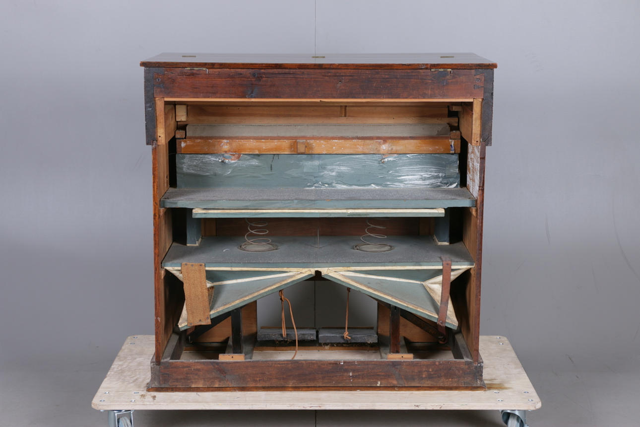 Manufacturer unidentified, the bellows get air but no sound from the keys, casing with cracks, back piece missing.