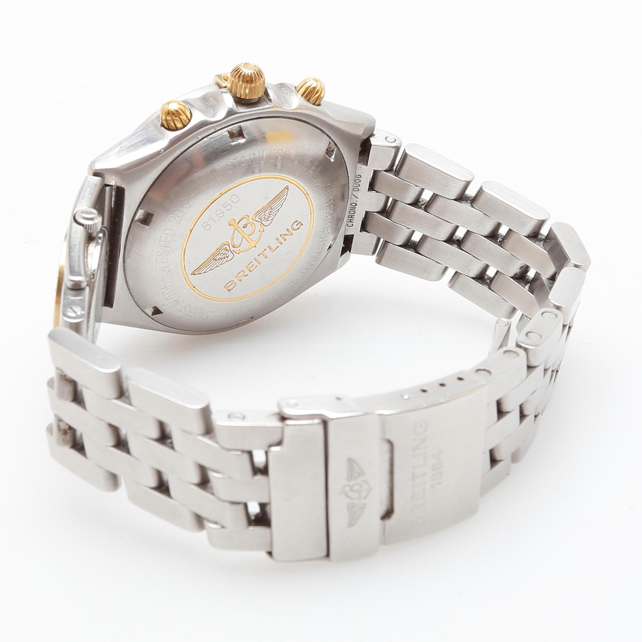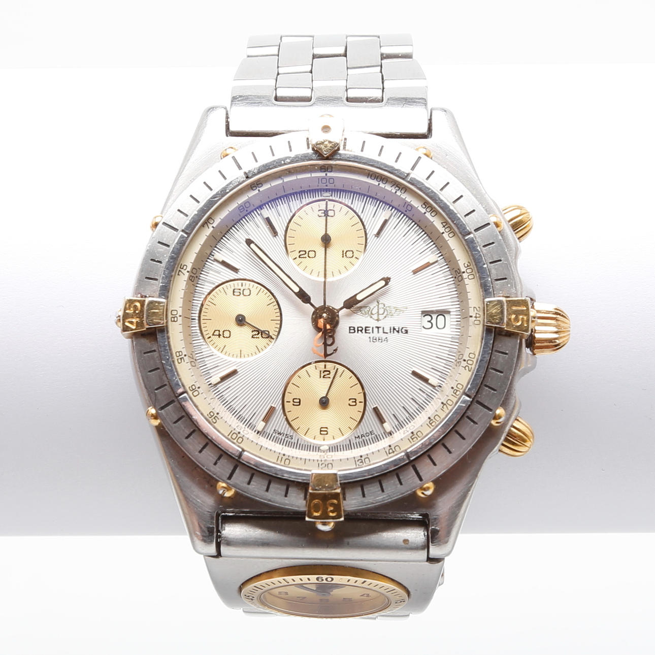 Breitling Chronomat Dual Time 81950. Steel case with gold-plated details, silver dial with three registers and date display. Original steel link with folding clasp. Automatic work. Diameter 38 mm. Comes in original box.