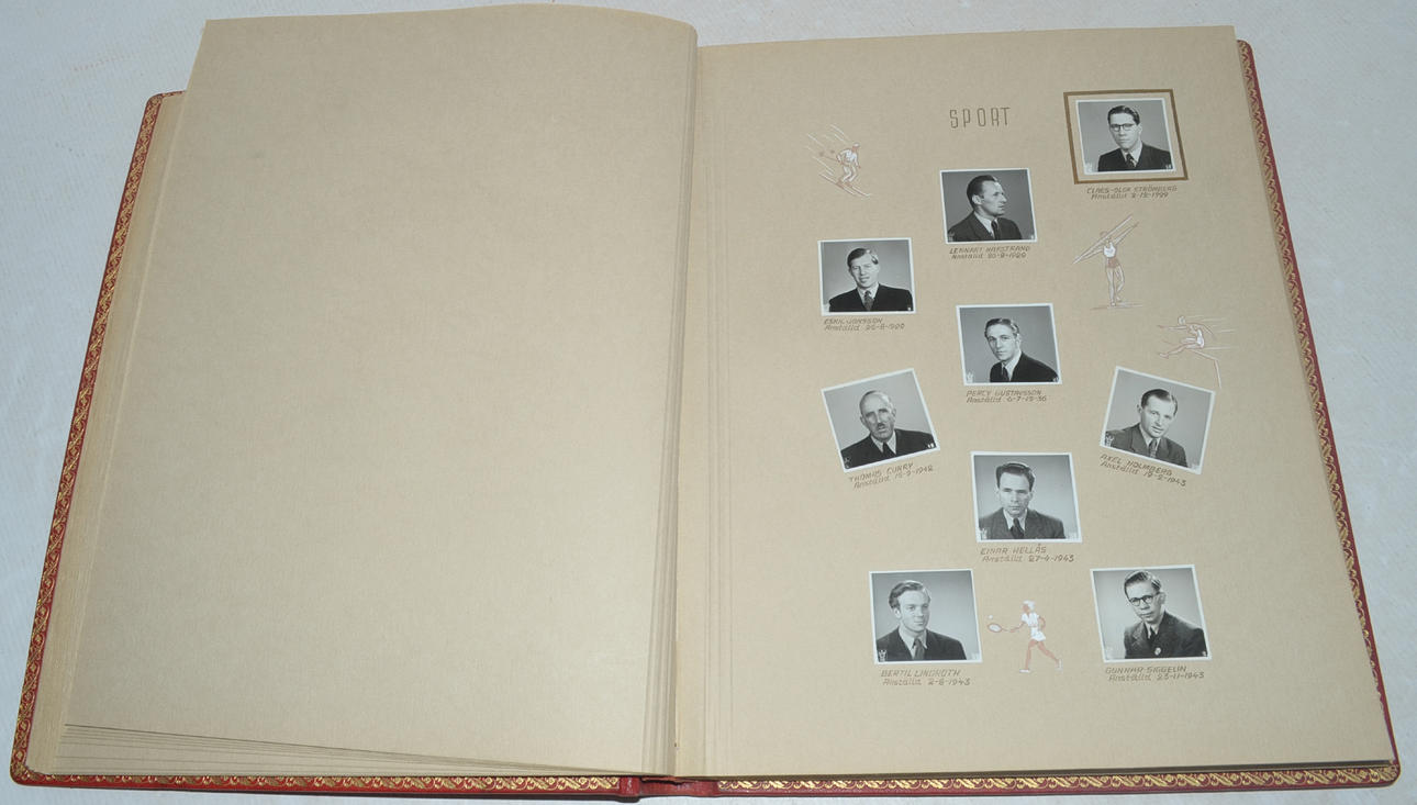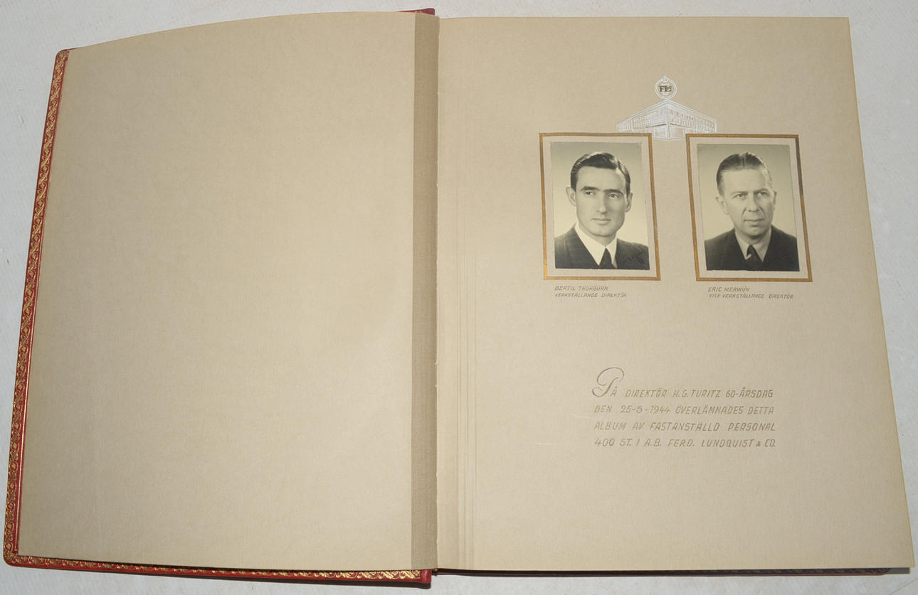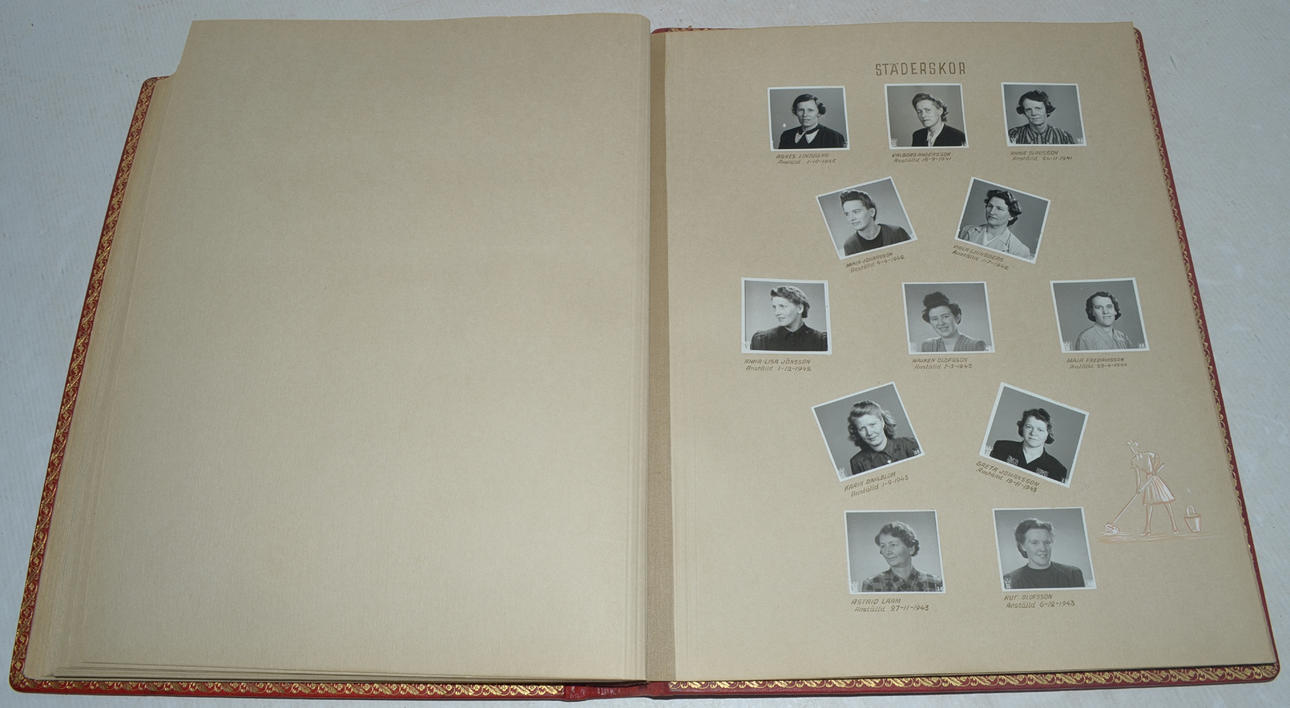 Full morocco leather binding with inner dentelle and silk cover page.. Album with original photographic portraits of permanent staff, 400 pcs, in AB ferd. Lundquist & Co. 1944. Size 350x420 mm.