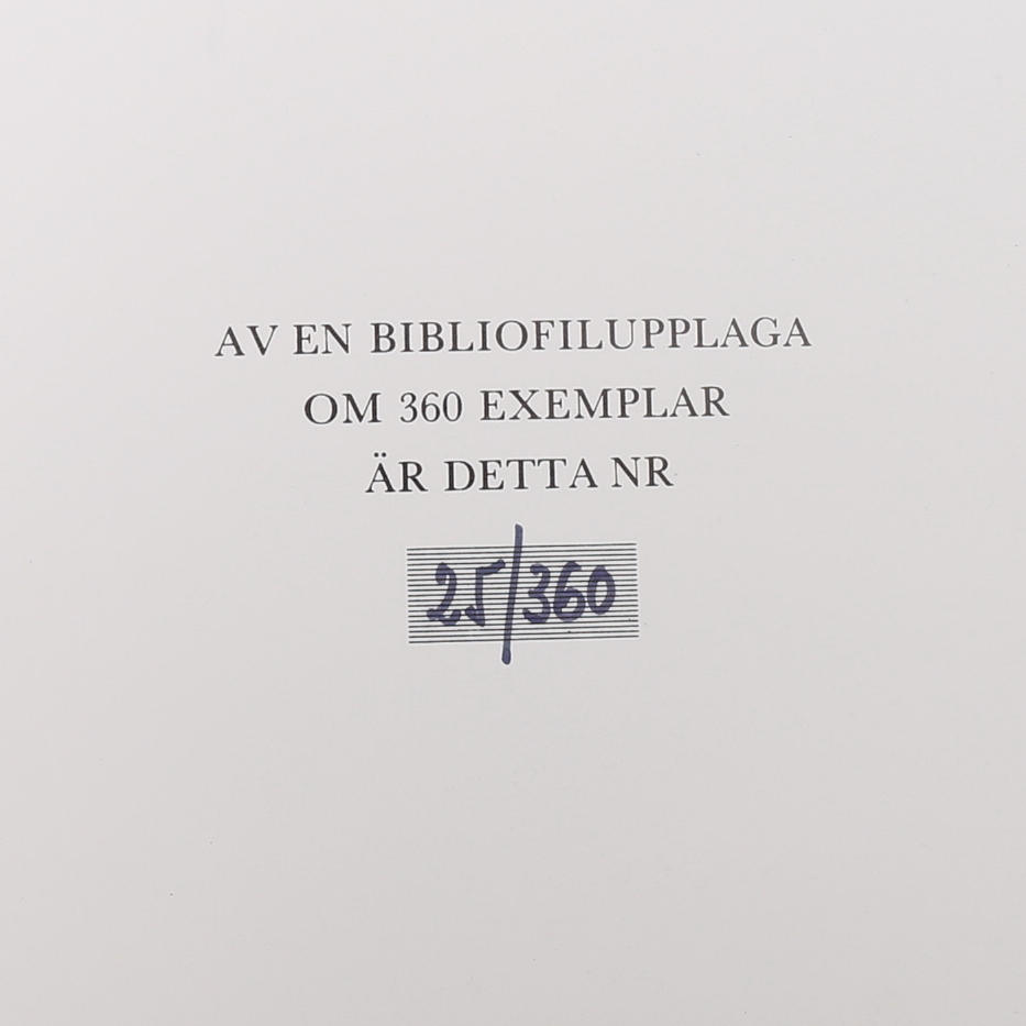 Wretholm, Eugen. Gustav Rudberg. Askild & Kärnekull, Stockholm, 1980. 4th. in the publisher's fine black leather binding with gilded spine text. Illustrated dust jacket. Richly illustrated copy from the bibliophile edition with a loosely attached signed and numbered color lithograph by Gustav Rudberg. The bibliophile edition is printed in 360 copies of which this is no. 25. 76 p.