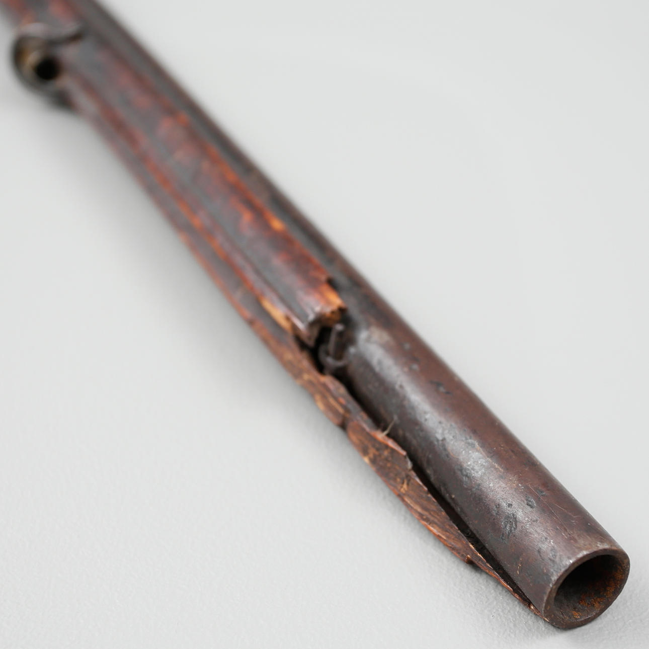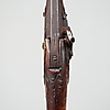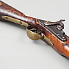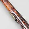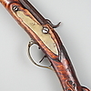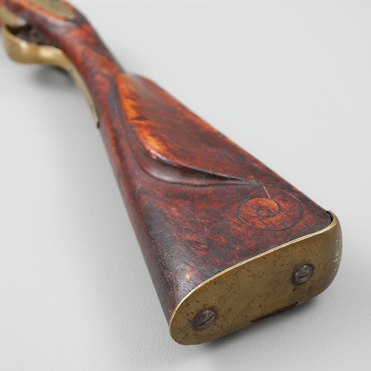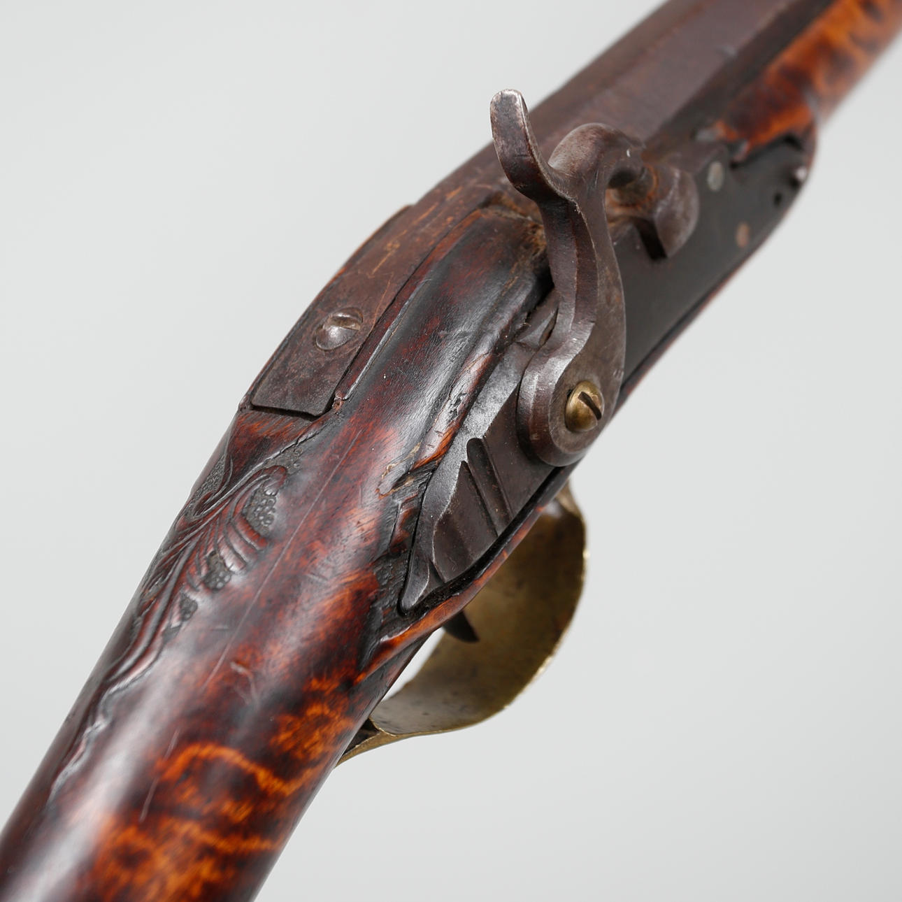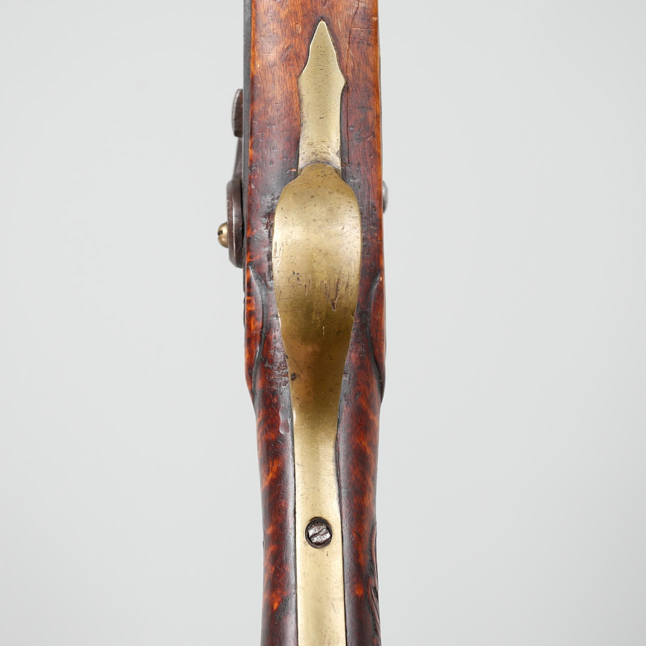 Full stock in flaming birch, fittings in brass. Length 124 cm.