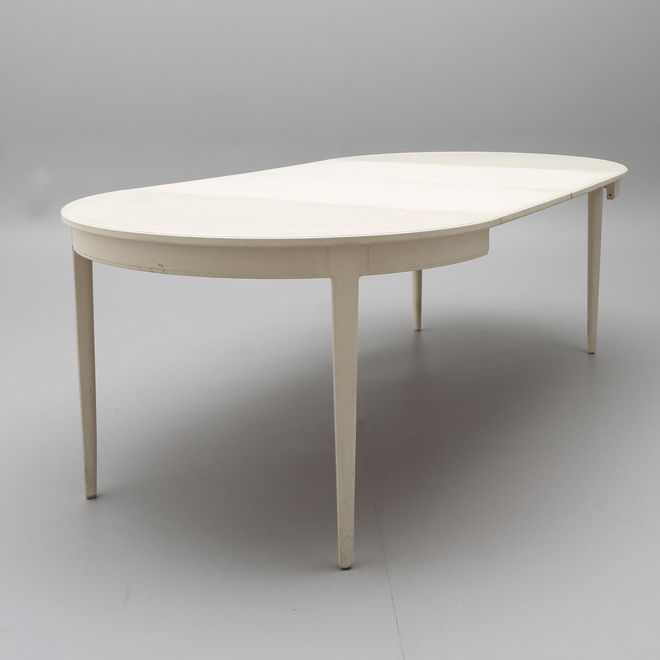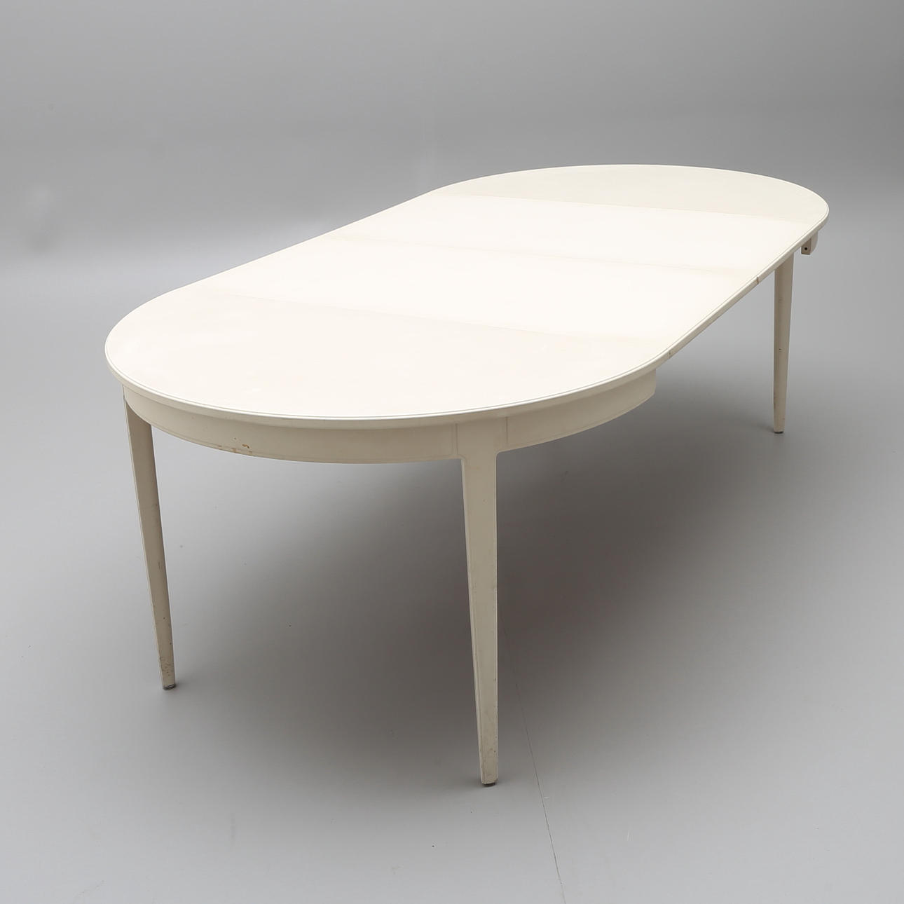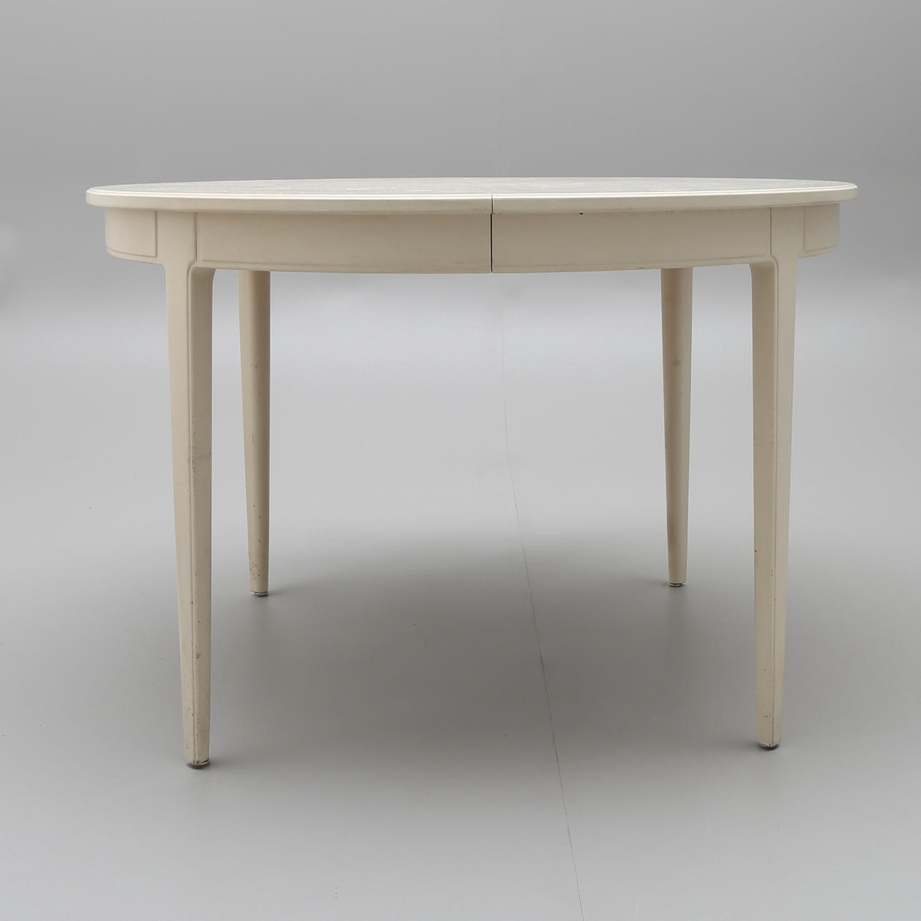 Grey-painted, marked Bodafors Design Carl Malsten Made in Sweden 1964 diameter 114, cm, height 75 cm. Comes with two insert boards without edge, length 55 cm each.