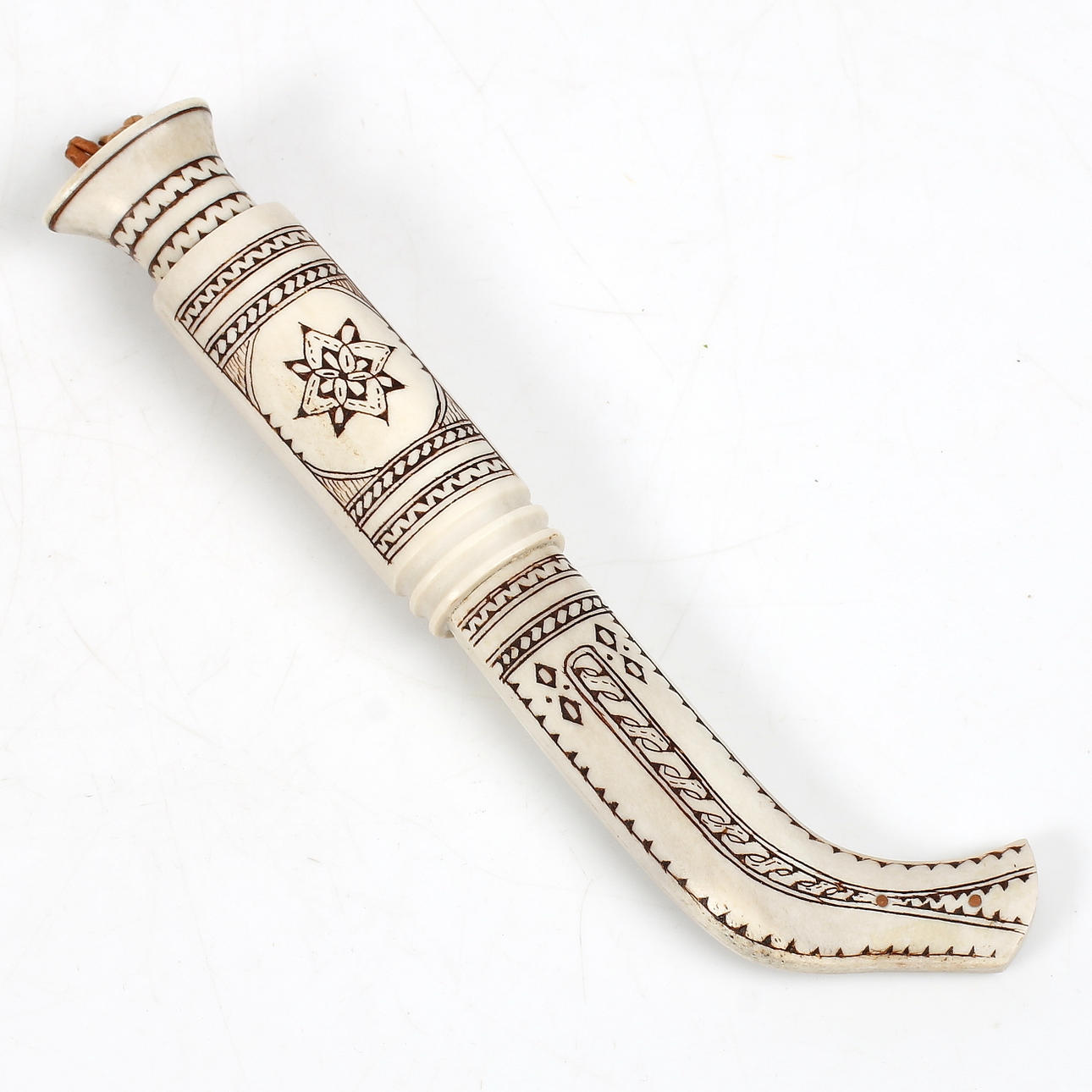 Shaft and scabbard of horn with cut decoration, blade in steel. Total length 19.5 cm.