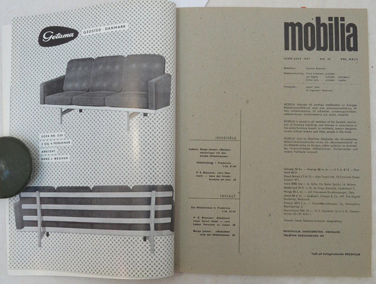 Danish furniture and design magazine. Mobilia was founded in 1955 as an international continuation of the magazine Møbler, with controversial content and a square layout. Among the editors are founder Gunnar Bratvold, Grete Jalk, Poul Henningsen and Per Mollerup. Mobilia was closed in 1984.