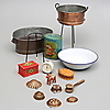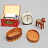 Copper pots with dents, wooden box. Dala horse, stands, mallet with wear. The alarm clock was working at the time of cataloging. No function guarantee is provided.
