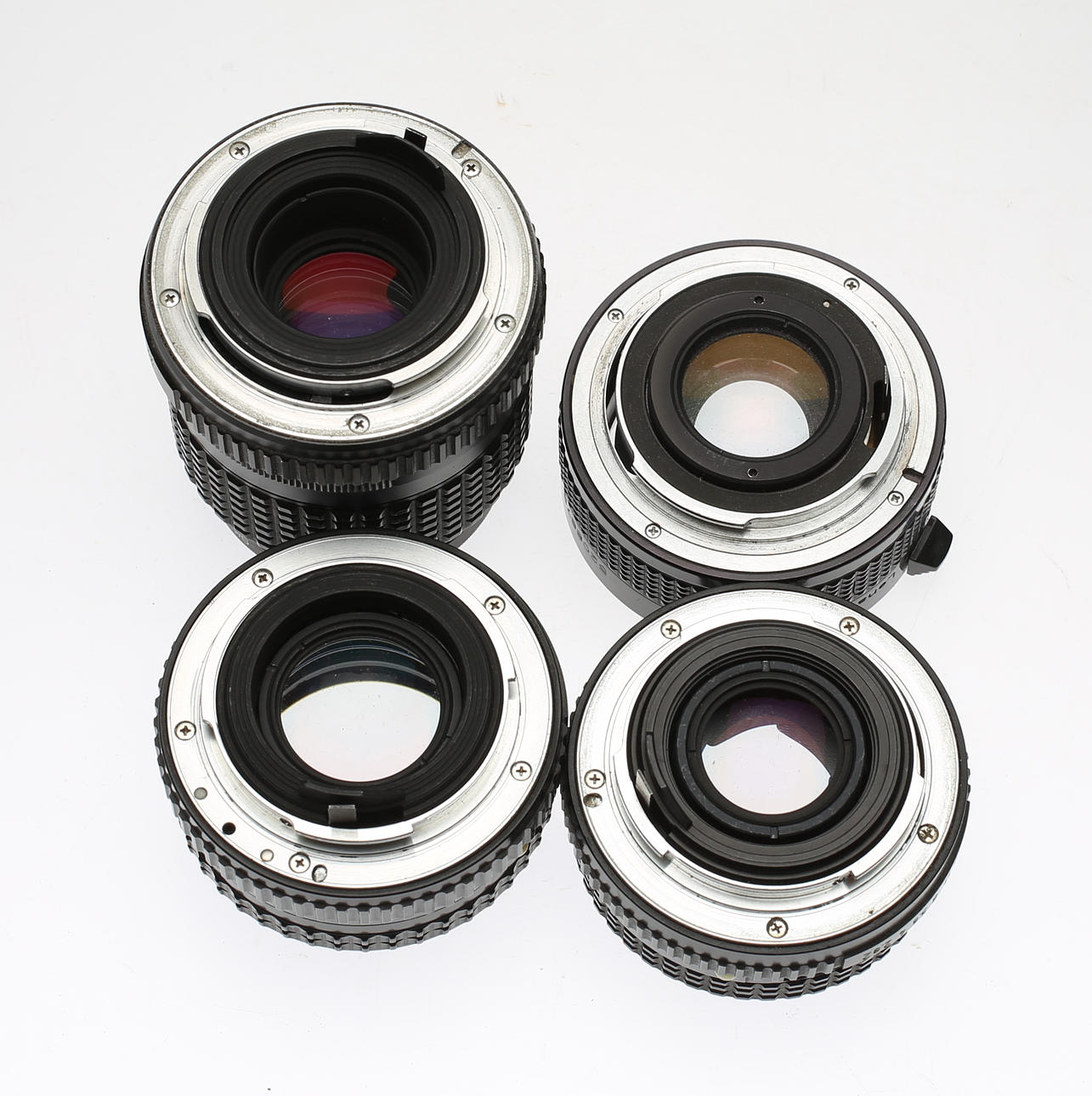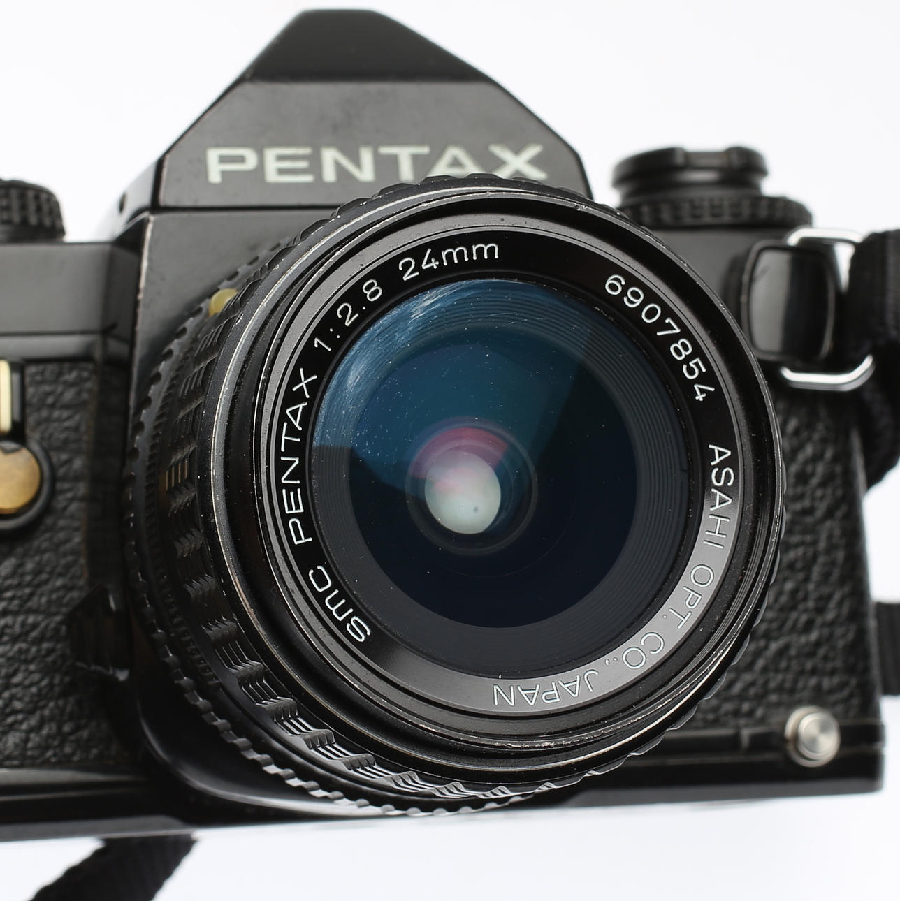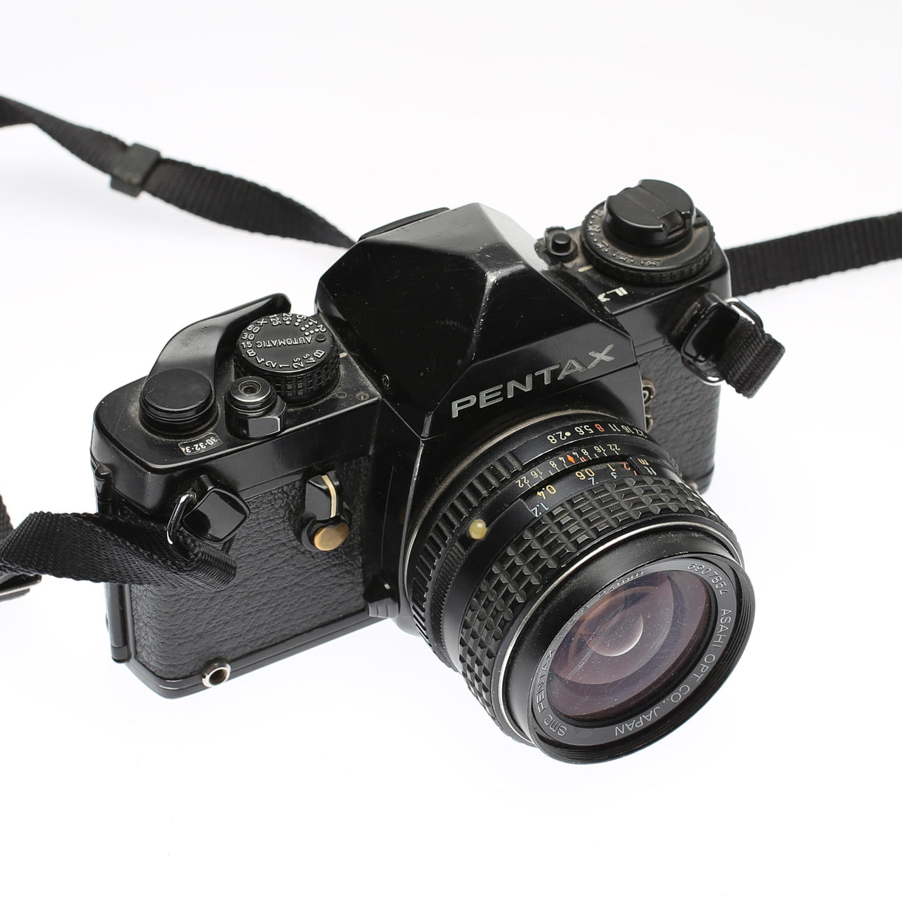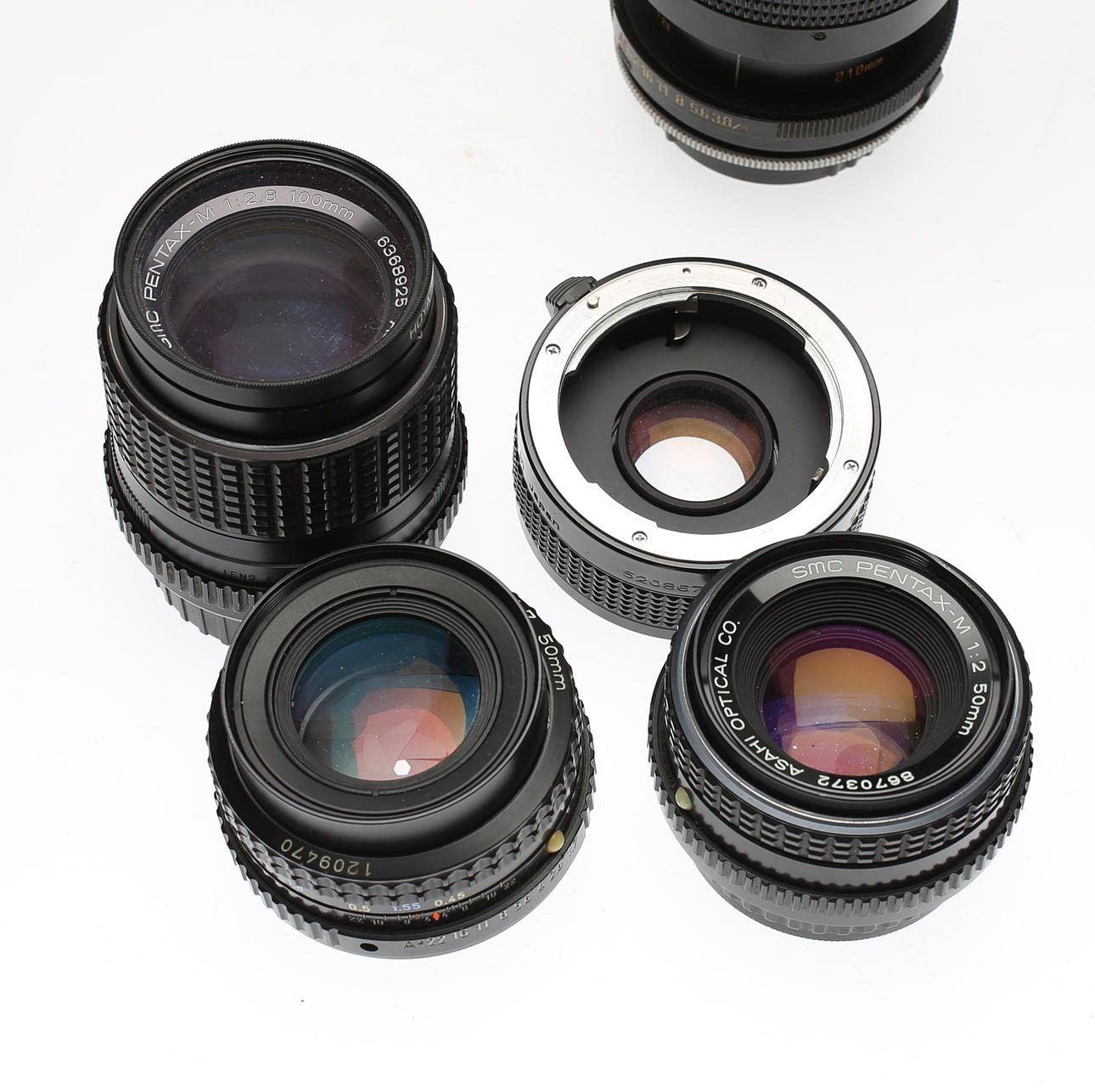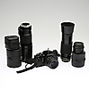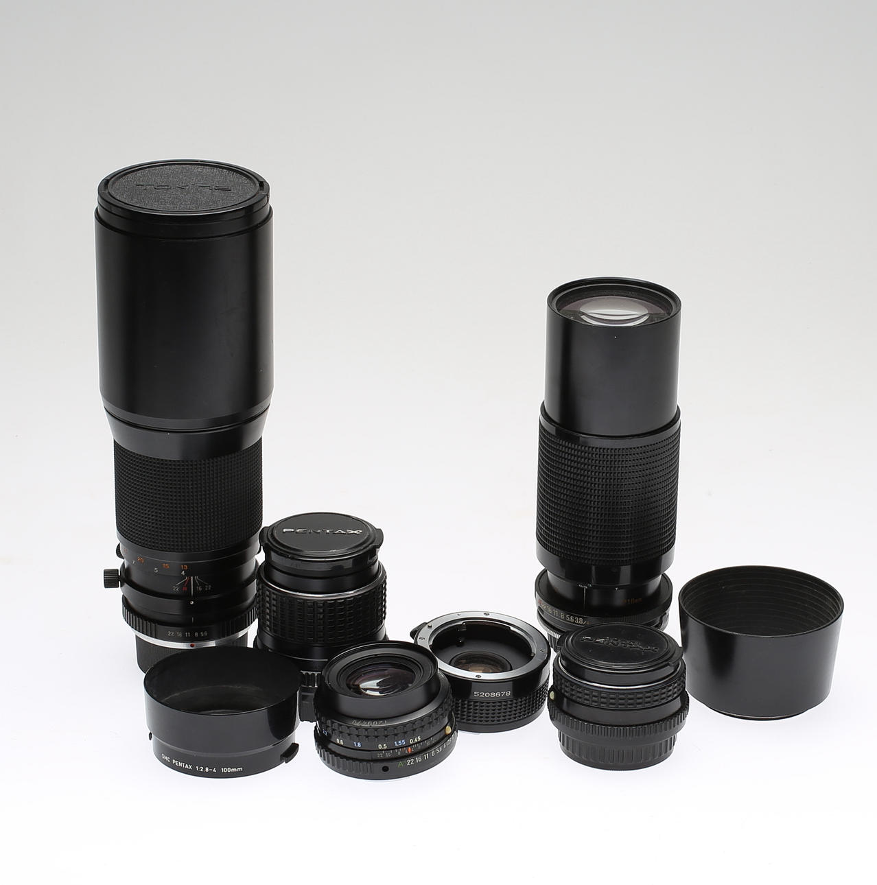Camera body Pentax LX. The lenses included are SMC PENTAX 1:28 24mm, SMC PENTAX-M 1:2.8 100mm, SMC PENTAX-M 1:2 50mm, SMC PENTAX-M 1:1.7 50mm, RMC TOKINA 1:5.6 400mm, TAMRON 1:3.8- 4 70-210mm. Teleconverter 2x APK TELEPLUS MC6 and lens bags are included for some of the lenses.
