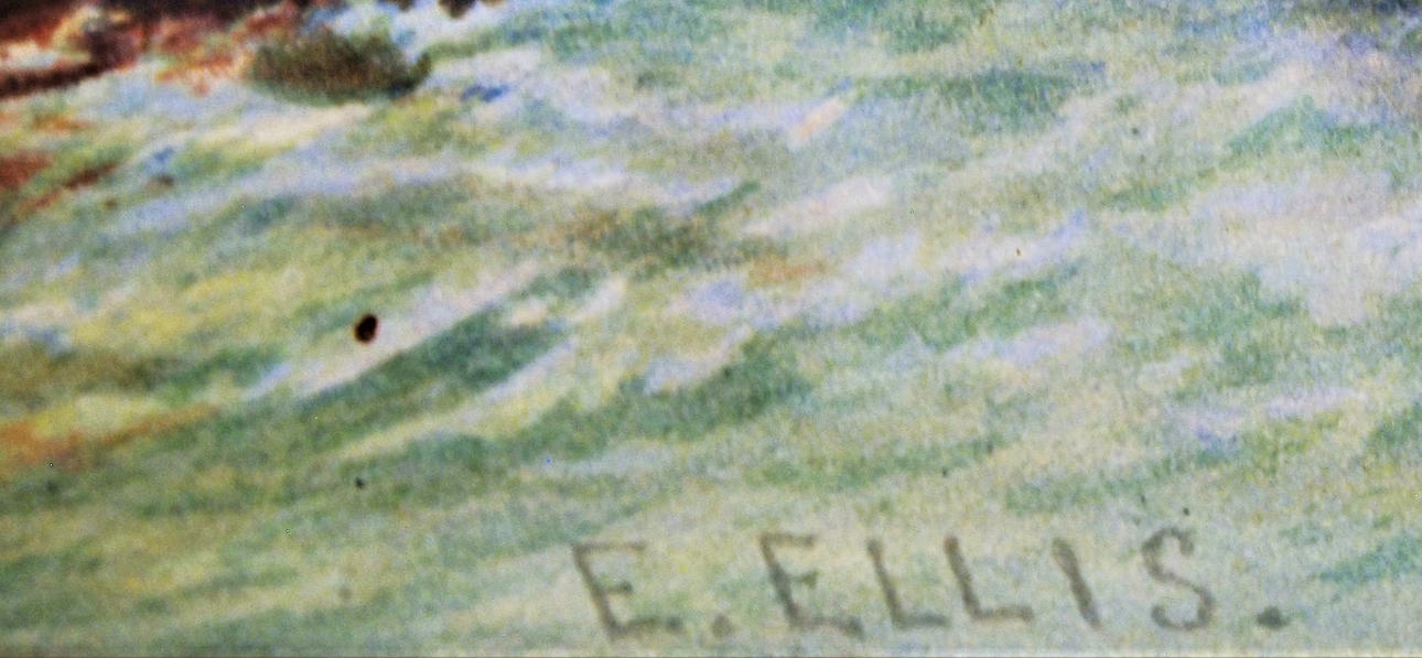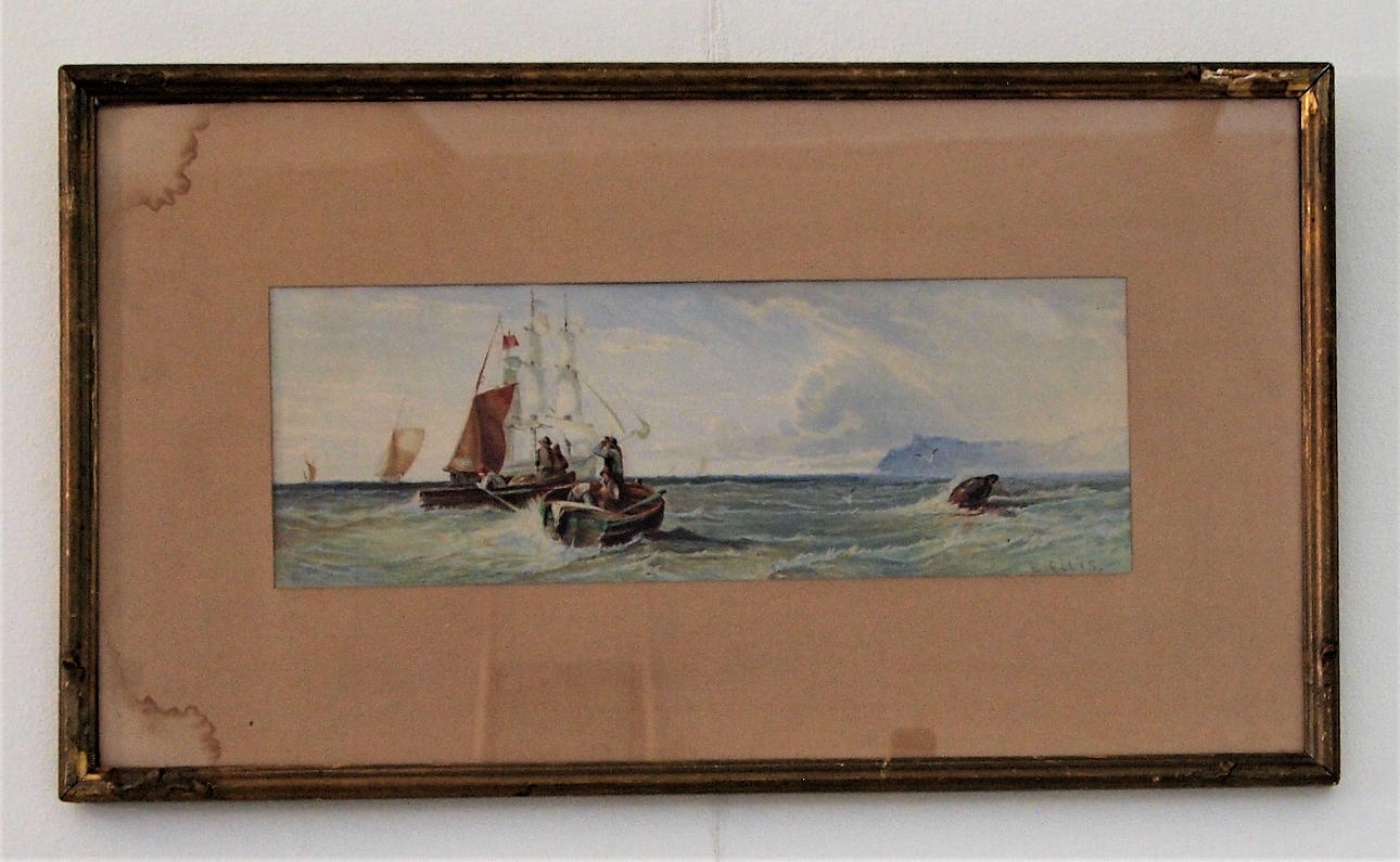 A few small dots in the motif, damp spots in the frame. Frame with damage.