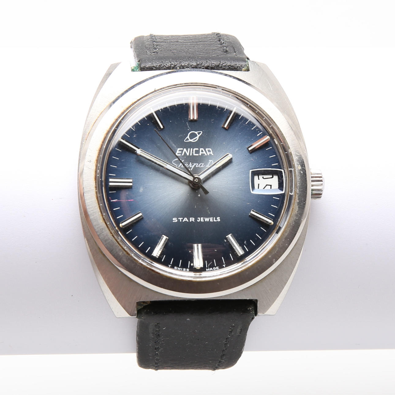 Enicar Sherpa D Star Jewels. Case in steel, dial in blue with sunburst effect, bar index and date display.