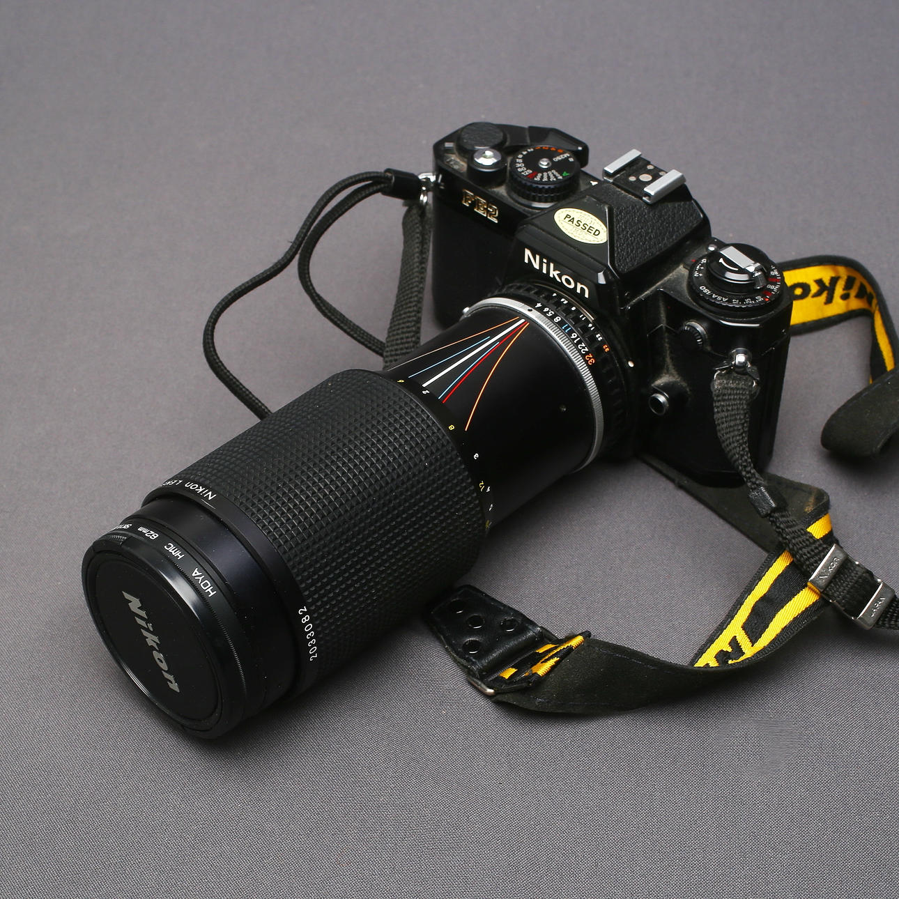 Nikon FE2 no.2104732 Lens Zoom 70-210mm f/4 Nikon Series -E no. 2033082 Lens 28mm f/2.8 Nikon Series -E no. 1950009 Lens 135mm F/2.8 Nikon Series-E no. 221097 Lens 50mm 1:1.8 Nikon Series -E no. 1948395 Lens 17mm 1:3.5 Ø67 RMC Tokina No. 8108713 Lens, 52mm Ultra Wide Macro Conversion, Rokina Series VII Nikon EM No. 7266252 4 lenses with original boxes 2 color filter lenses included.