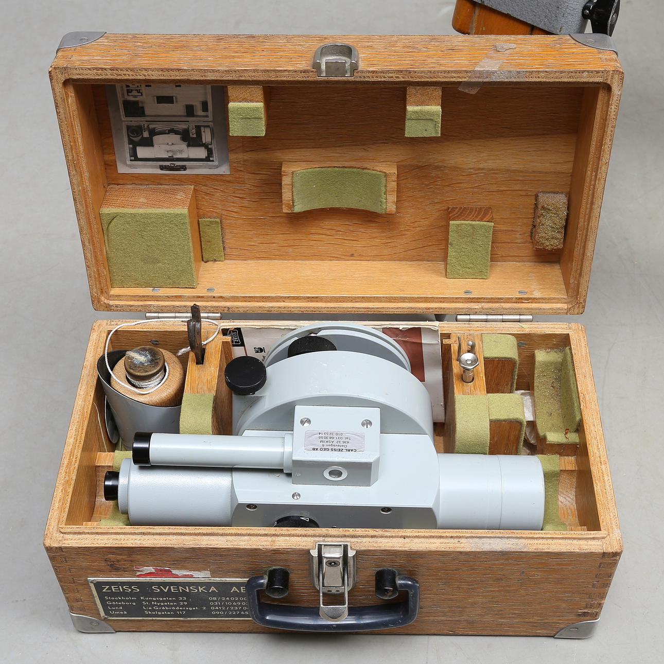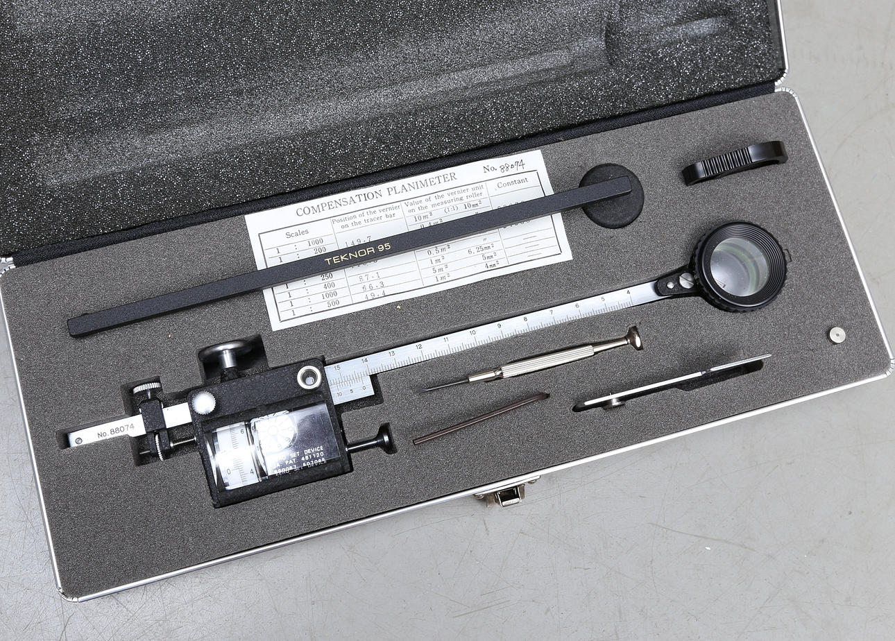 Consisting of: Carl Zeiss Nivillier 2 no. 49534, Compensating Polar Planimeter no. 88074, Jena Ni 025 no. 212342, Fr.J Berg wooden case with instrument, Measuring stick Hultafors Sweden, Stand (tripod), height of the stand when folded approx. 106 cm.