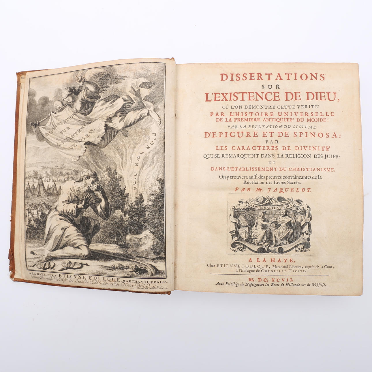 Jaquelot, Isaac. Dissertations Sur L'Existence De Dieu, Ou L'On Demontre Cette Verite Par L'Histoire Universelle De La Premiere Antiquite Du Monde: Par la refutation du systeme d'Epicure et de Spinosa par les caracteres de divinité.... Chez Etienne Fouloque , A La Haye, 1697. 4:oi a near contemporary leather binding. Engraved front stove and engraved vignette on title page. Front. , (XL), 705 p.