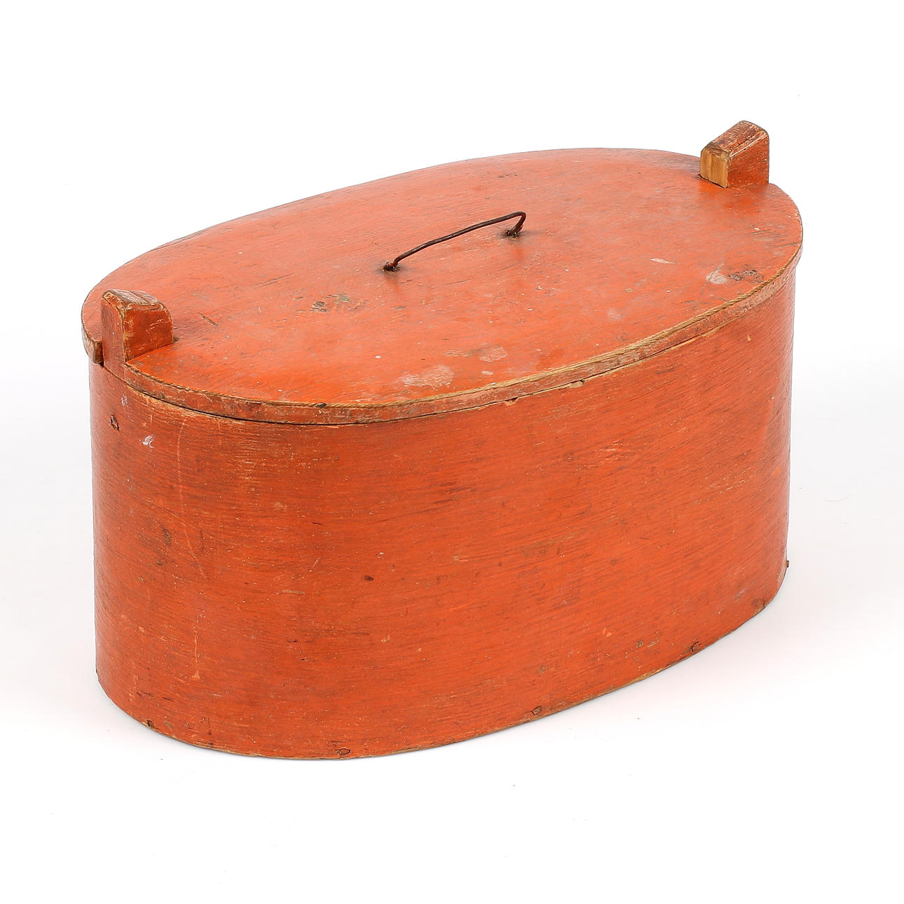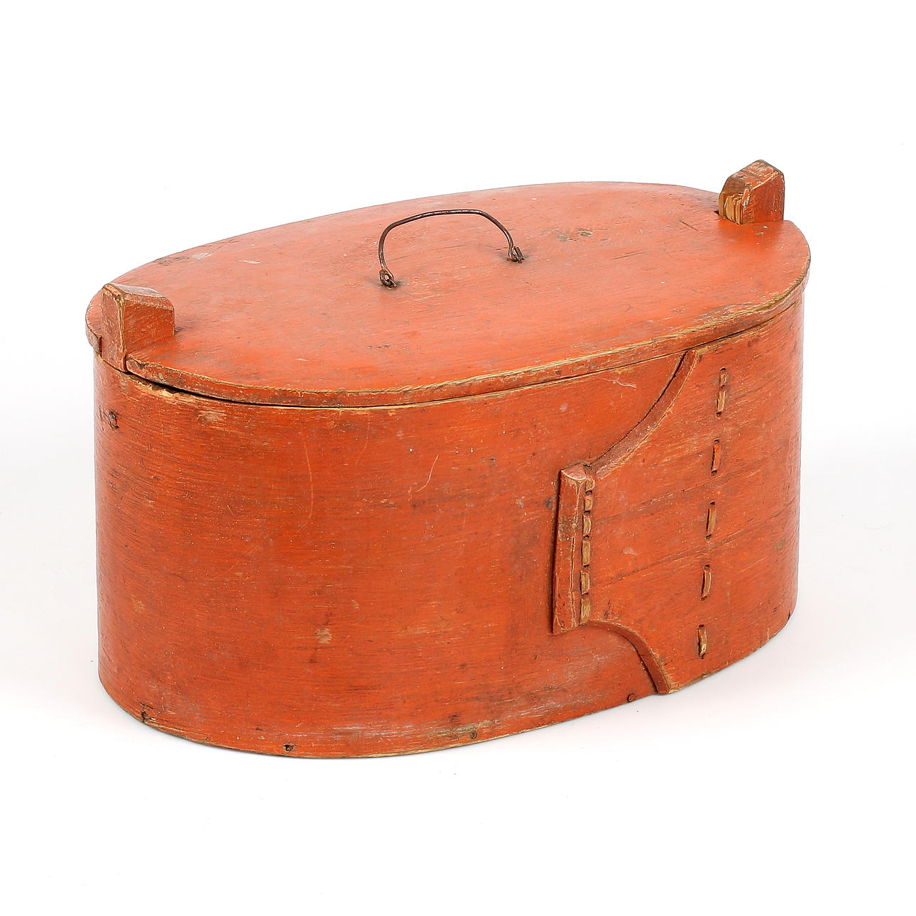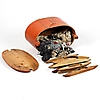 Sweep basket in painted wood. 9 shuttles and yarn. Length 34, width 21, height 19 cm.