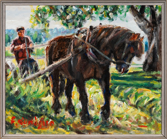 897305. ACKE ÅSLUND. Horse motif "Motif from Väsby", oil on Board, signed and dated 1955.