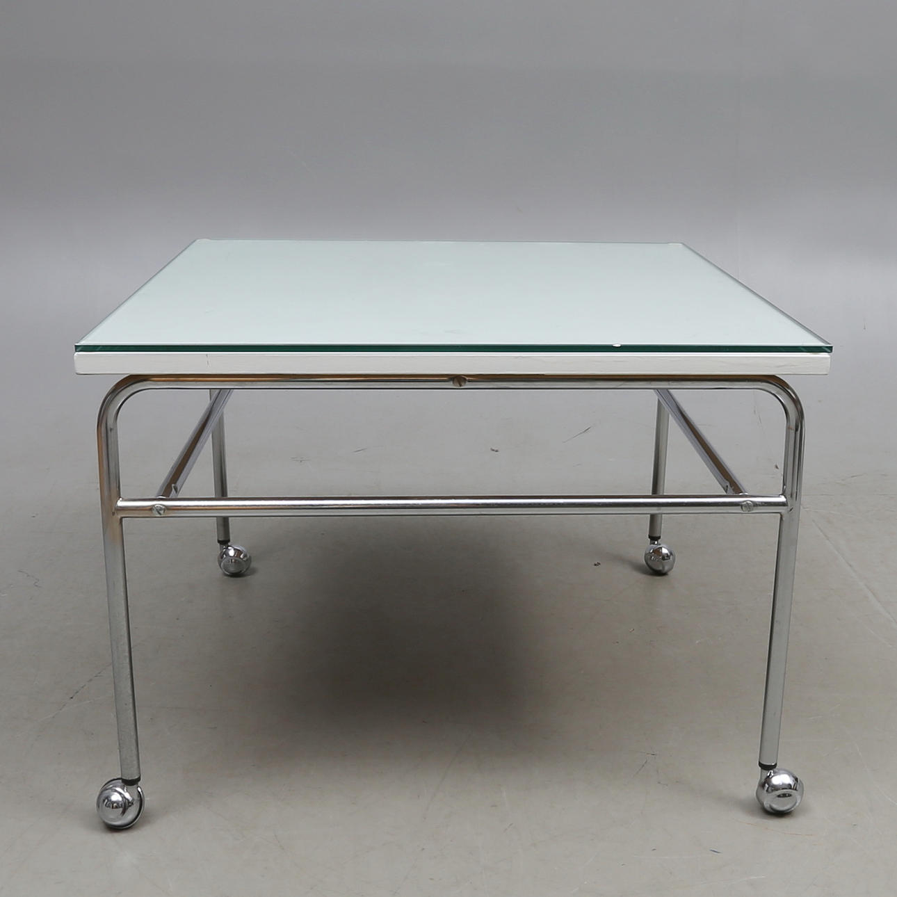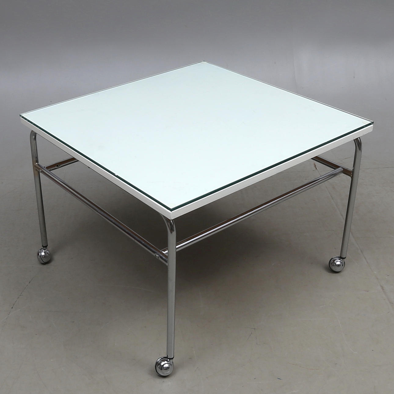 With glass top. 70 x 70 x 49 cm.