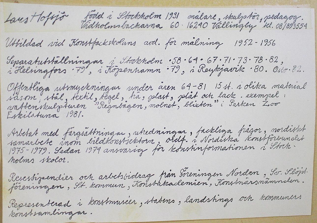 Image size 32x46 cm Lars Erik Torbjörn Hofsjö, born December 22, 1931 in Stockholm, died July 22, 2011, was a Swedish artist - painter and sculptor. He lived in Hässelby with a studio in Blackeberg until his death. He participated in many collective and theme exhibitions, including Stockholm, Copenhagen, Oslo, Helsinki and Reykjavik.
