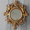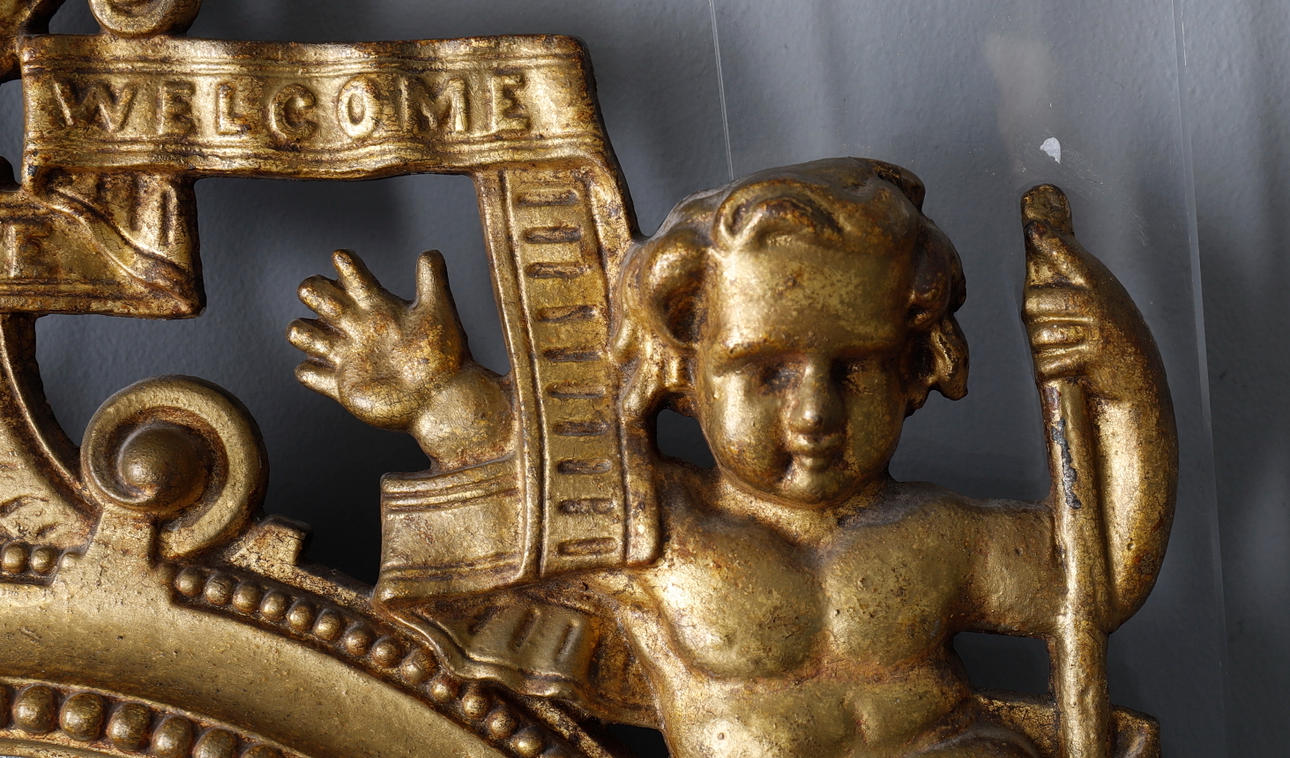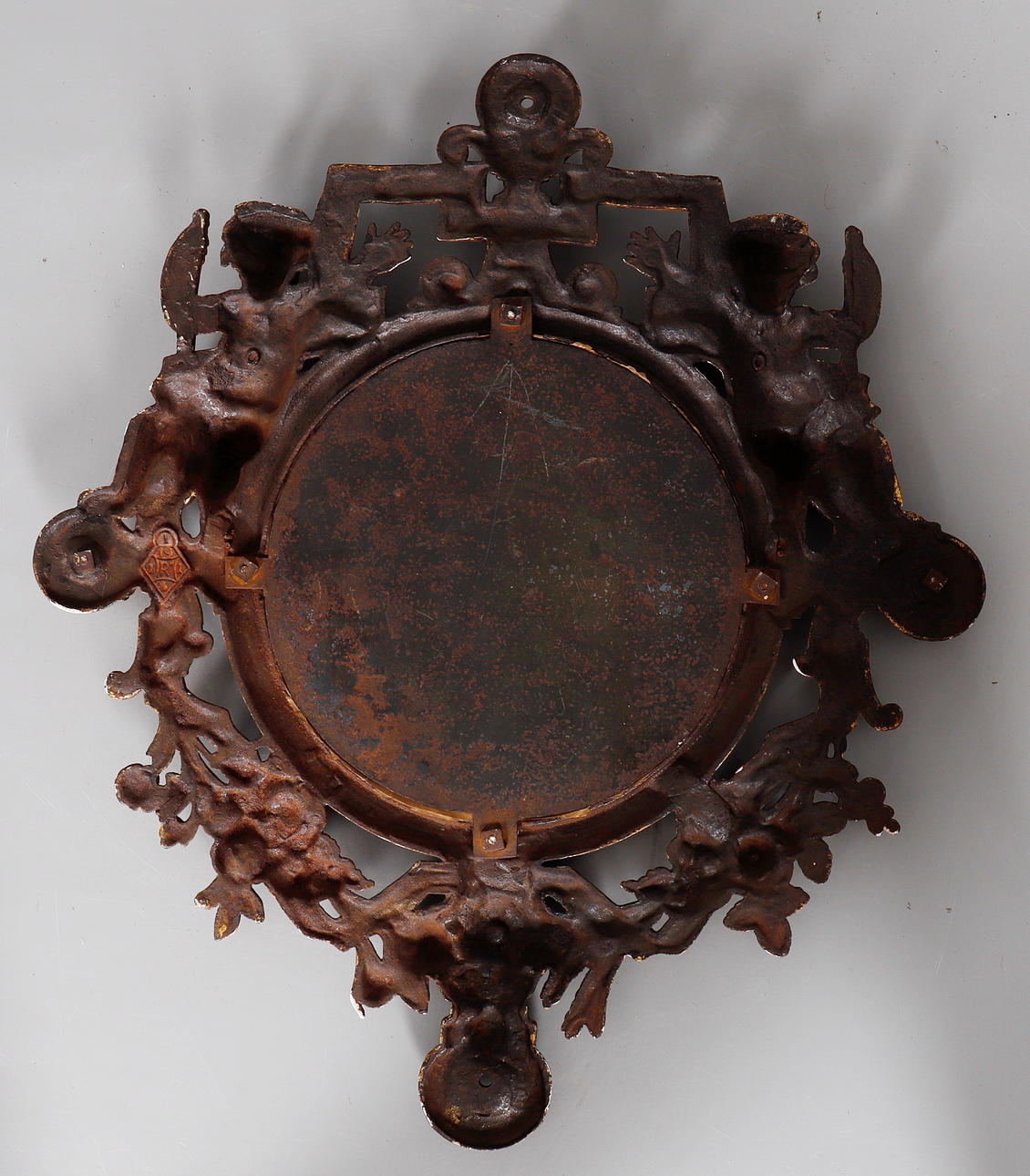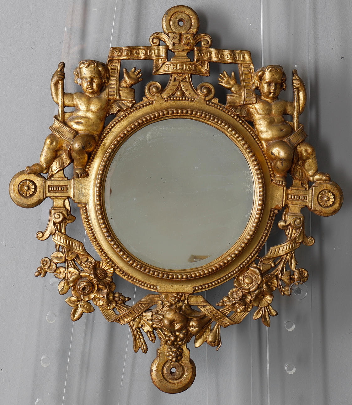 With cherubs and banners reading Welcome Welcome Thrice, with registration lozenge to rear, the frame 63 cm high, 54 cm wide the mirror 24 cm diameter.