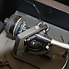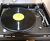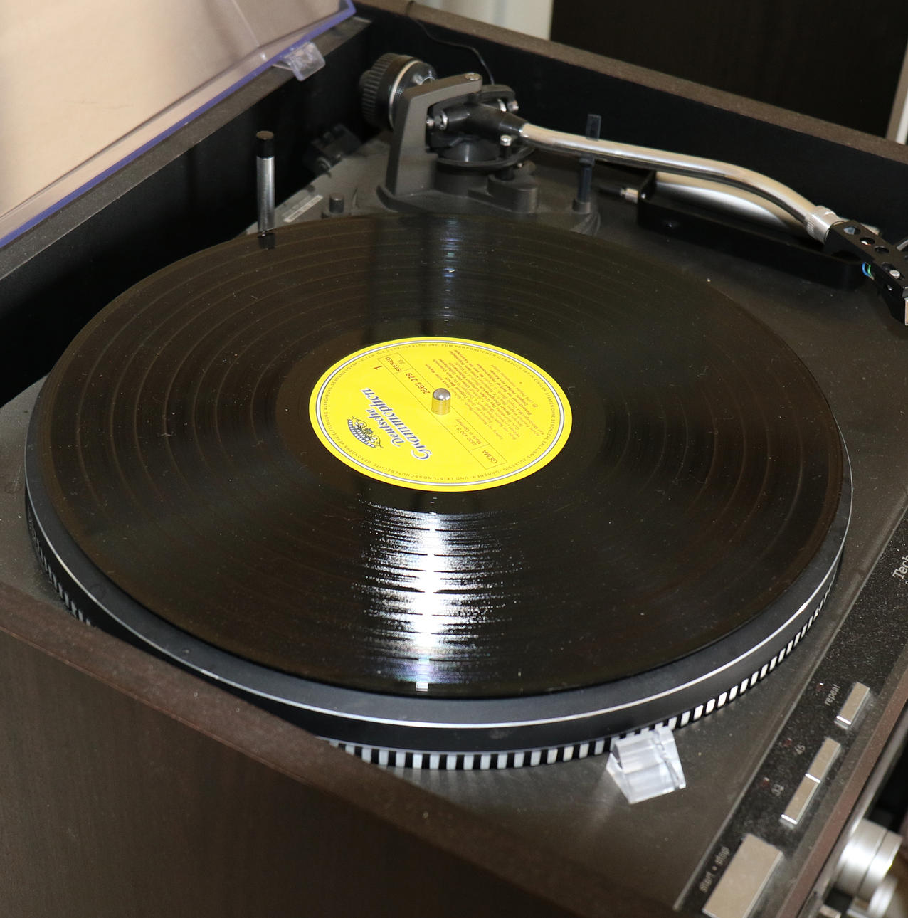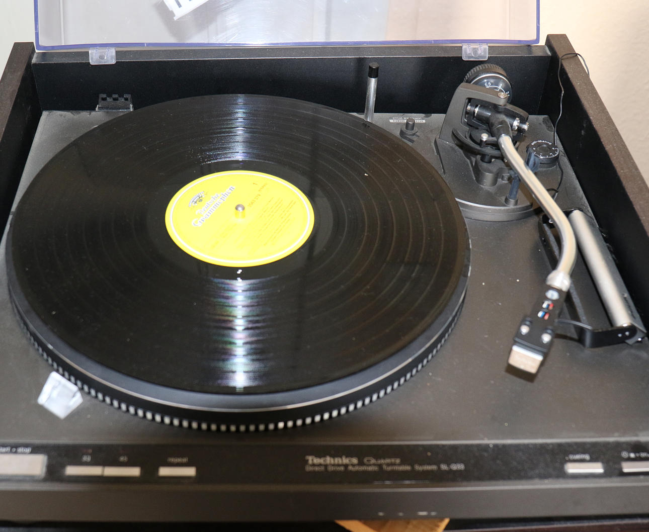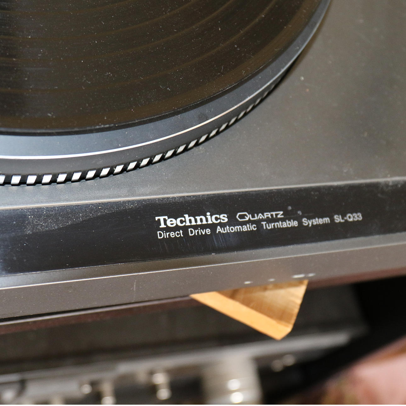 Gramophone: Technics Quartz SL-Q33 Stereo bench on four wheels, with glass door included. Dimensions 85 x 47 x 41 cm. NOTE! The hood of the gramophone sticks up above.
