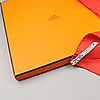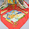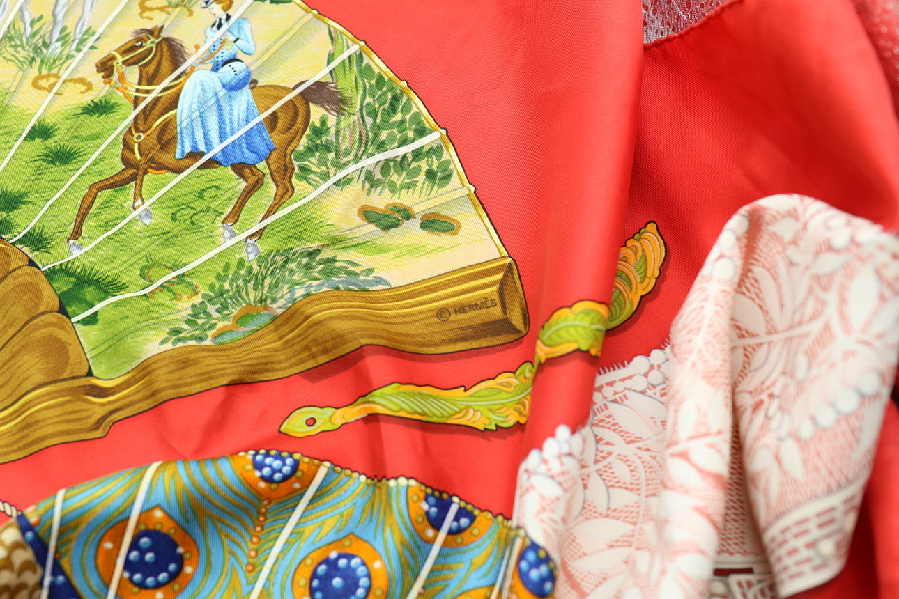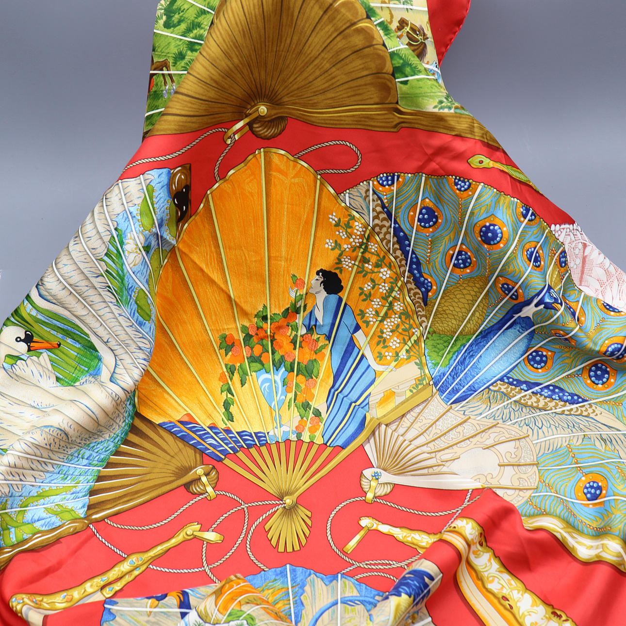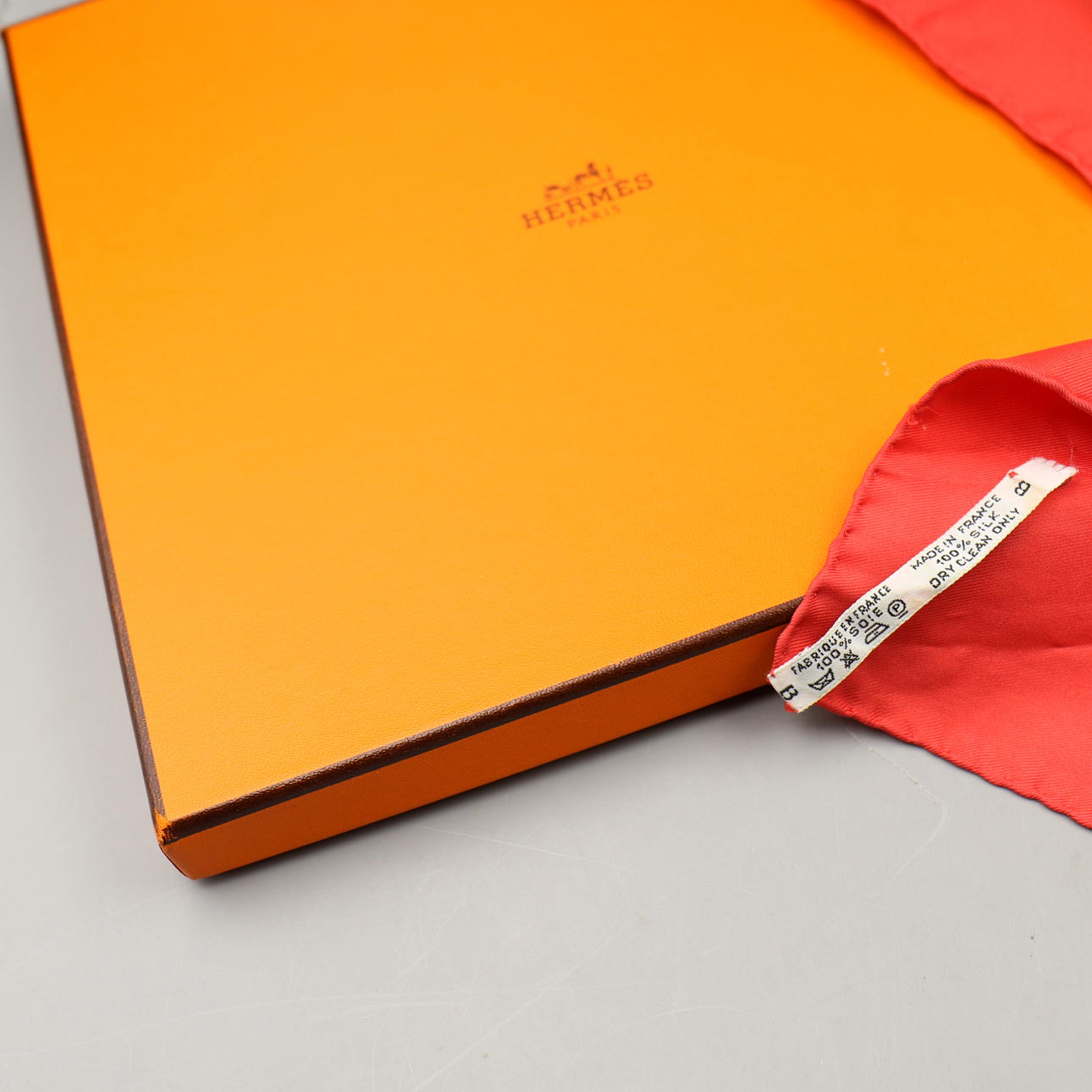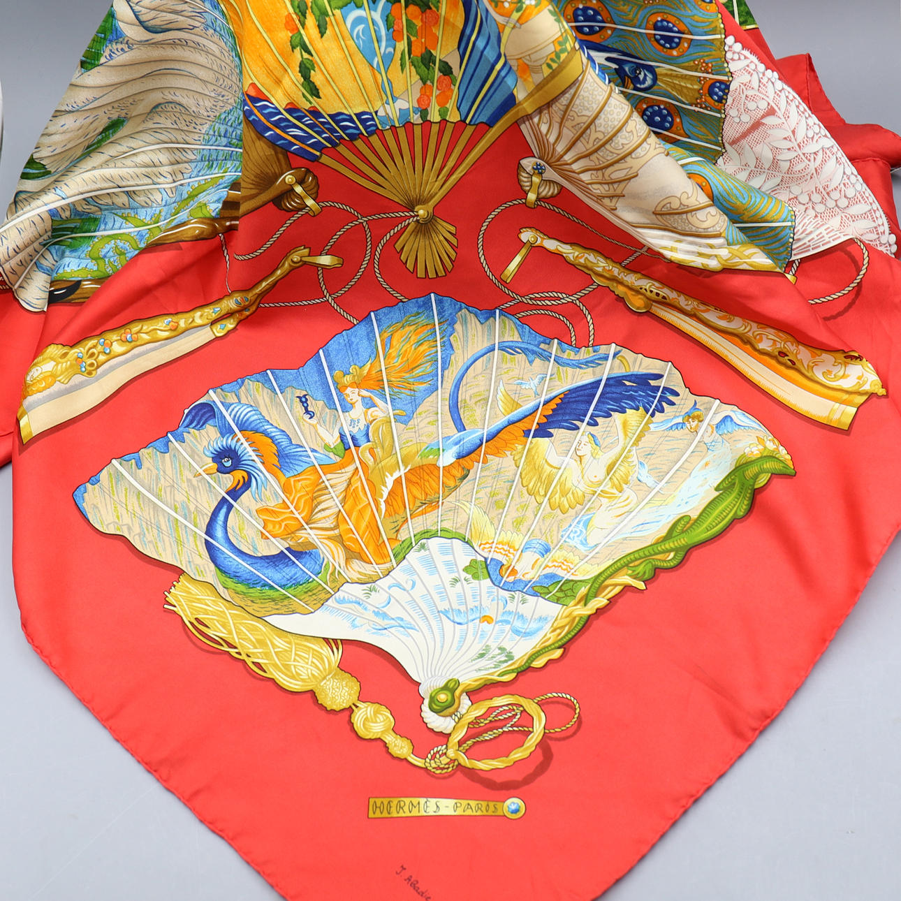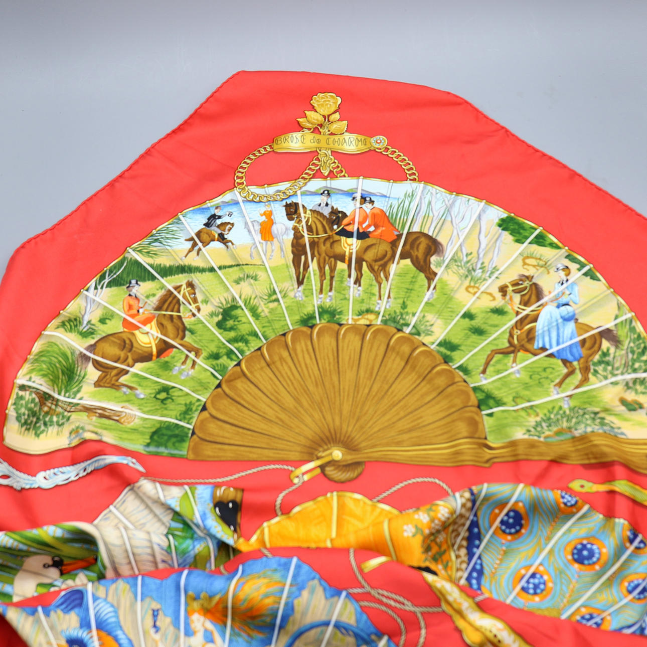Designed by Julia Abadie for Hermès in 1991, foulard silk, red ground, 90 x 90 cm.
