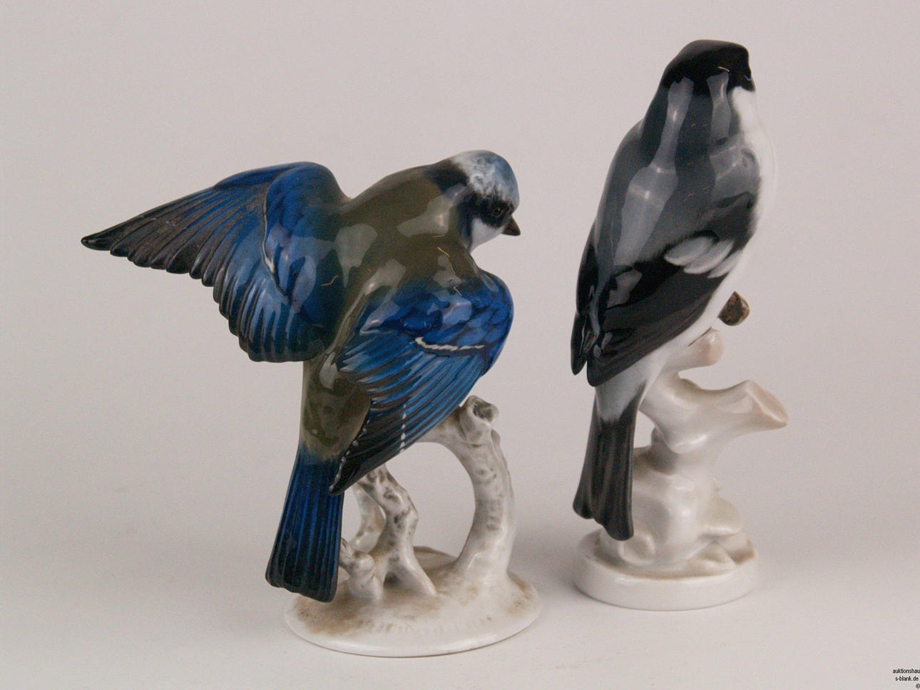 Two Rosenthal birds - porcelain, glazed, naturalistically painted, 1x blue tit sitting on a branch, design by Fritz Heidenreich (1895-1966) H.ca.11.5cm/ 1x bullfinch sitting on a branch base with a round plinth, design by August Wunderlich, H. about 14cm.