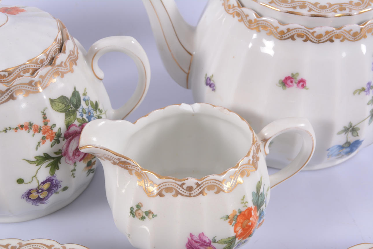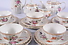 12 plates 12 saucers 9 teacups a milk jug a cream jug a teapot a sugar bowl.