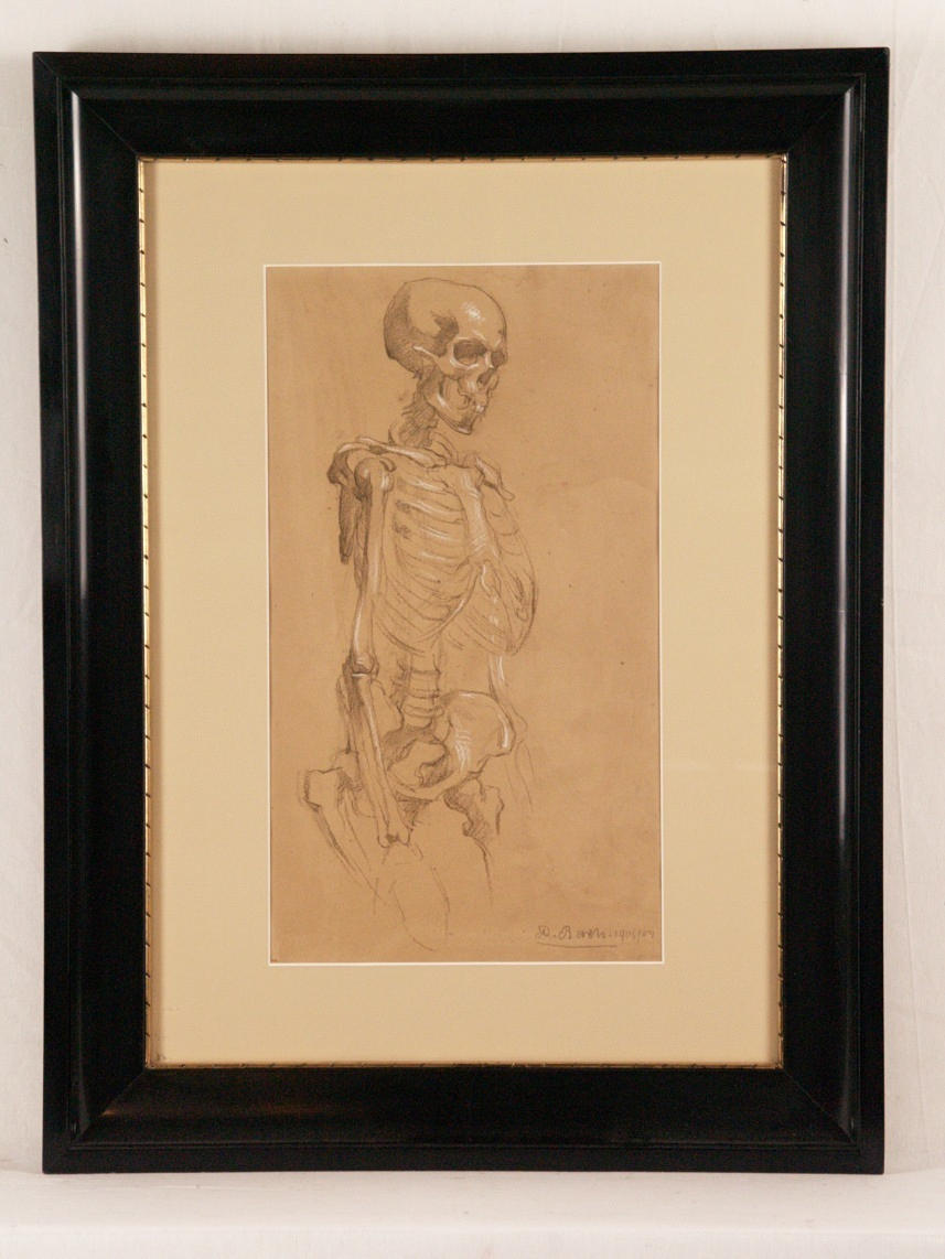 Bach, Andreas (1886 Nuremberg - 1963 ibid.) - "Memento Mori - Skeleton Study", 1906/07, black charcoal on brown paper, heightened with white, signed and dated A. Bach lower right. 1906/07, framed with PP under glass, PP section: approx. 41 x 24 cm, black frame bar approx. 65.5 x 49 cm, -German painter, apprenticeship as a lithographer, 1901-1907 attended evening courses at the Nuremberg School of Applied Arts with Heinrich Heim , 1909-1914 studied at the AdbK Munich with Angelo Jank and Heinrich Zügel.