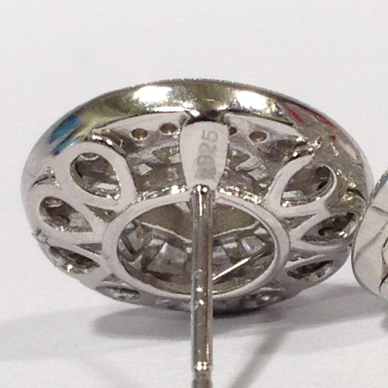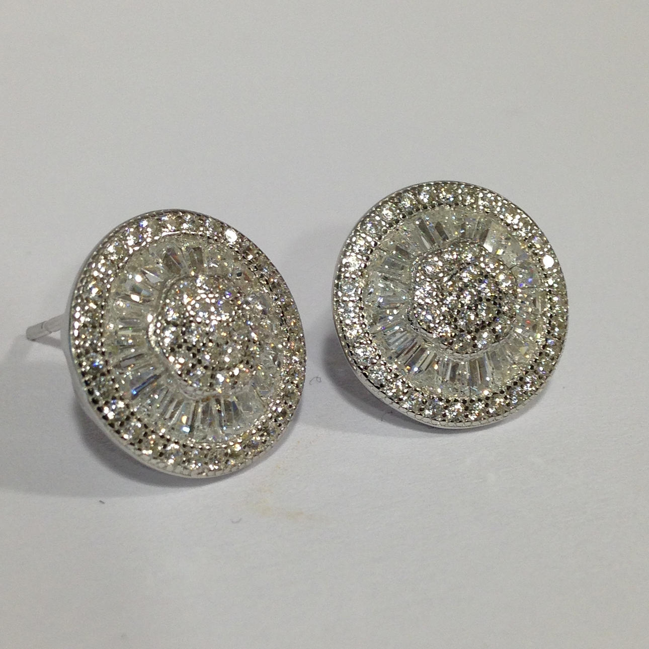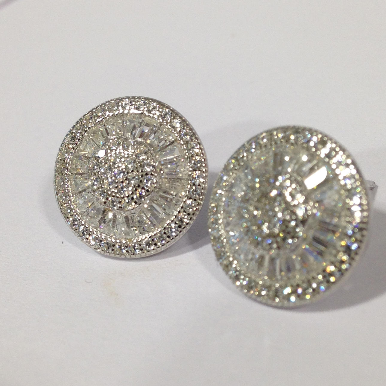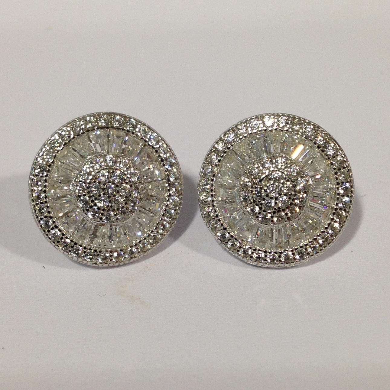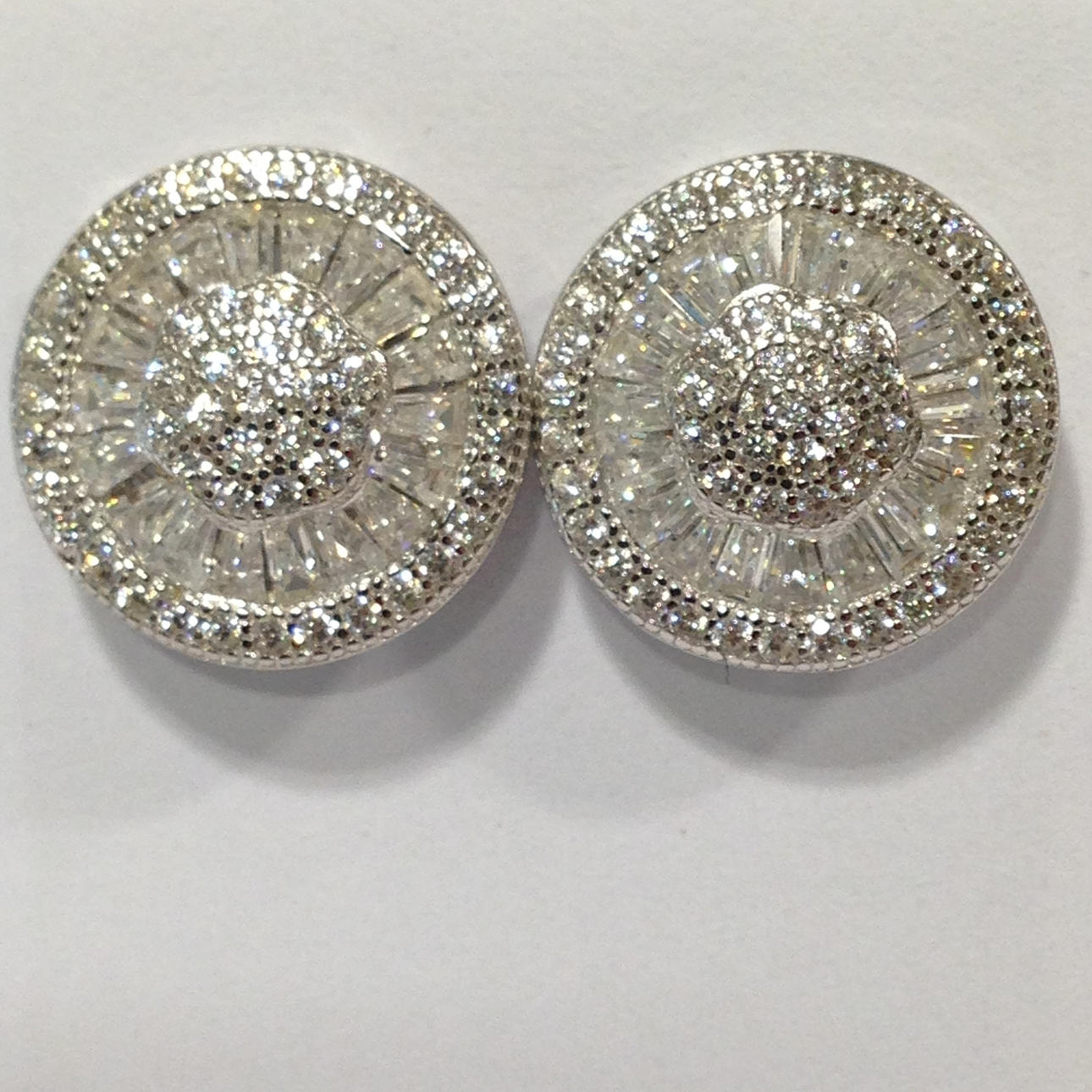 These studs are set with a central cluster of white round brilliant cut cubic zirconia stones which are surrounded by a halo of white tapered baguette cubic zirconia stones. A further halo of white round brilliant cubic zirconia stones are set around the baguette halo