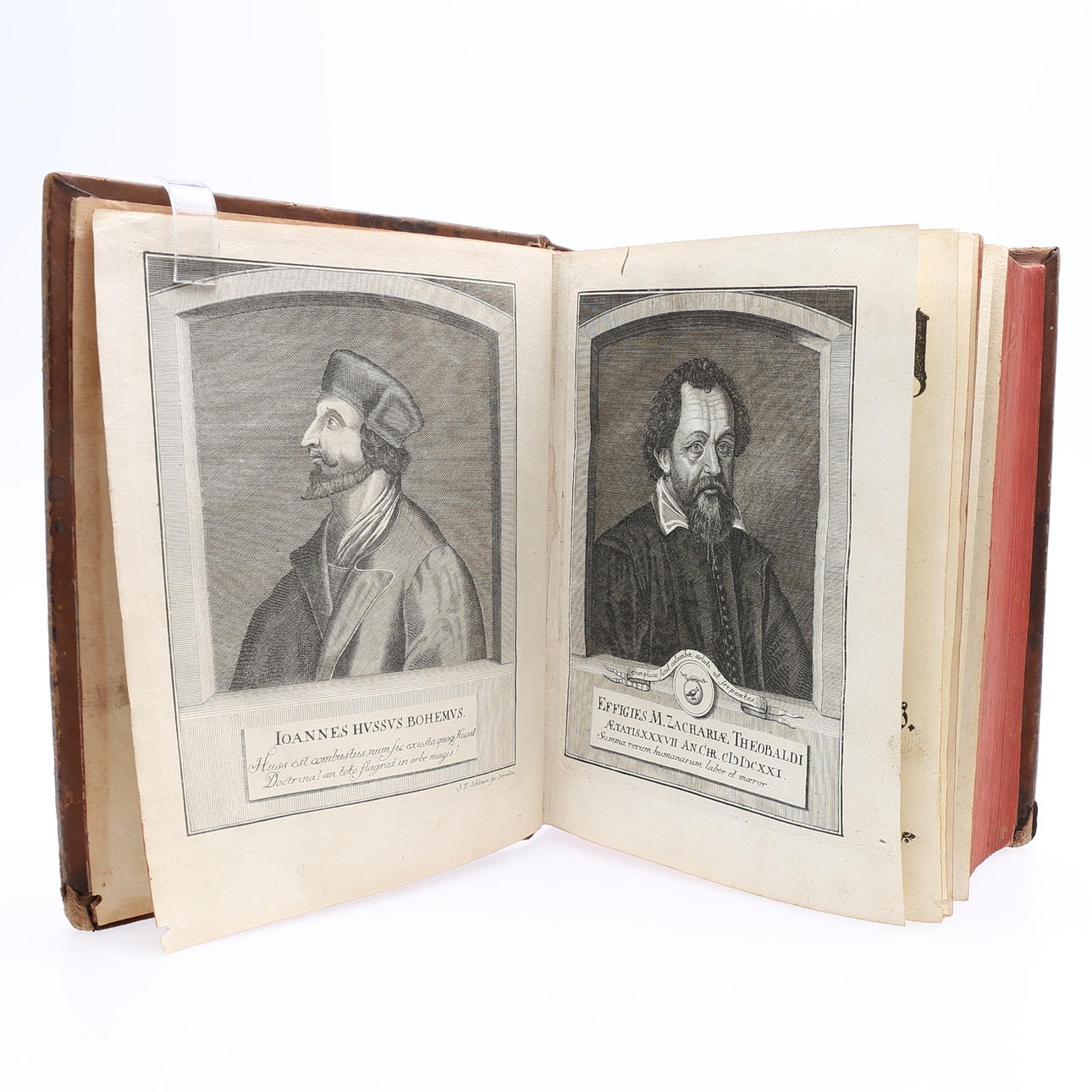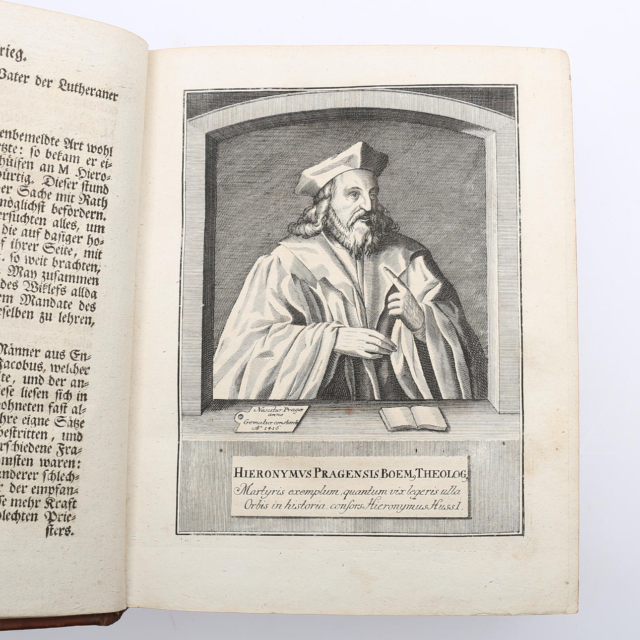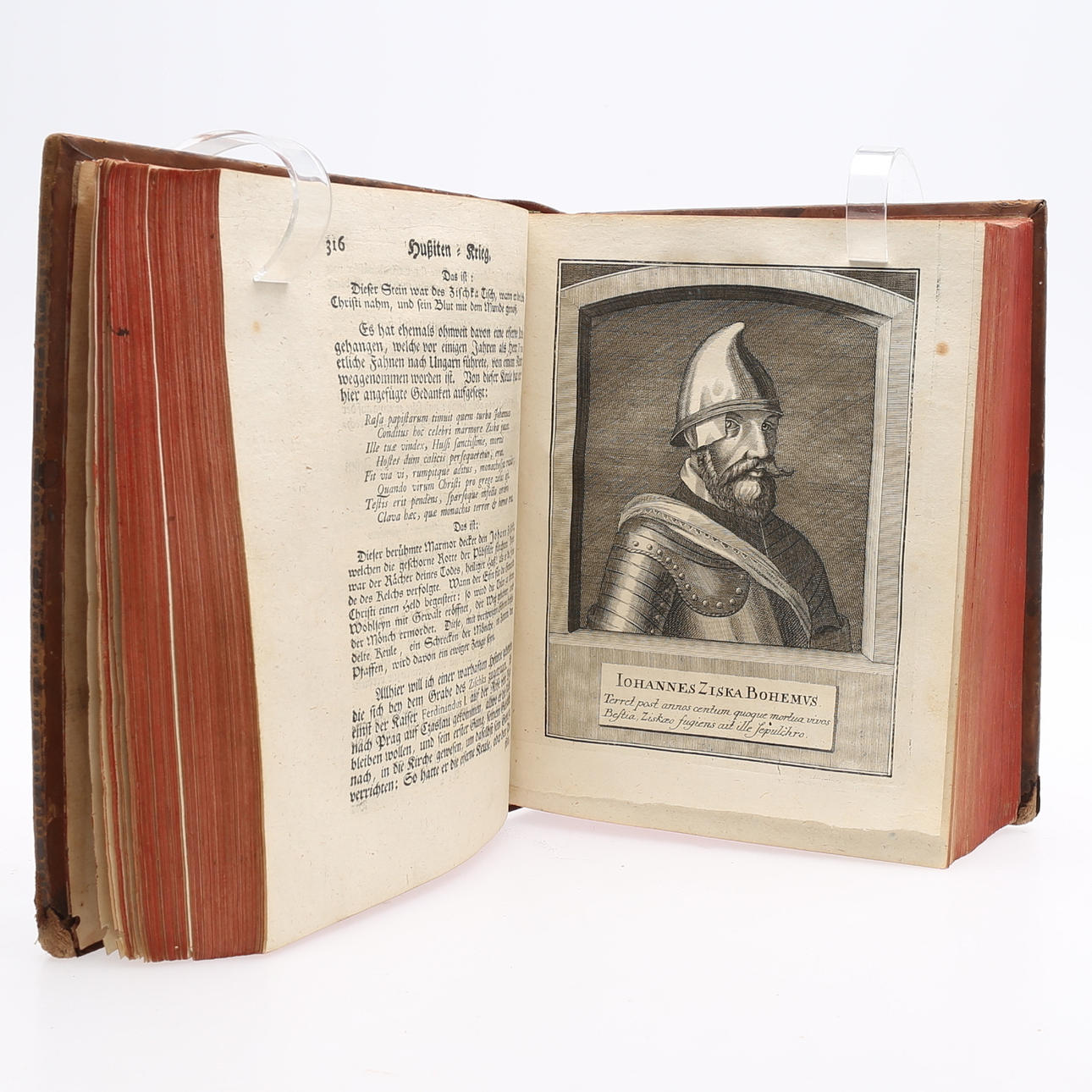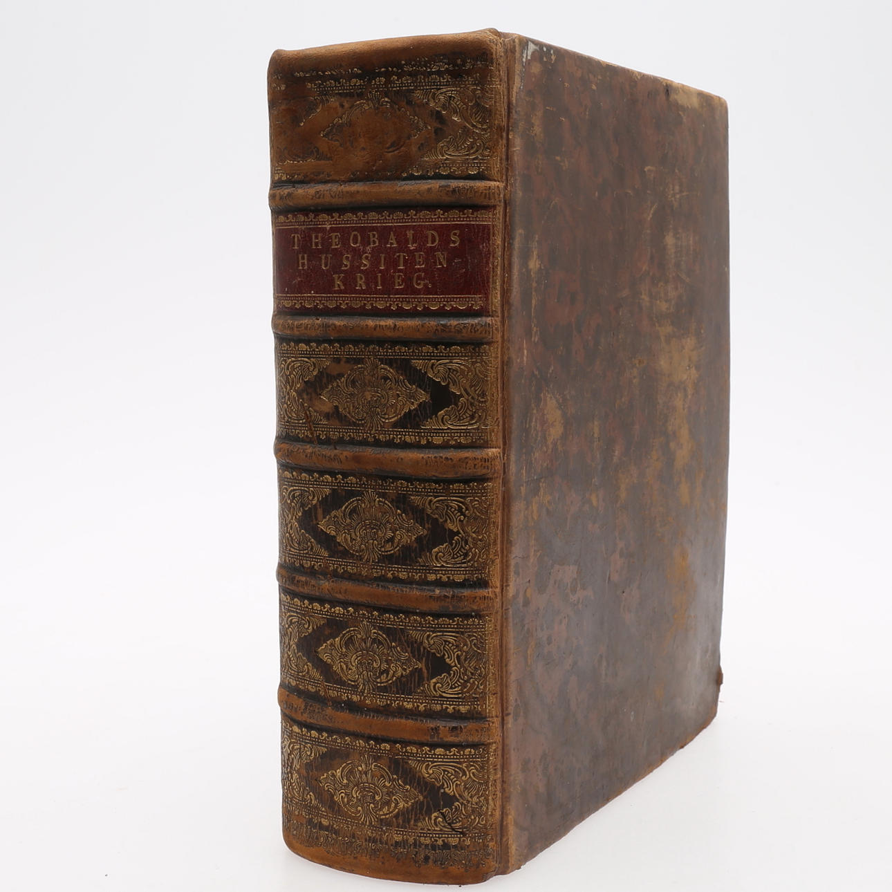 Zacharias, Tehobald. Hussitenkrieg oder Geschichte des Lebens und der Lehre Joh. Hussen (I-III) nebst einem Anhange des Römischen Glaubensbekenntnisses. Mit einer Vorrede Siegmund Jacob Baumgartens. Bound with Confessio Bohemica Evangelica, Das ist Böhmische Confession etc... Four parts in one volume. Johann Jacob Korn, Breslau, 1750. The last work was published in 1749 and contains an expandable table. 4:oi a contemporary leather binding with rich gilt spine decoration and red title label with gilt text as well as red cuts and and marbled inner endpaper. Hussitenkrieg is illustrated with 5 full-page copperplate portraits. (X), 439 p. , (I) blank + 320 p. + 232 p. , (XXXII) + (VI), 119 p.