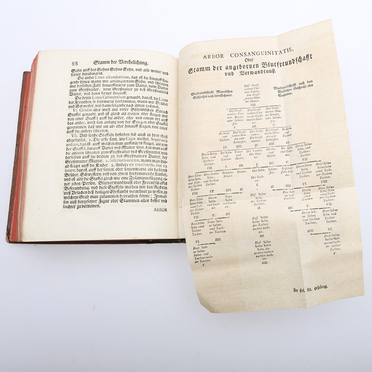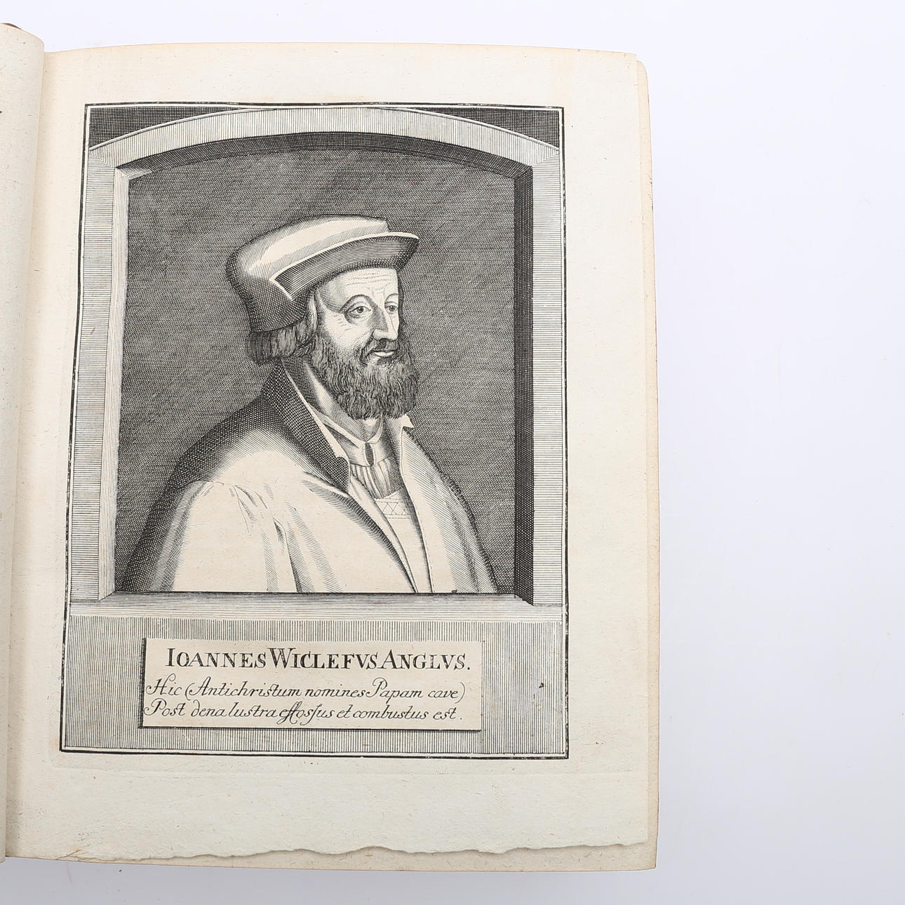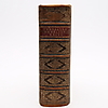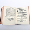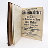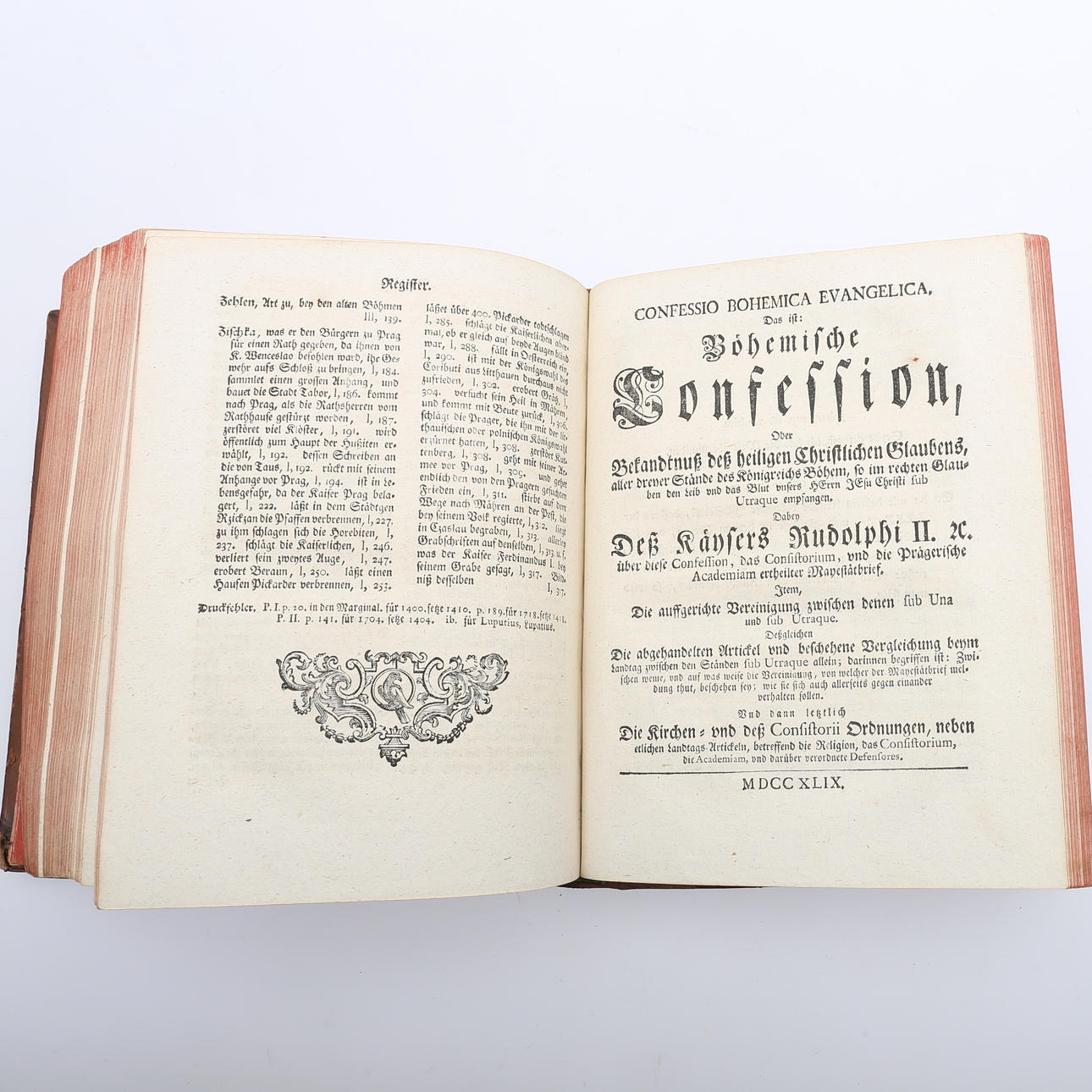 Zacharias, Tehobald. Hussitenkrieg oder Geschichte des Lebens und der Lehre Joh. Hussen (I-III) nebst einem Anhange des Römischen Glaubensbekenntnisses. Mit einer Vorrede Siegmund Jacob Baumgartens. Bound with Confessio Bohemica Evangelica, Das ist Böhmische Confession etc... Four parts in one volume. Johann Jacob Korn, Breslau, 1750. The last work was published in 1749 and contains an expandable table. 4:oi a contemporary leather binding with rich gilt spine decoration and red title label with gilt text as well as red cuts and and marbled inner endpaper. Hussitenkrieg is illustrated with 5 full-page copperplate portraits. (X), 439 p. , (I) blank + 320 p. + 232 p. , (XXXII) + (VI), 119 p.