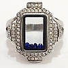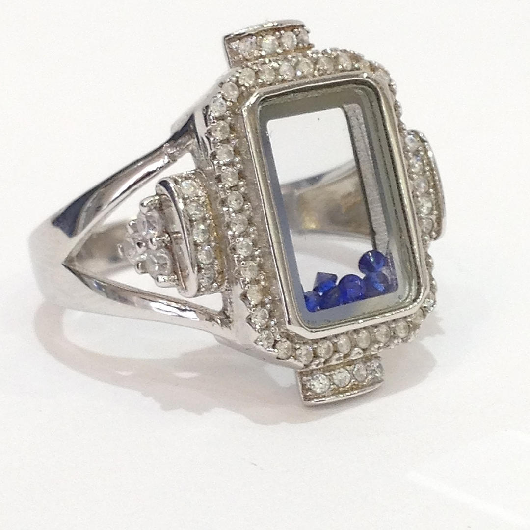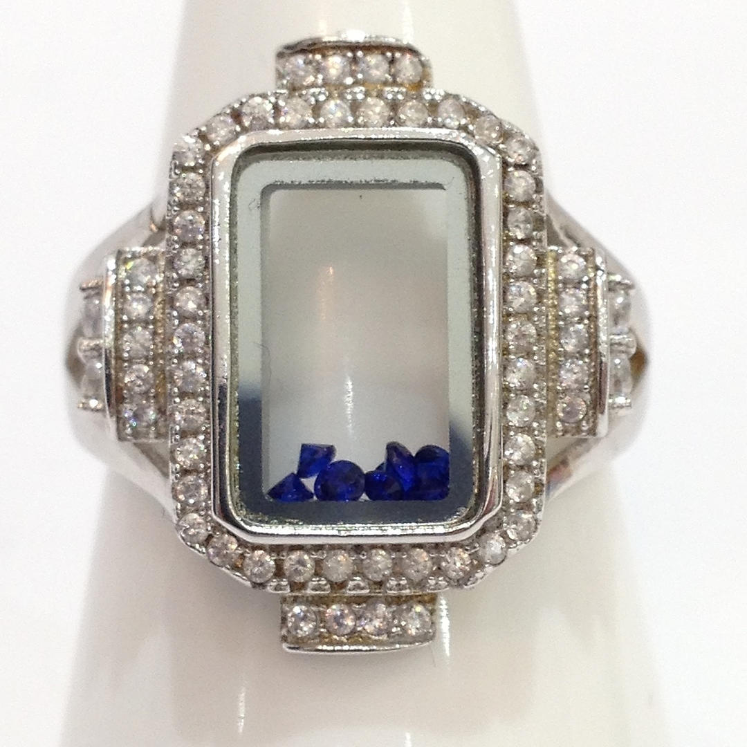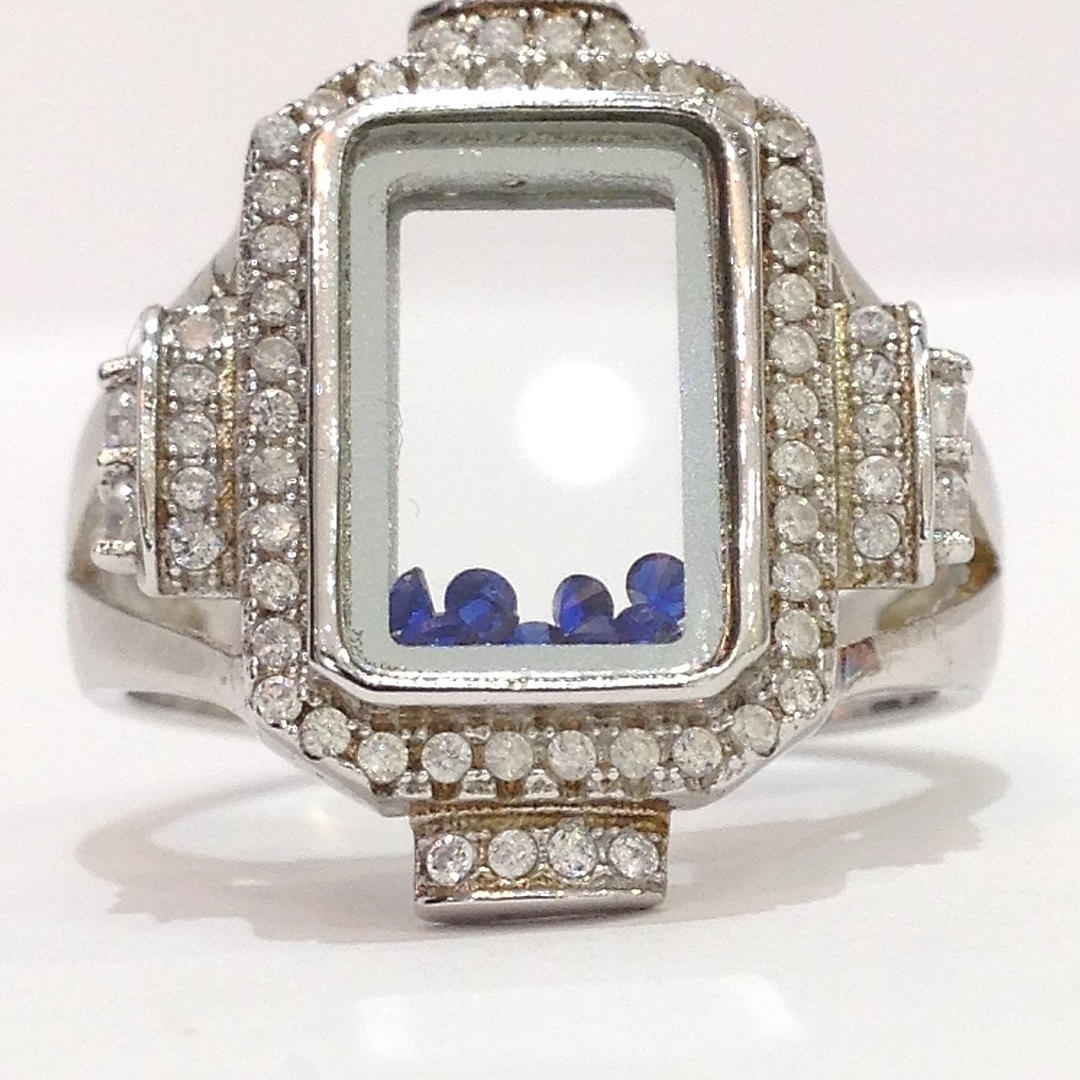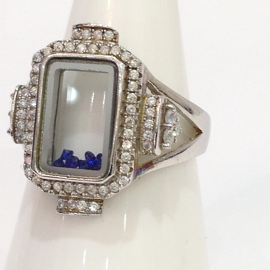 A glass panel silver ring with blue stones