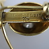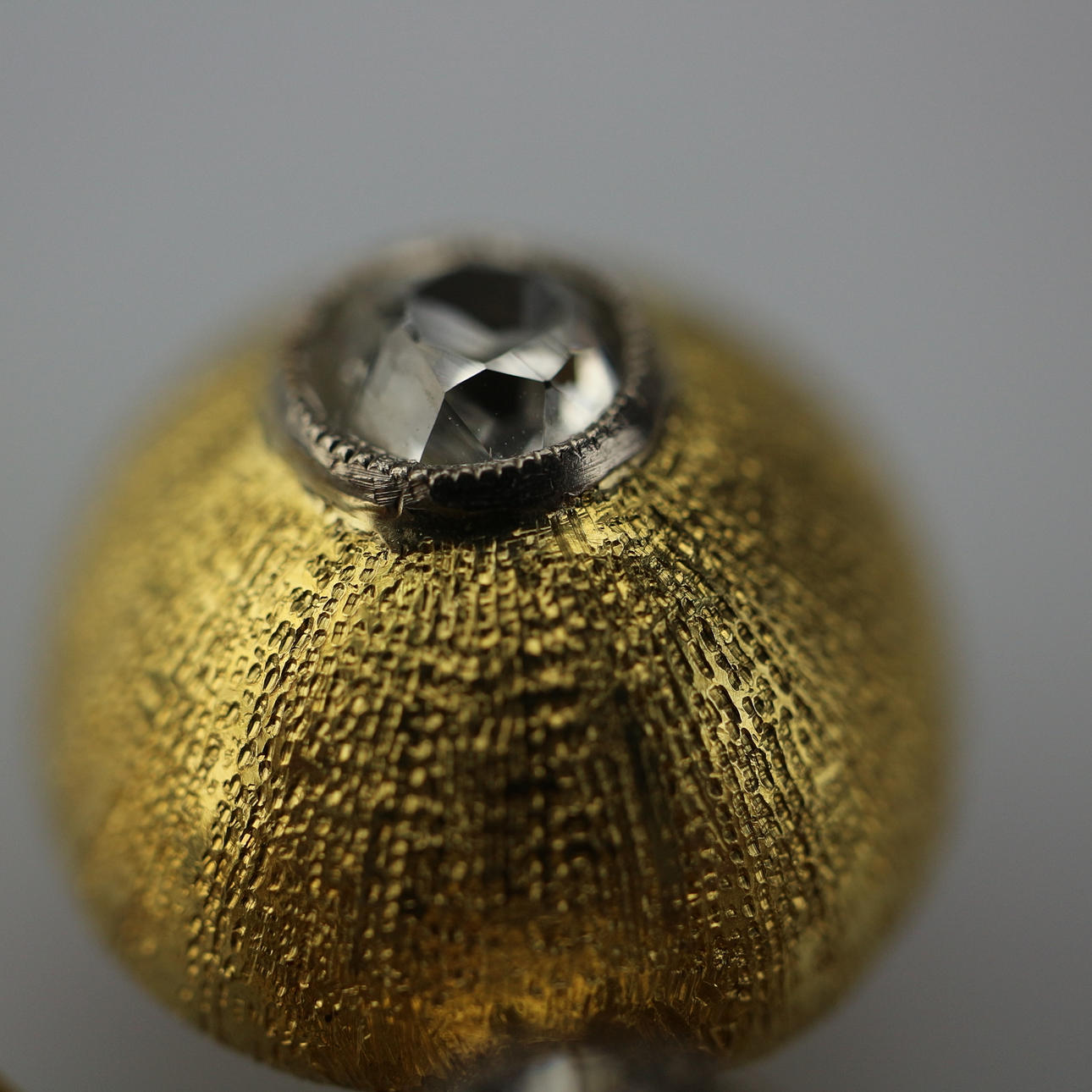 750 yellow gold with 1 old-cut diamond and 1 brilliant, together 0.600 ct, SI/HI. Needle with safety lock. Total weight 6.4 g.