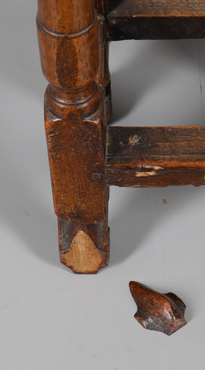 Marks, knocks and scratches consistent with age and use. One Braganza foot detached but present. Some looseness to frame joints overall.