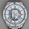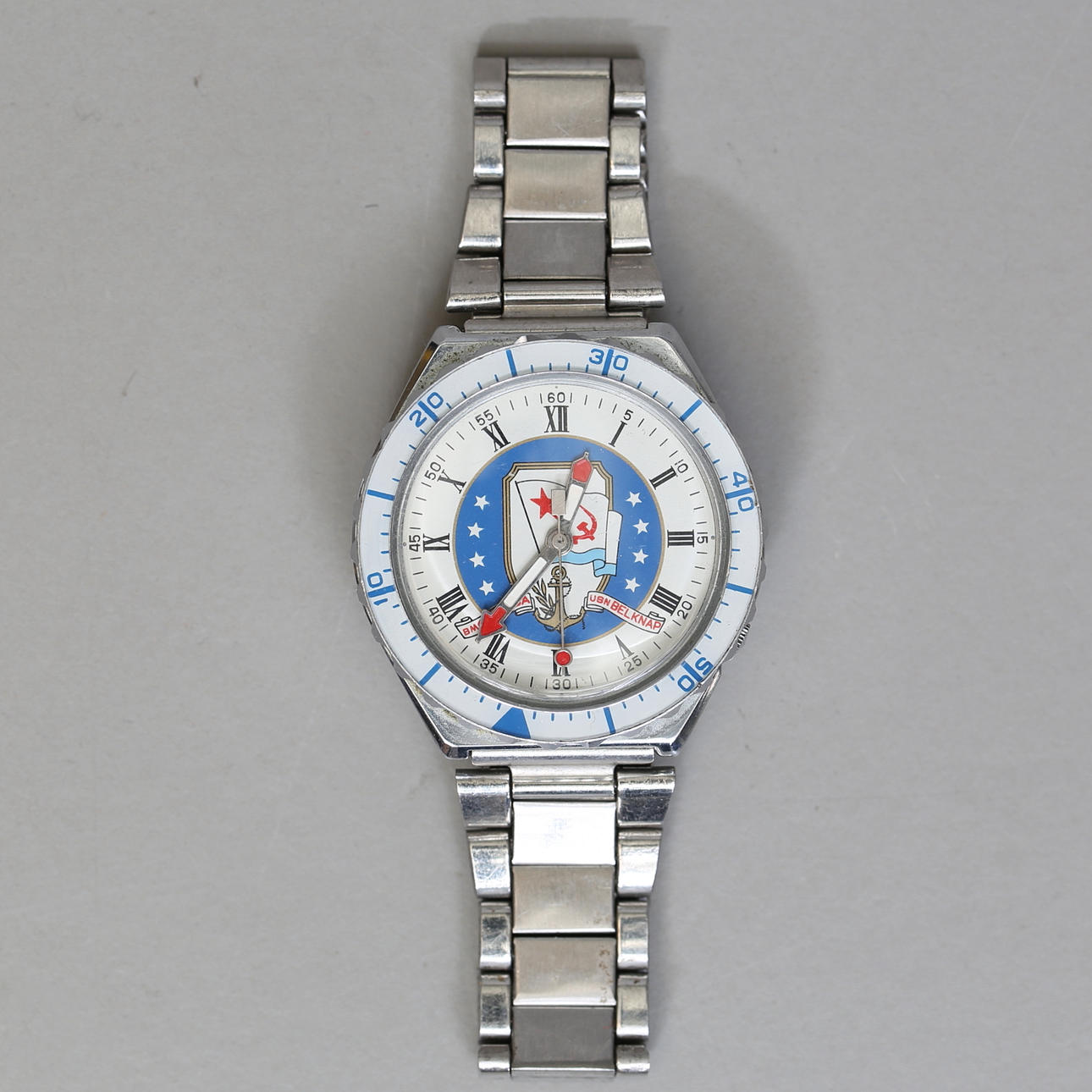 This watch was made as a symbol of peace between the Soviet Union and the United States during the Malta Summit in 1989 when both leaders (Bush Sr and Gorbachev) met. The inscription is VMF Slava (from the Soviet Navy) and USN Belknap (from the US Navy). Quartz movement Slava 3056. Central pointers. Impact protection. Organic glass. Stainless steel back. The diameter is 40 mm, the thickness is 11 mm. The watch runs well and keeps the correct time. Made in the Soviet Union (1989). Serial number 113 on the back. Very rare.
