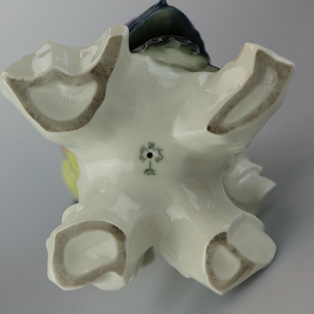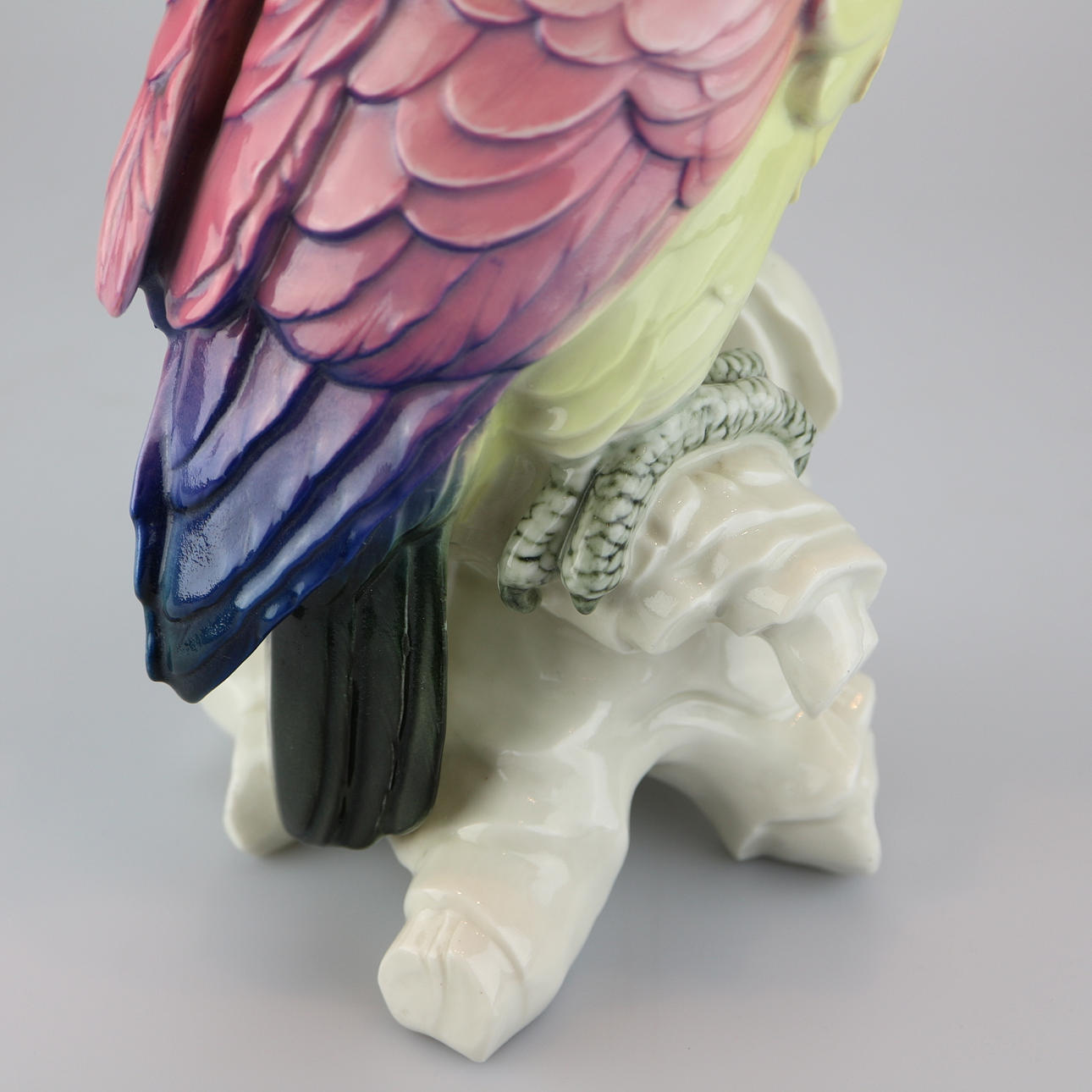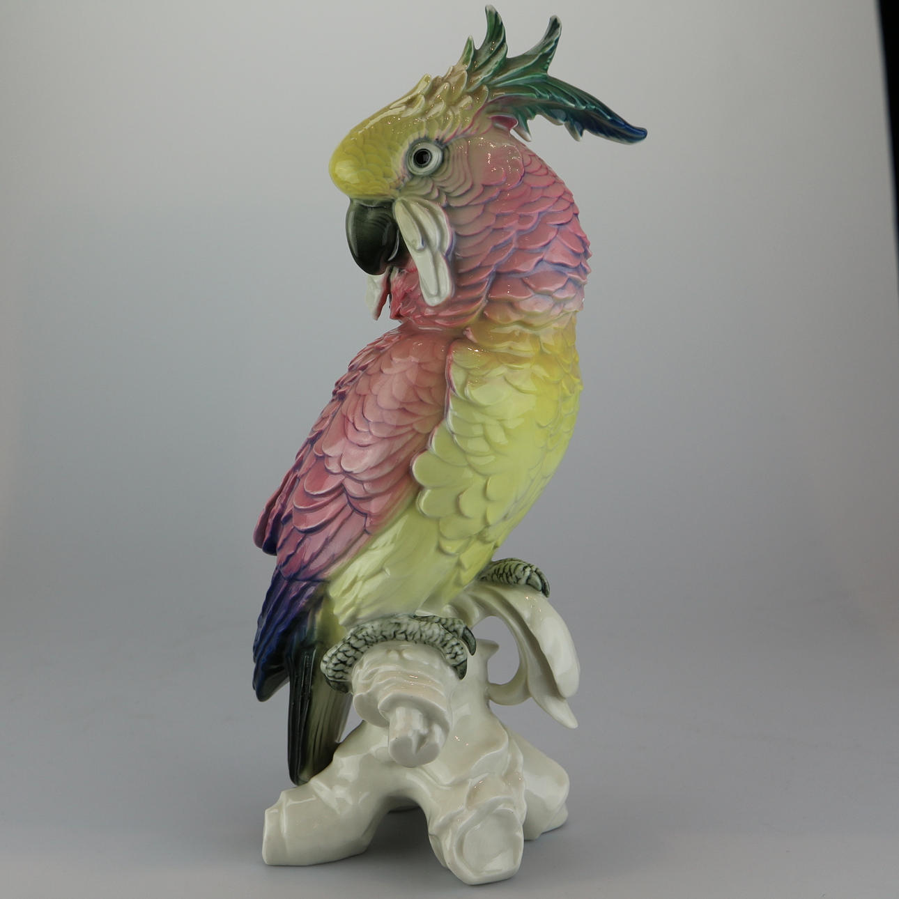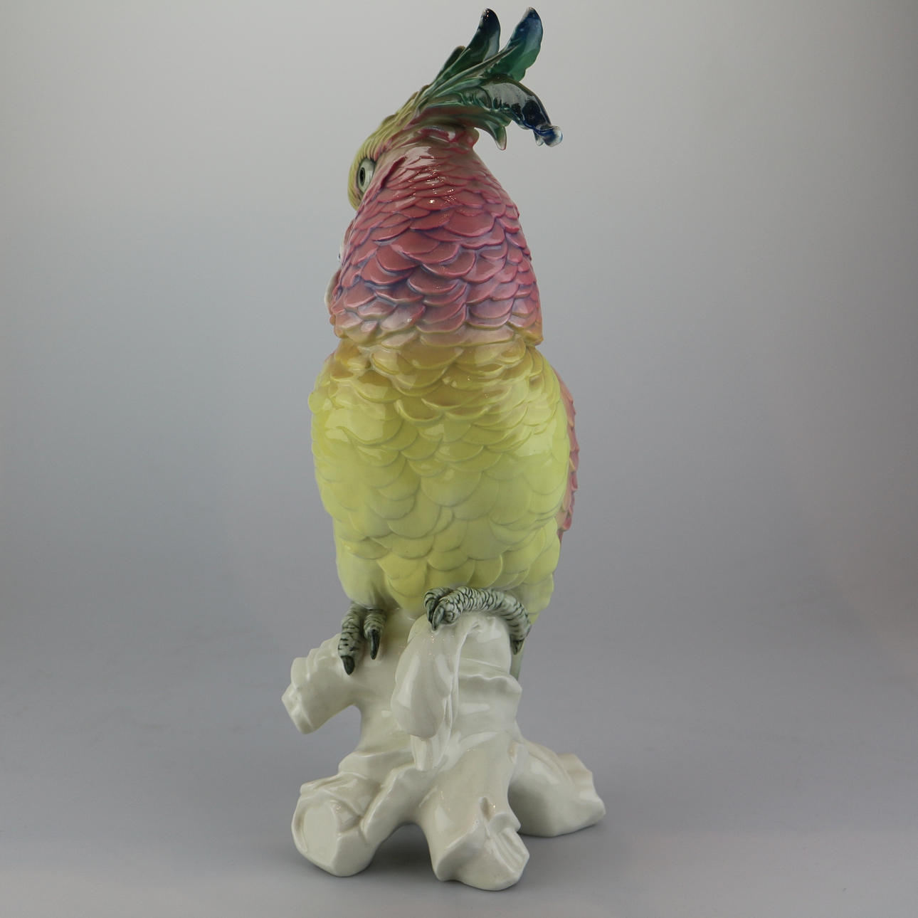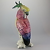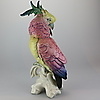 Karl Ens, Volkstedt ”Cockatoo”. Design by Anton Büschelberger around 1920, green mill stamp from 1919, scratched model number 14112, naturalistic design with polychrome underglaze painting, bird sitting on a branch base, height 38 cm.